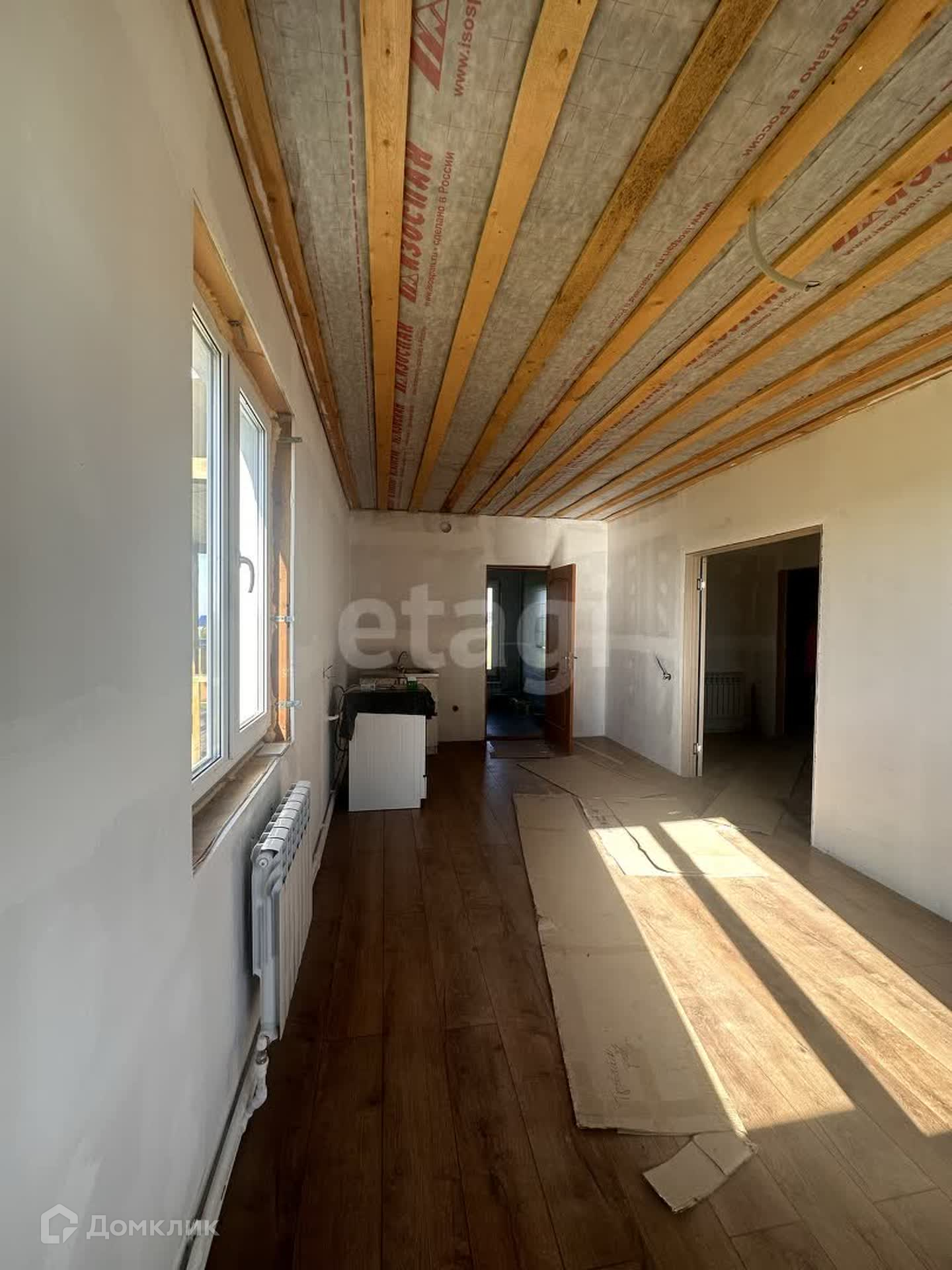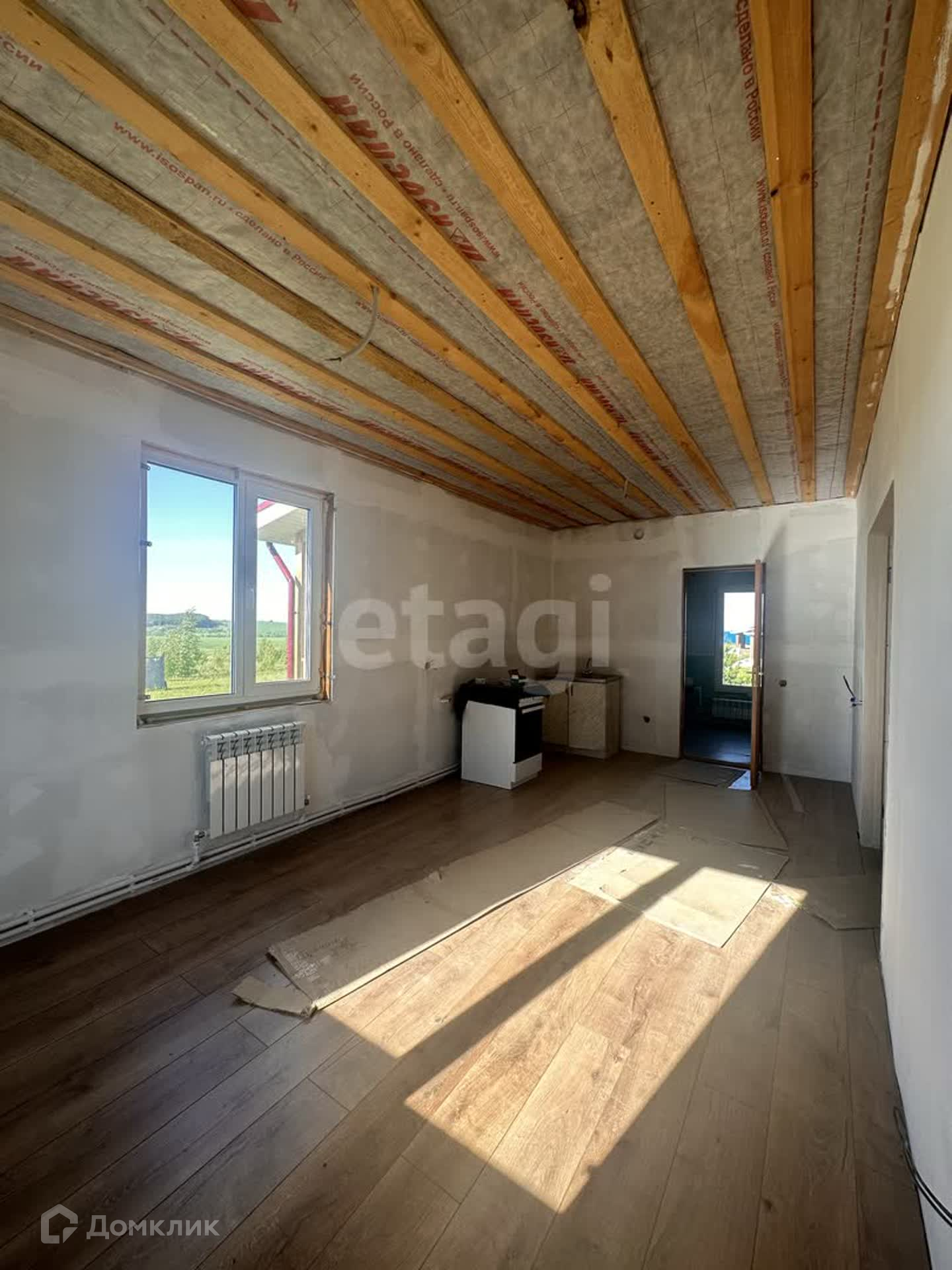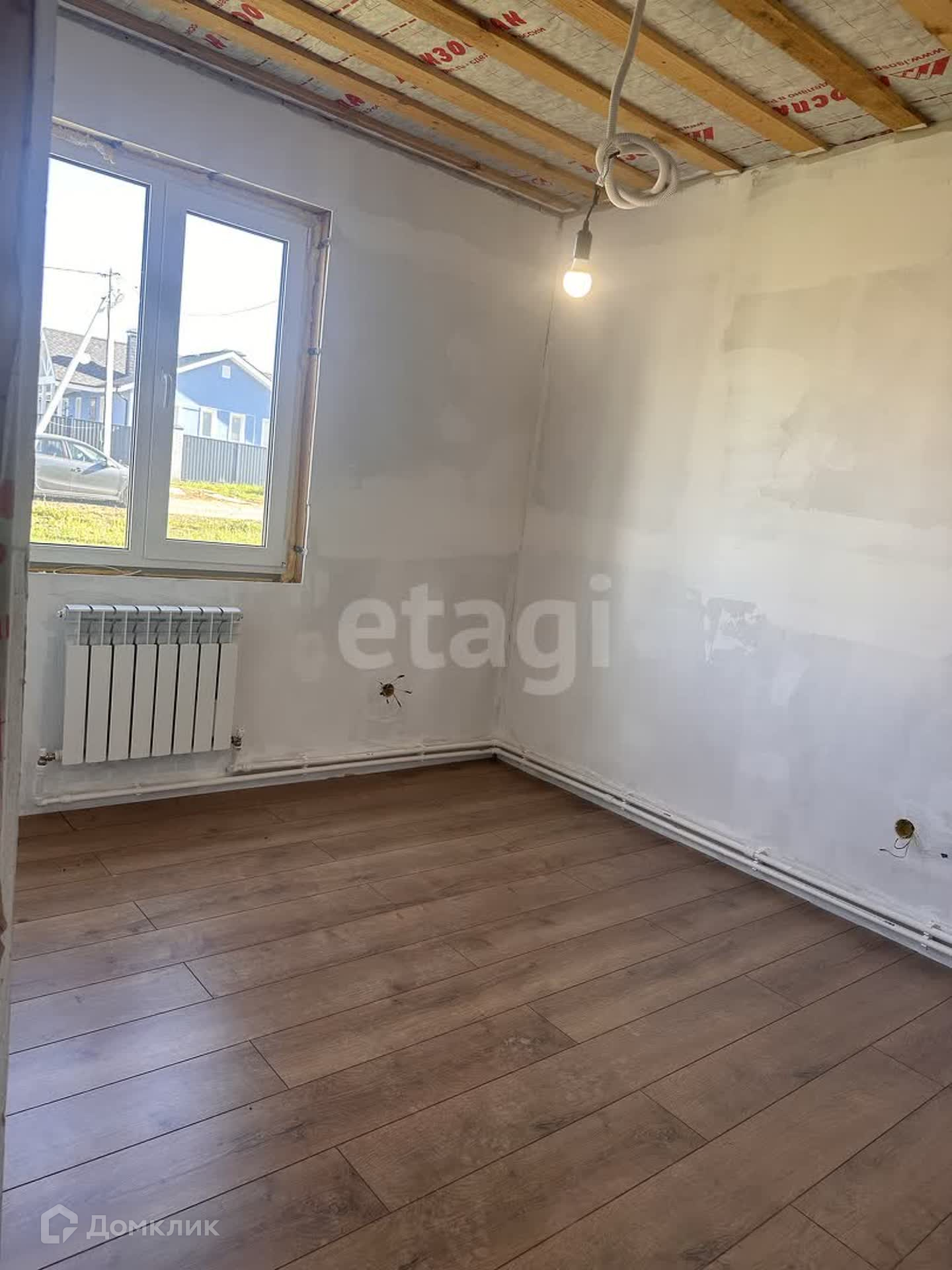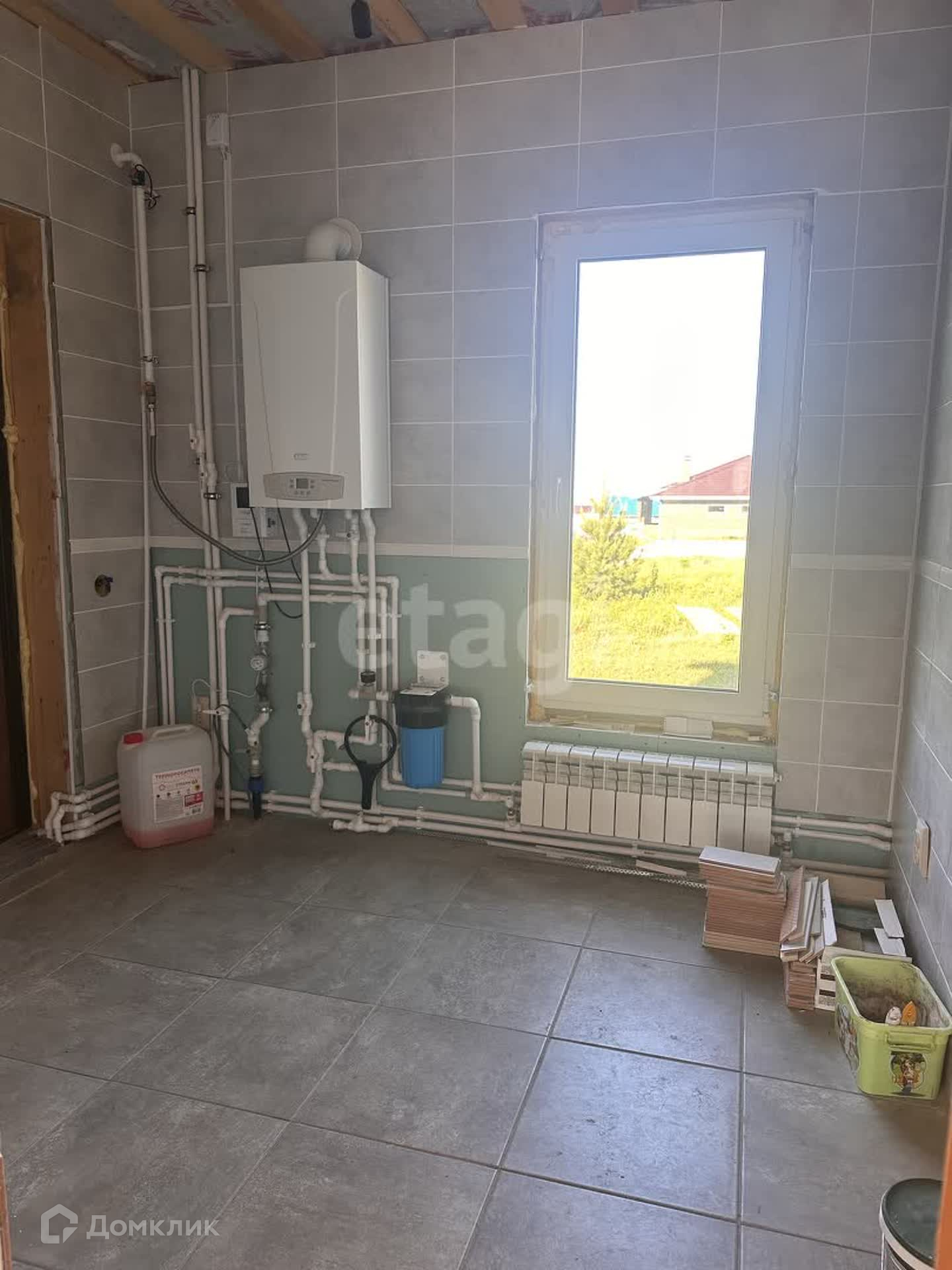 На первом этаже находится гостевая комната, кухня-гостиная, котельная, с/у. Сделан частично ремонт, на полу положен ламинат, стены подготовлены под покраску, сделана разводка радиаторов отопления, электричества, плитка в с/у и котельной.