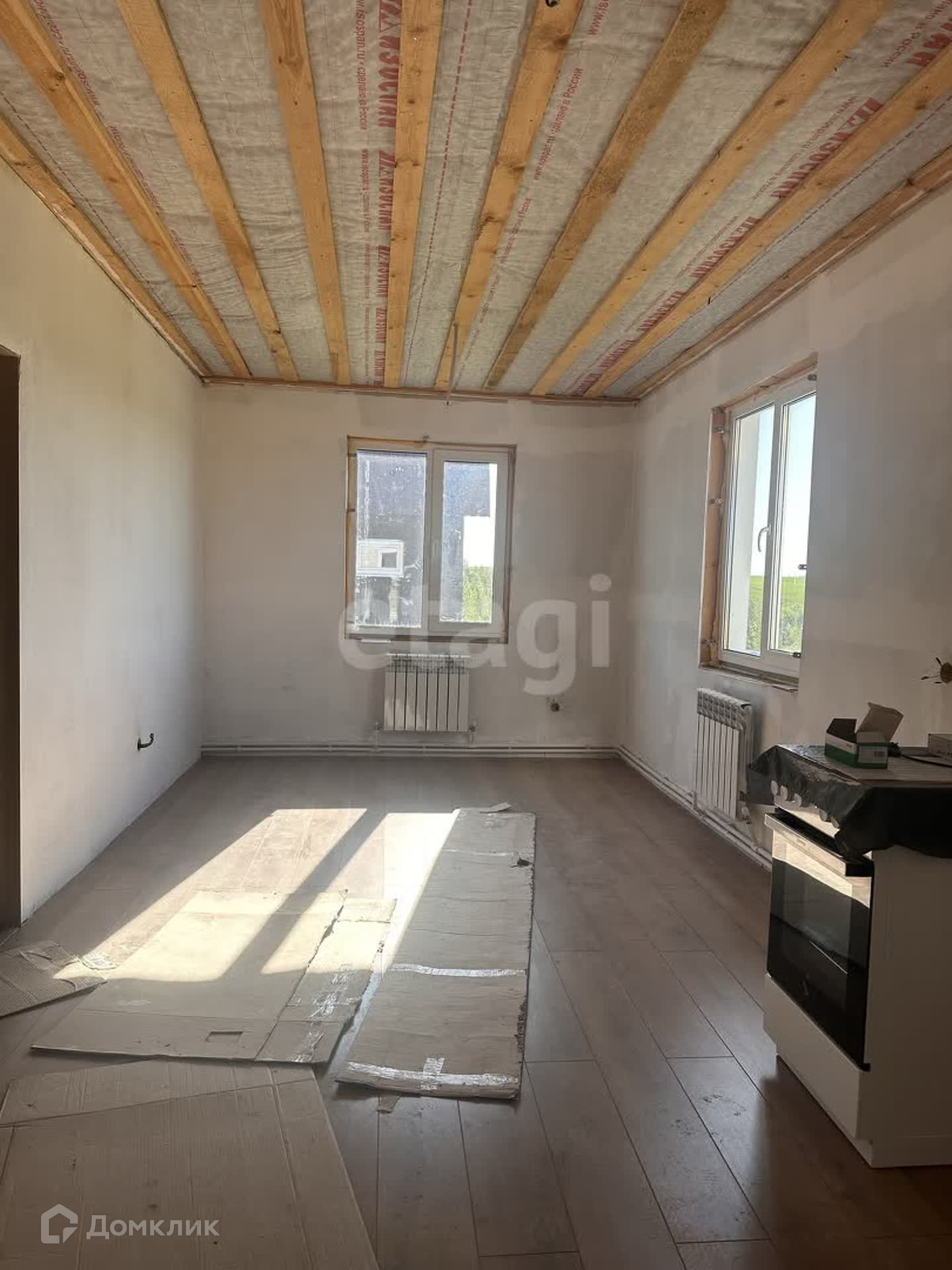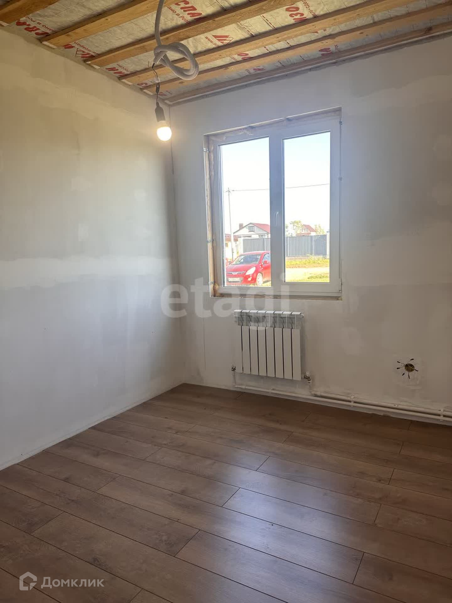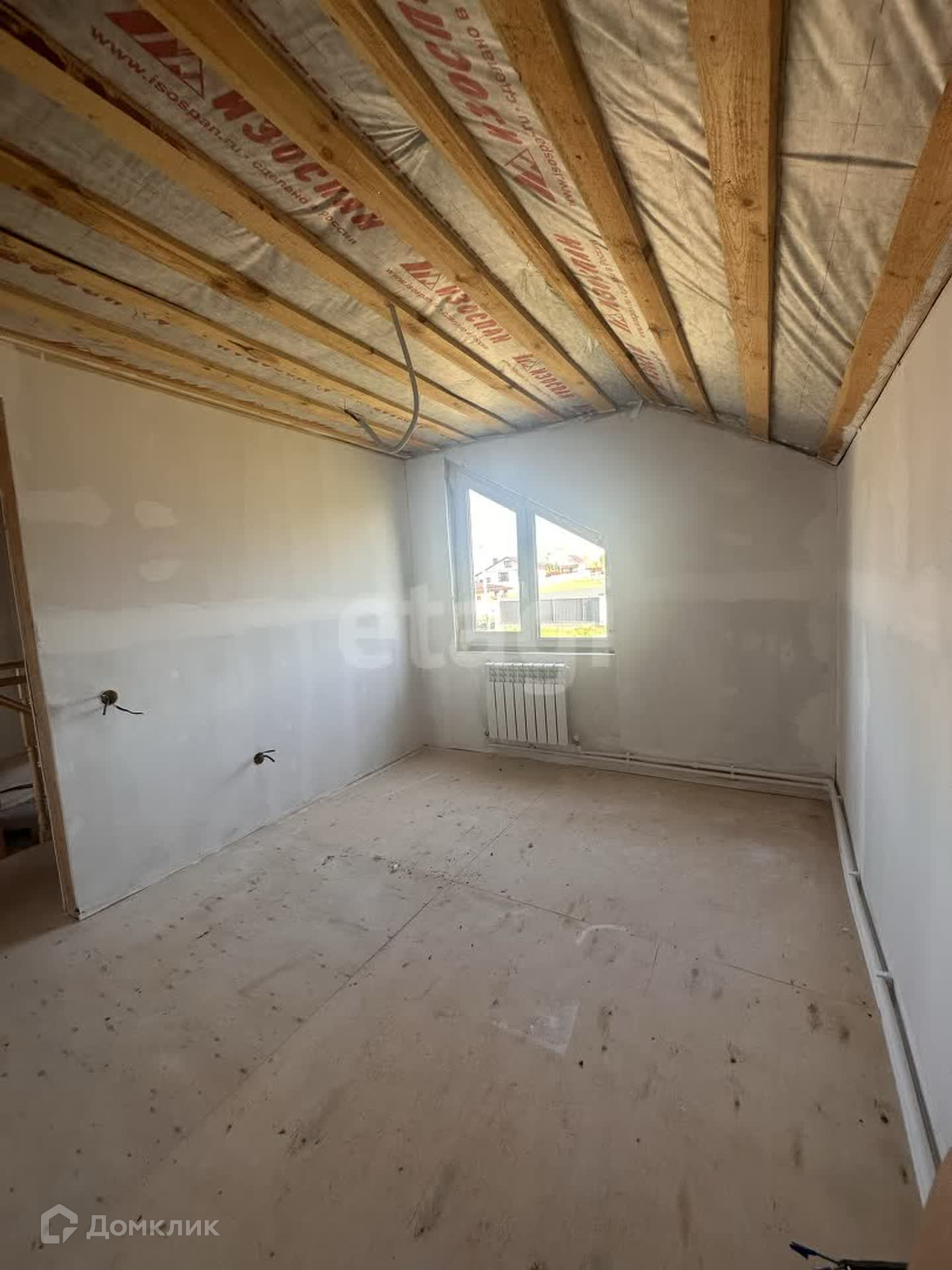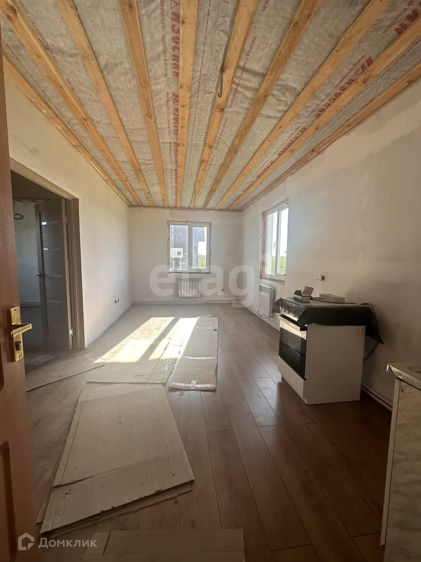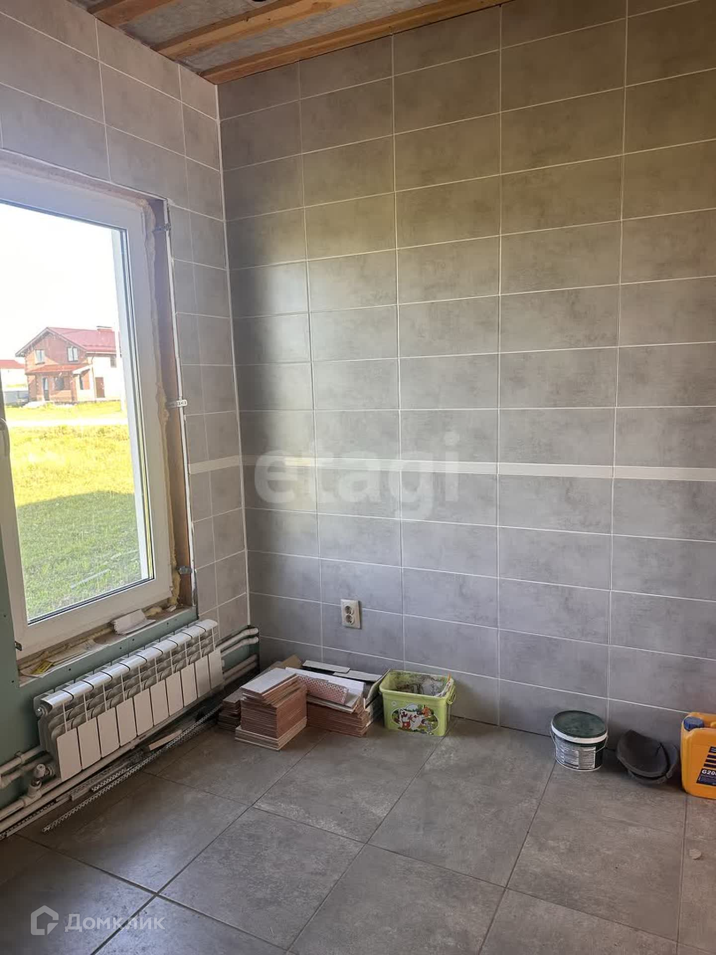 На первом этаже находится гостевая комната, кухня-гостиная, котельная, с/у. Сделан частично ремонт, на полу положен ламинат, стены подготовлены под покраску, сделана разводка радиаторов отопления, электричества, плитка в с/у и котельной.