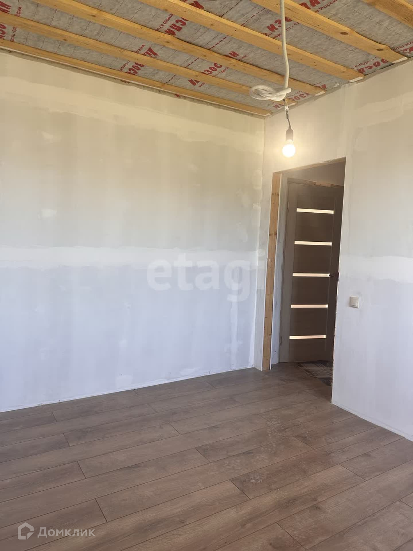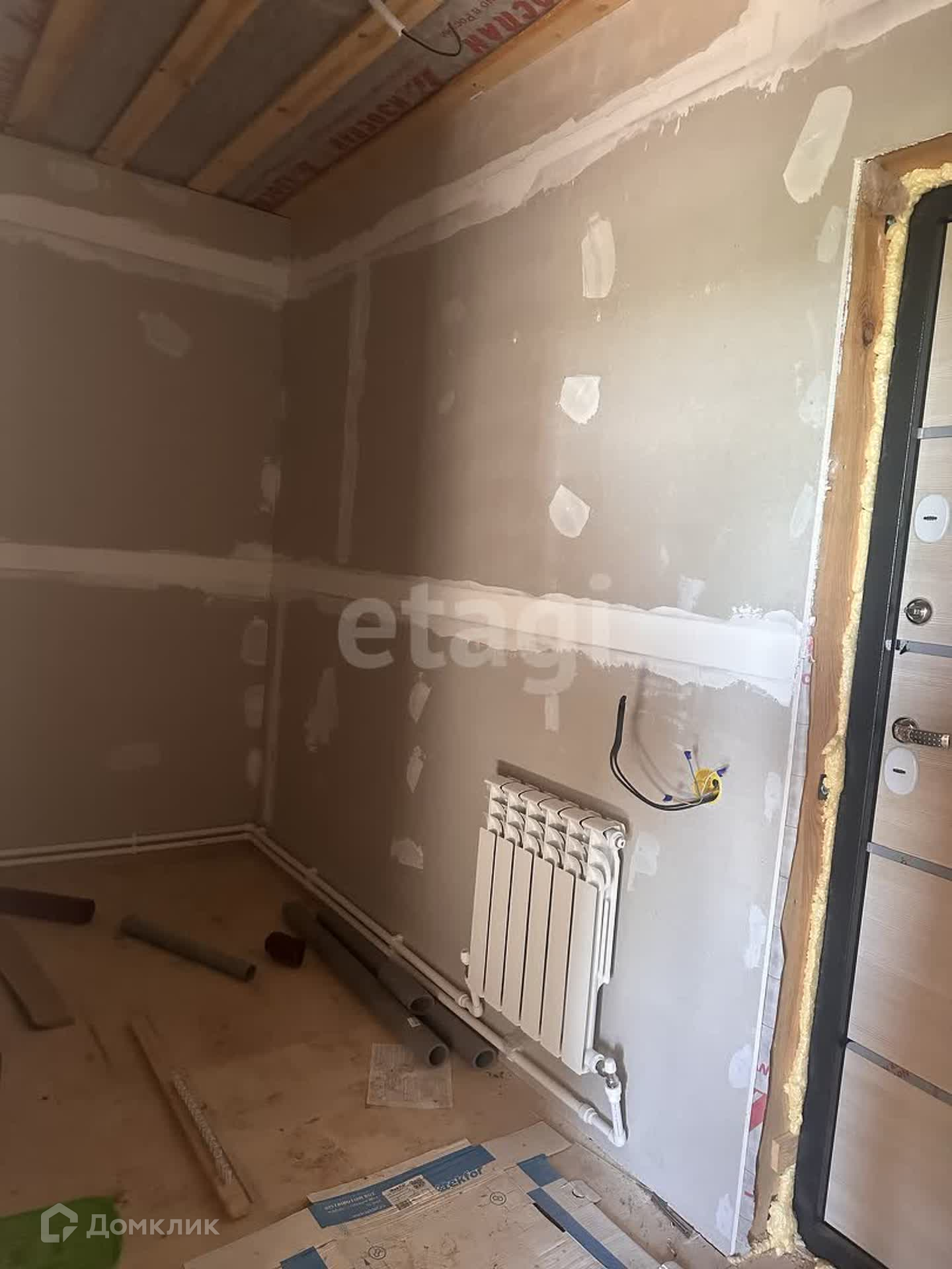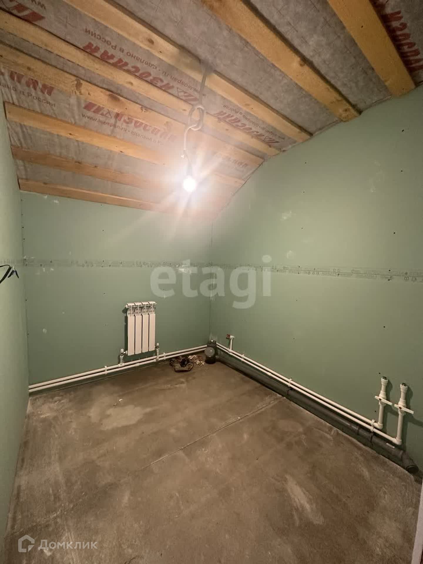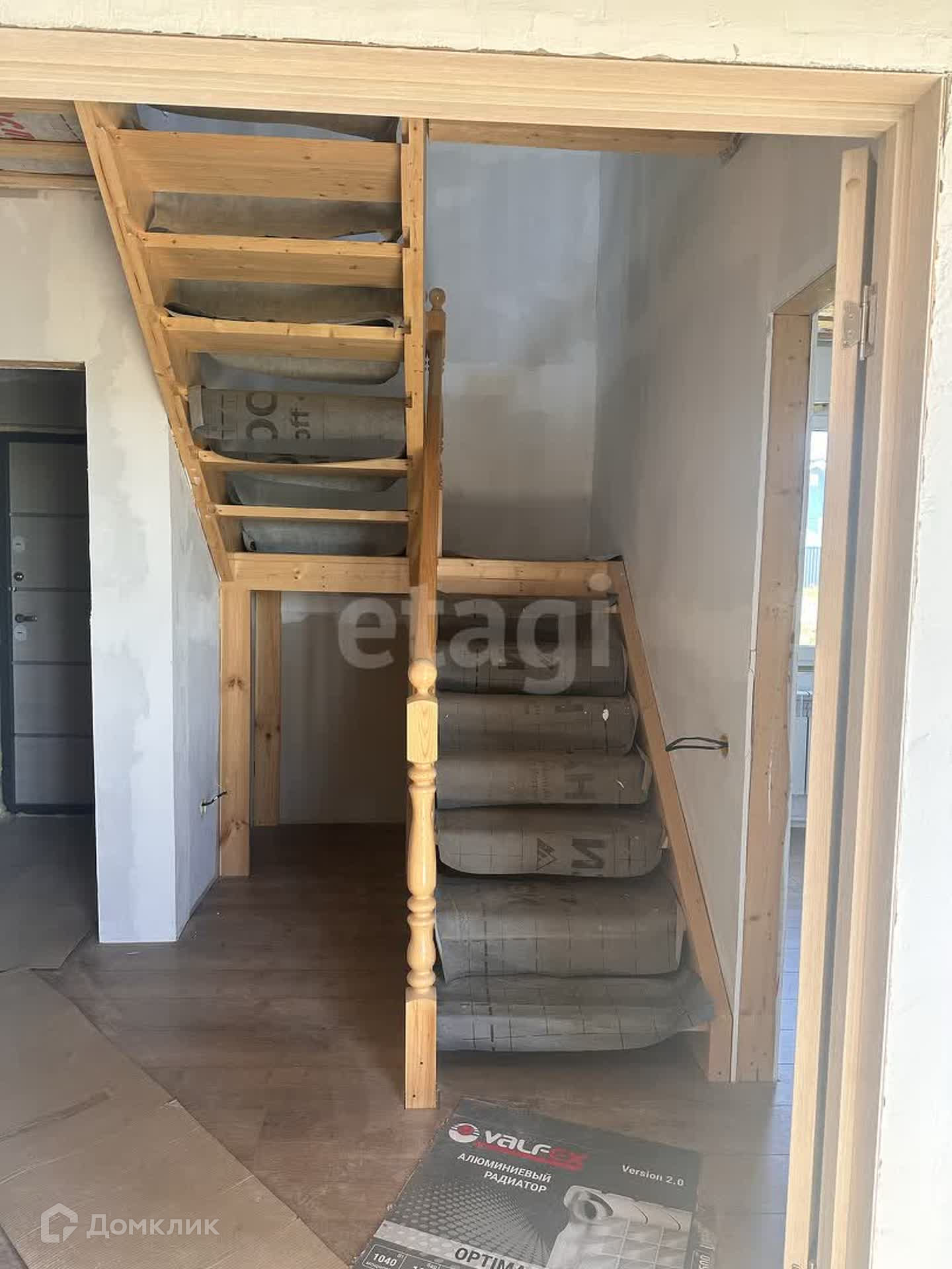 На первом этаже находится гостевая комната, кухня-гостиная, котельная, с/у. Сделан частично ремонт, на полу положен ламинат, стены подготовлены под покраску, сделана разводка радиаторов отопления, электричества, плитка в с/у и котельной.