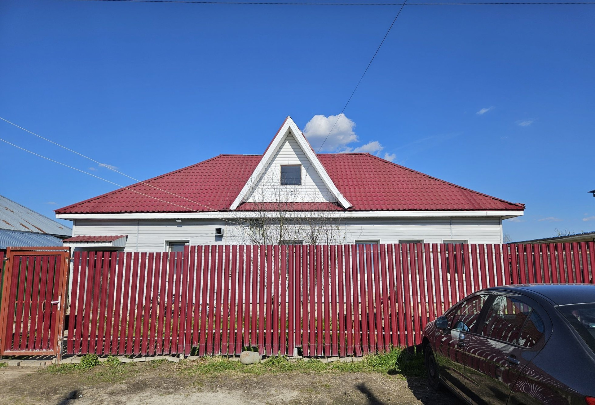 Забор по периметру участка. Откатные ворота с пульта, большая парковка.