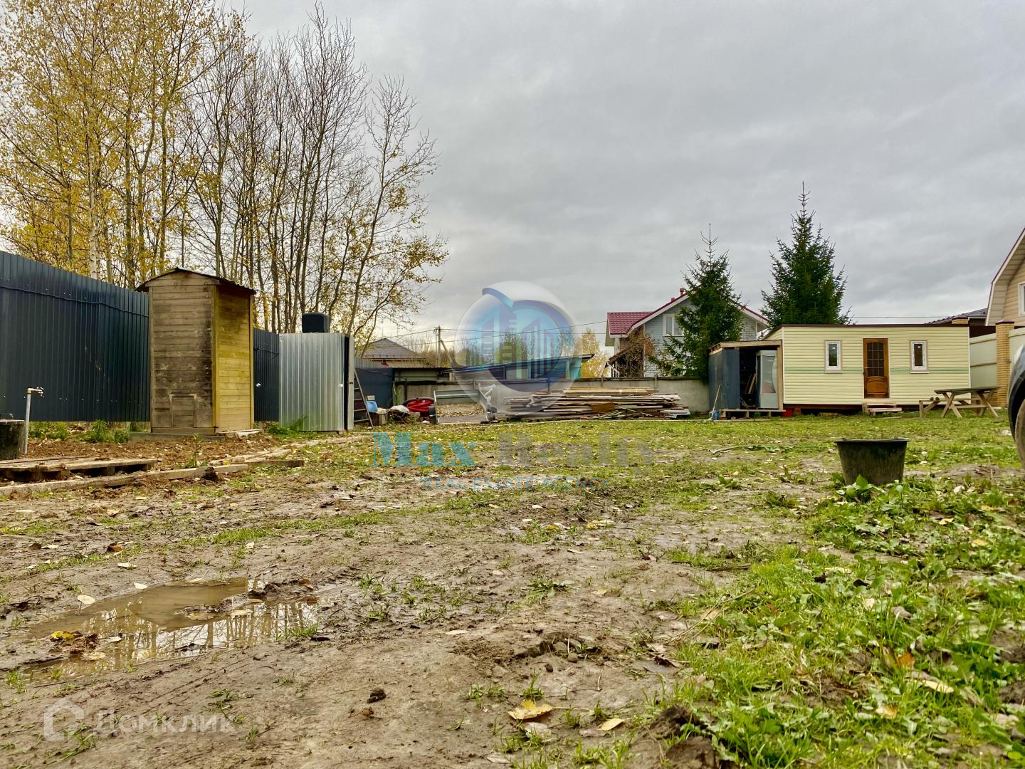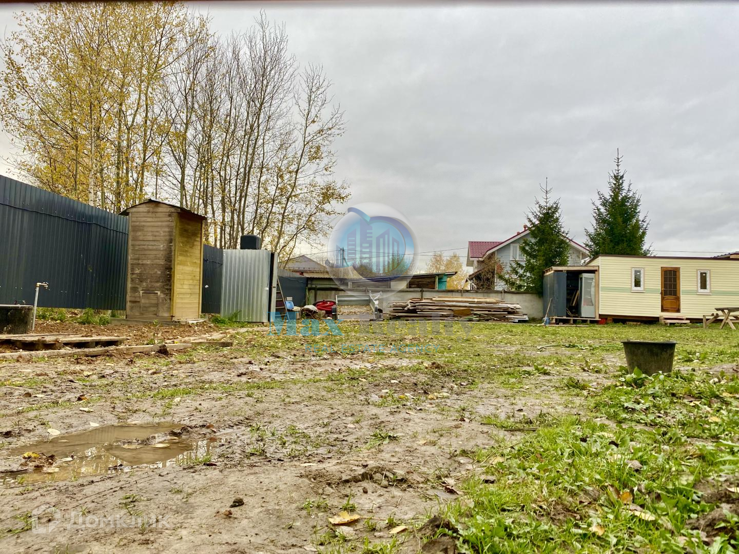 Огорожен капитальным забором из профнастила. На участке есть жилая бытовка, уличный туалет.