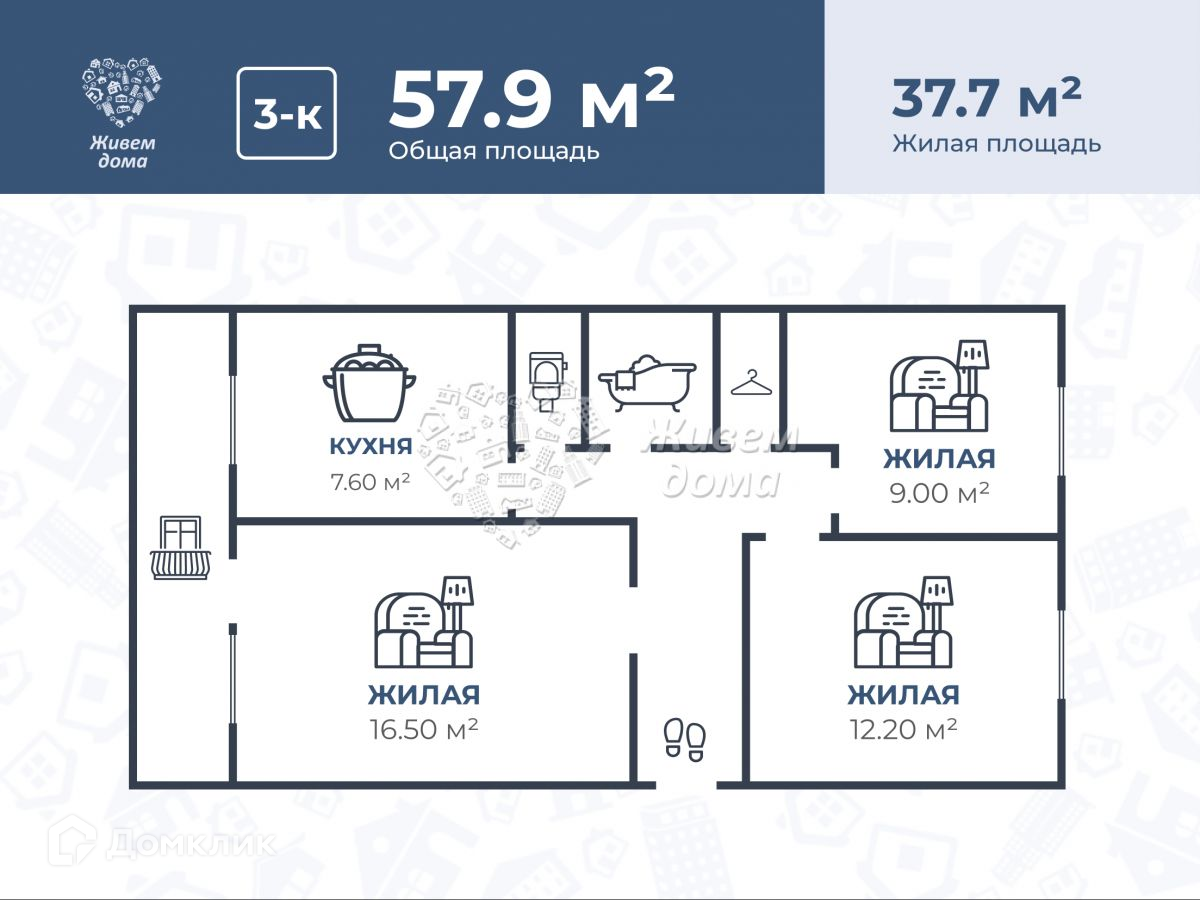 Улучшенная планировка: общая 57.90 / жилая 37.70 / кухня 7.60