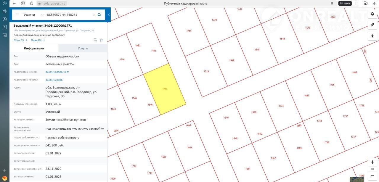 Продам земельный участок, расположенный по адресу: обл. Волгоградская, р-н Городищенский, р.п. Городище, ул. Парусная, 35, кадастровый номер 34:03:120006:1771, площадью 1000 кв.м., вид разрешенного использования-под индивидуальную жилую застройку, участок размежеван, документы готовы для продажи.