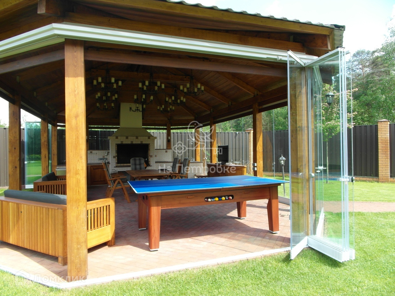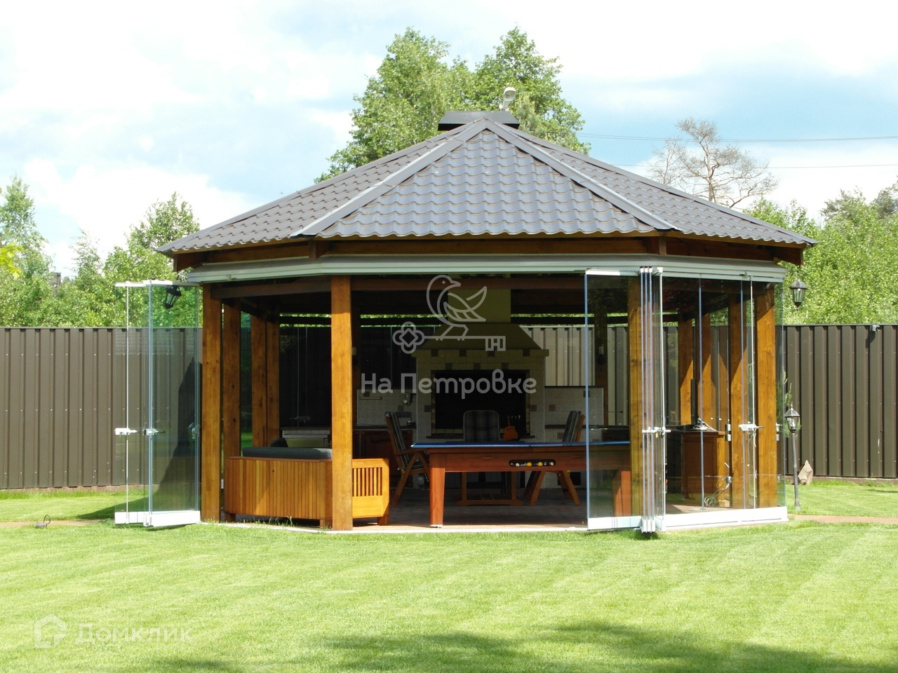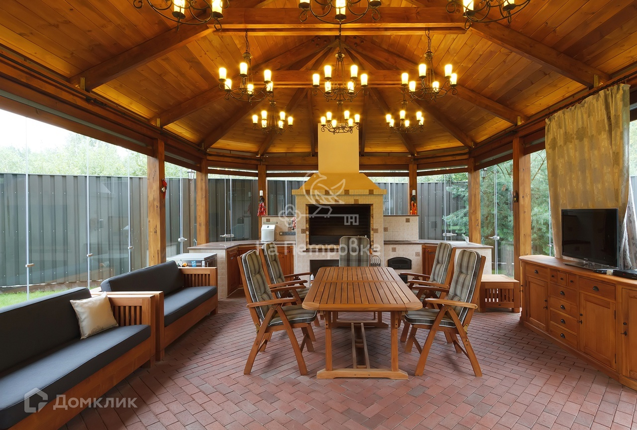 Участок с газоном и декоративными насаждениями оснащён системой авто полива, дренажной системой, огорожен забором с автоматическими въездными воротами. В многофункциональной беседке с расширяющим пространство панорамным безрамным остеклением, мебелью из долговечного тика, печным комплексом ( BBQ, мангал, электровертел) предусмотрены все удобства для отдыха владельцев и их гостей.