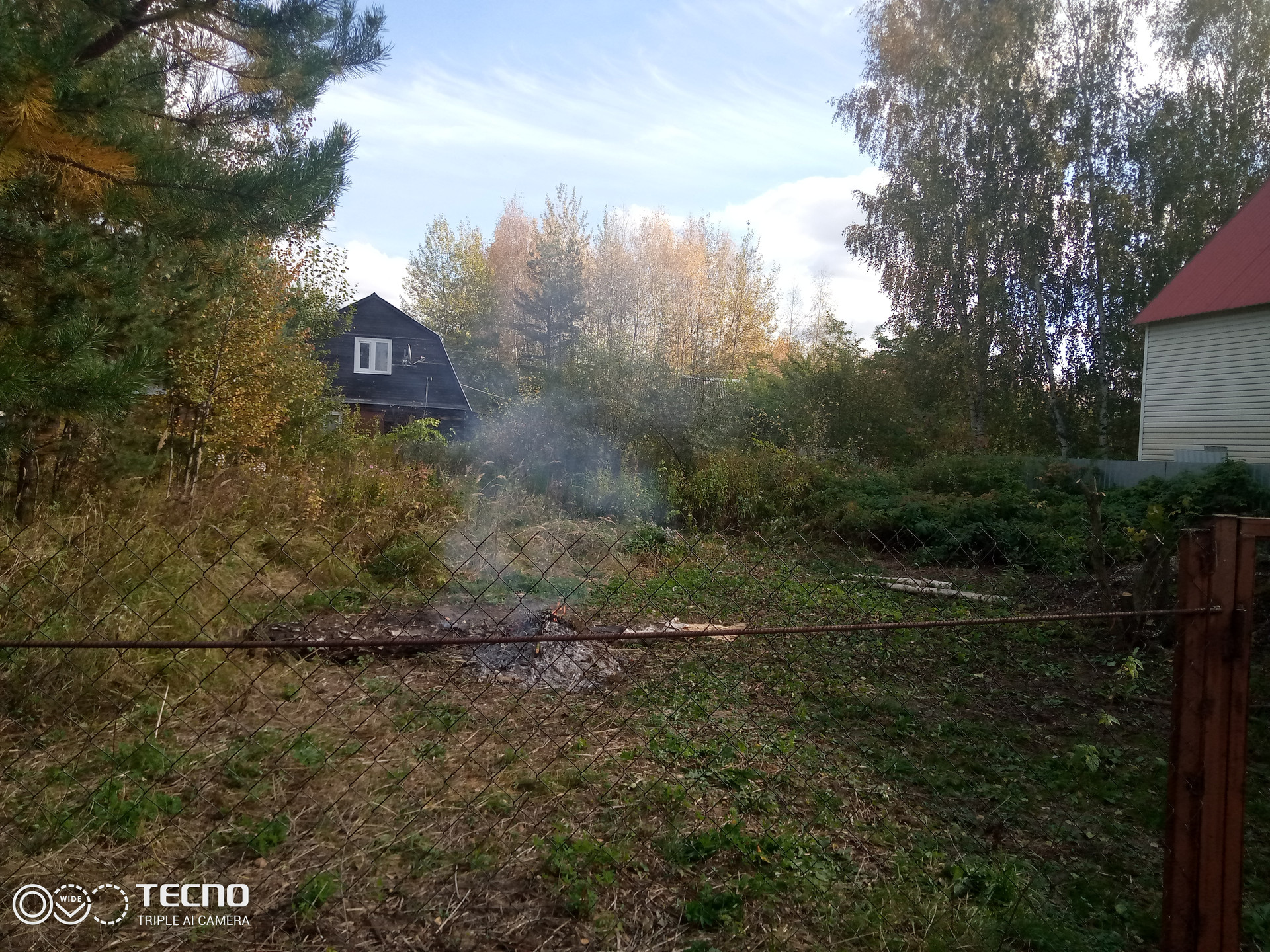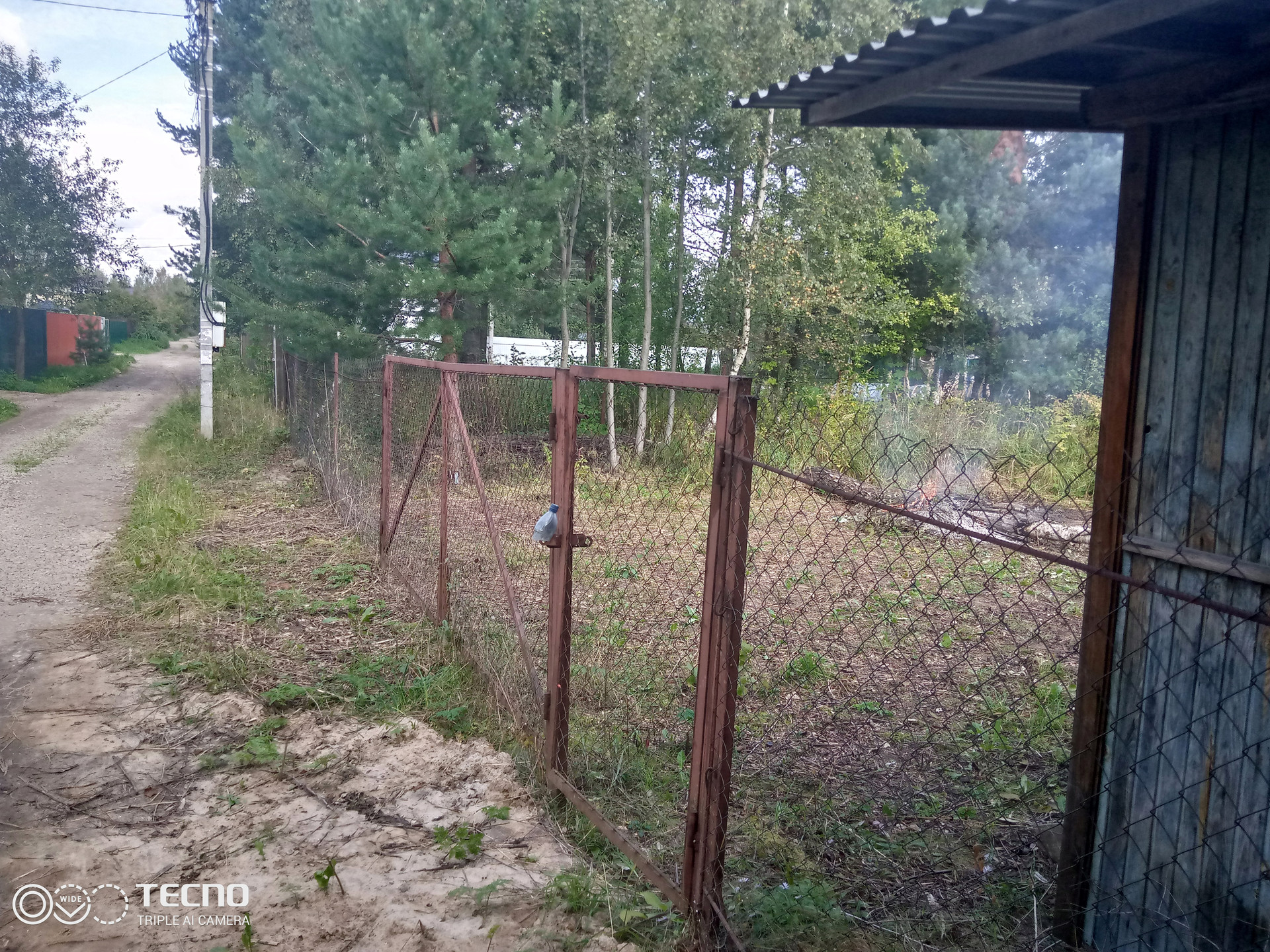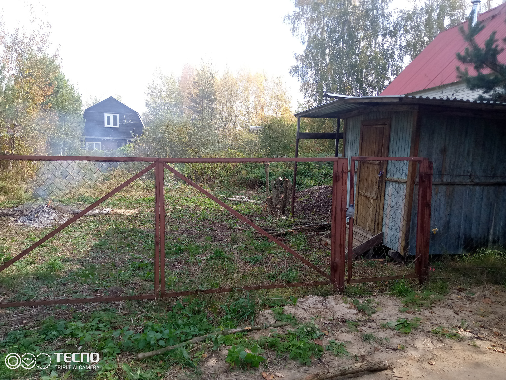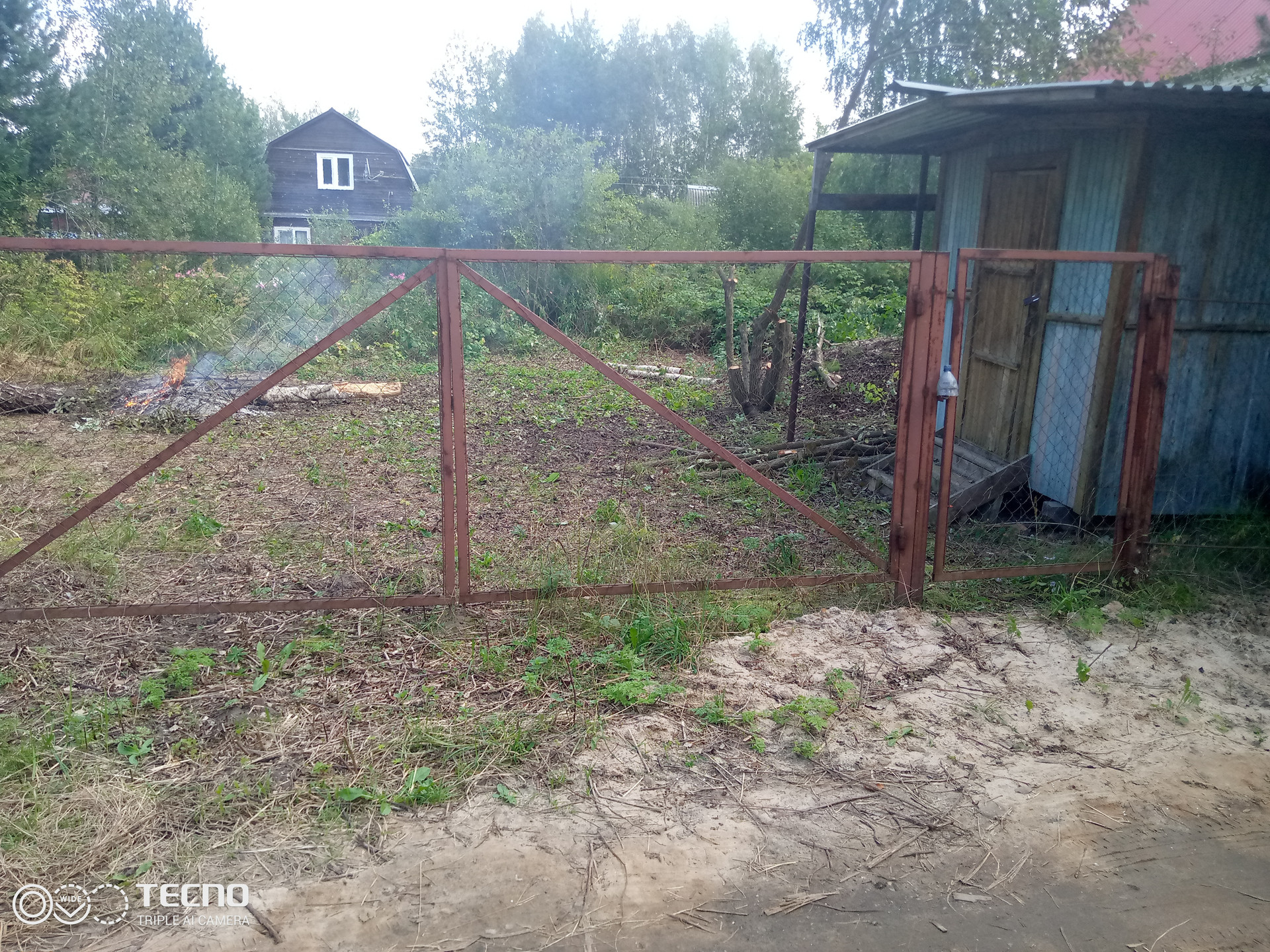 Участок огорожен, калитка и ворота для заезда автомобиля. Бытовка.