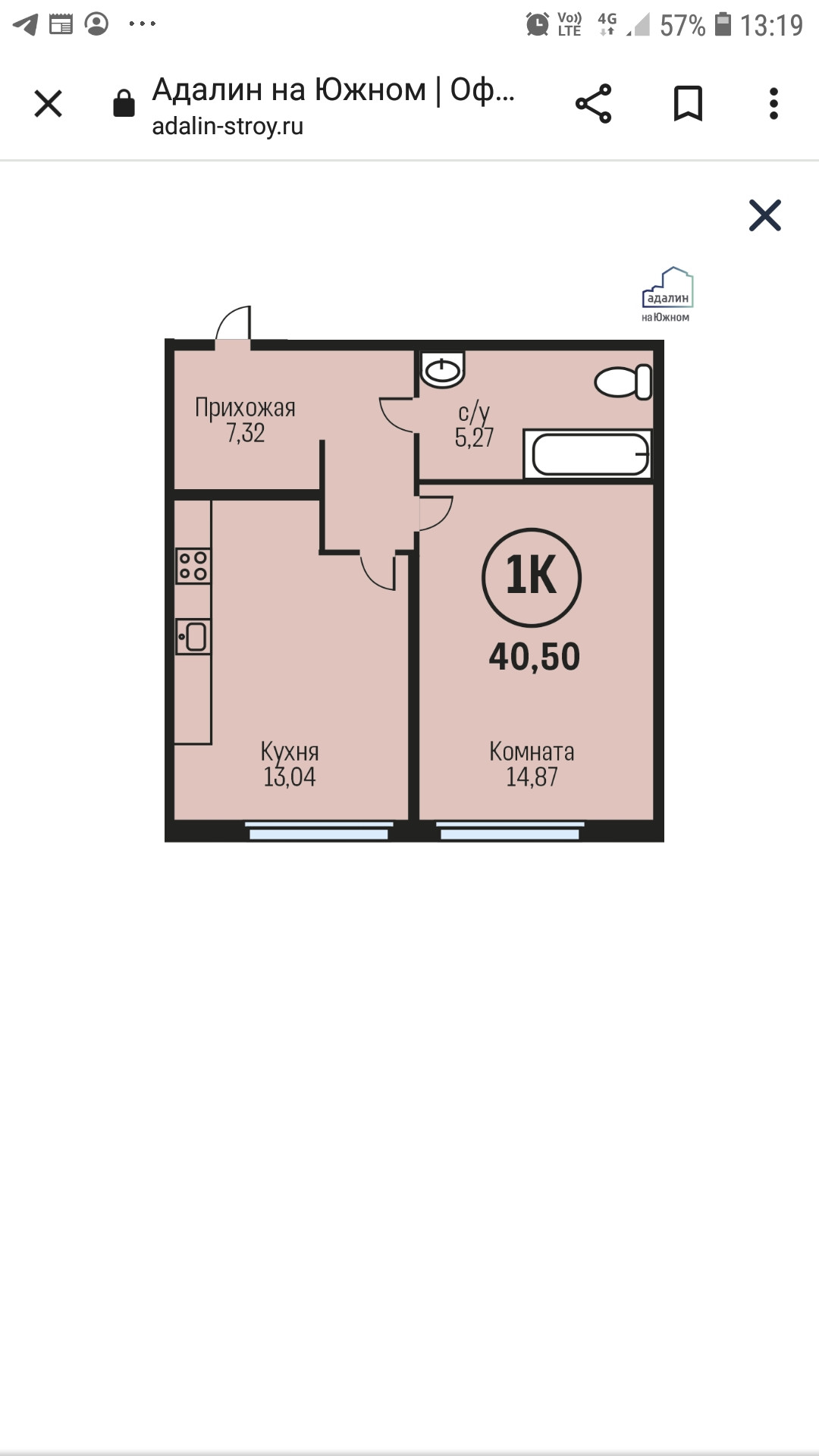 Общая площадь 40.5 м2