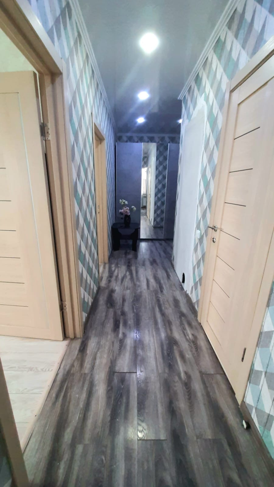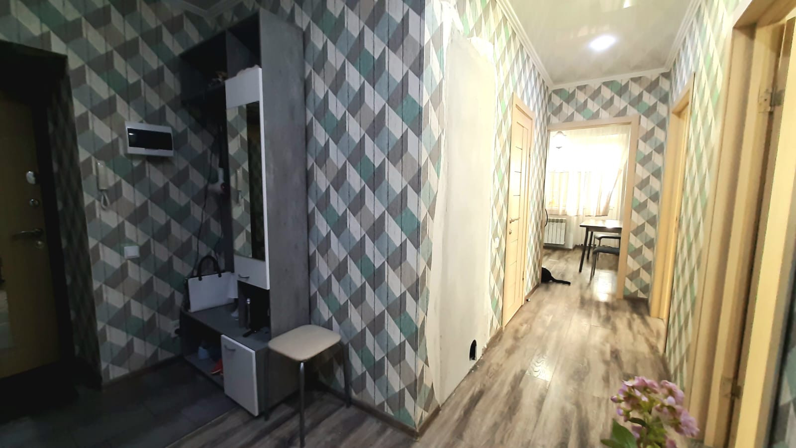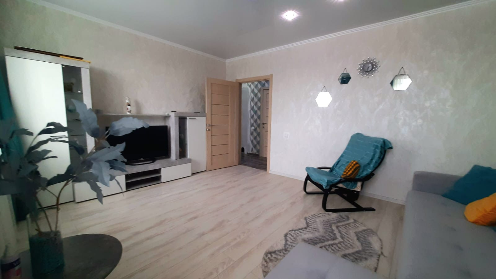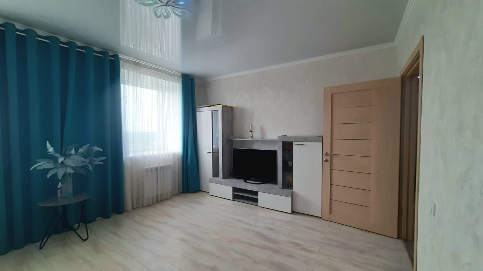 Установлены межкомнатные двери, на полу ламинат, входная зона выложена керамогранитом. По всей квартире натяжной потолок, поклеены современные обои.
