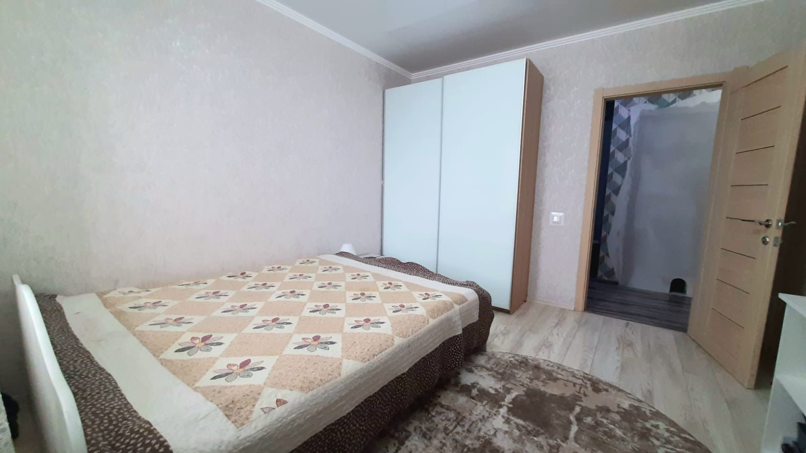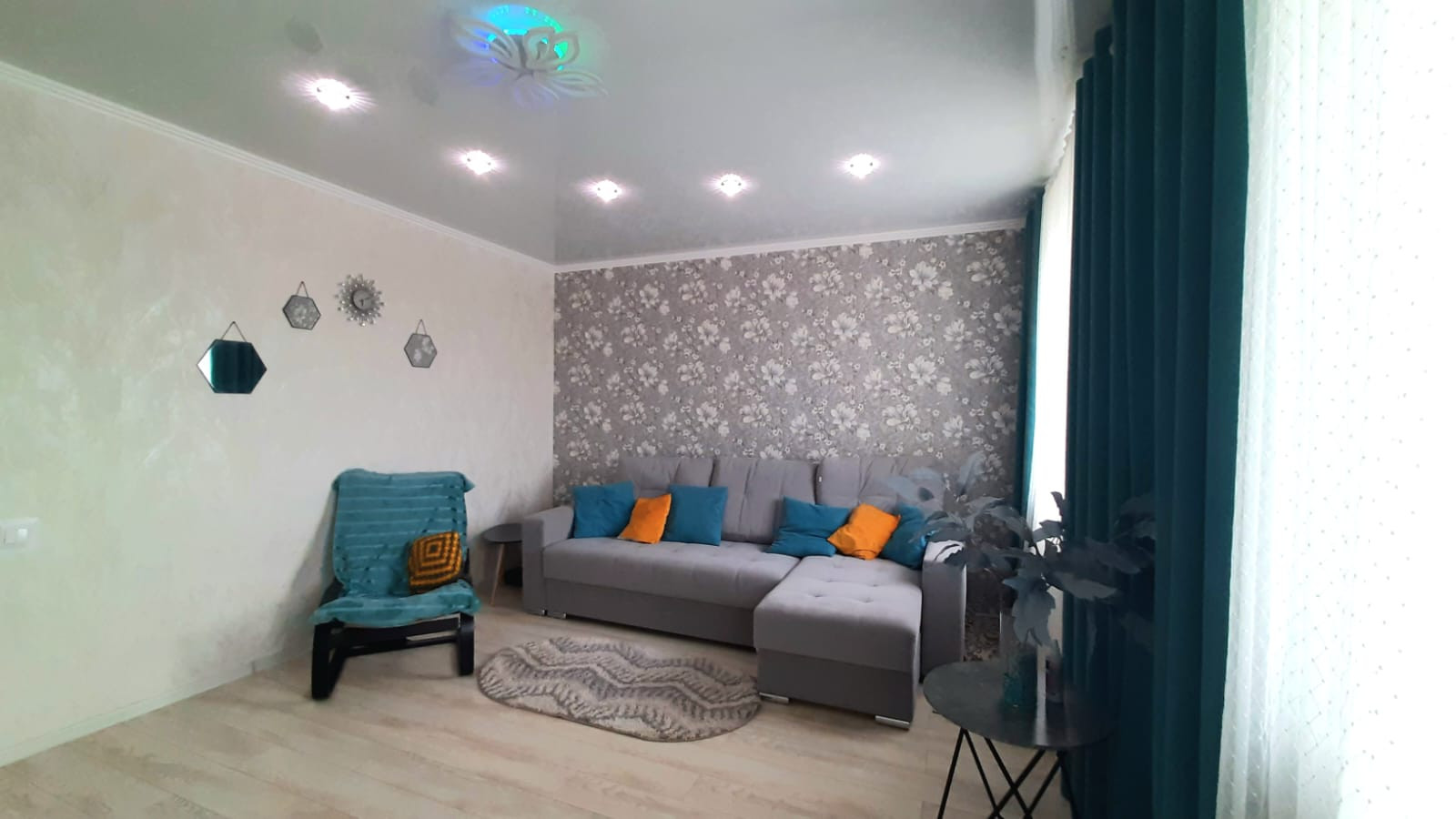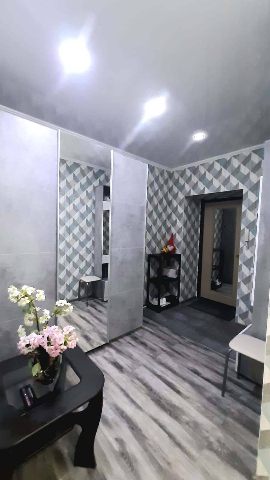 Установлены межкомнатные двери, на полу ламинат, входная зона выложена керамогранитом. По всей квартире натяжной потолок, поклеены современные обои.