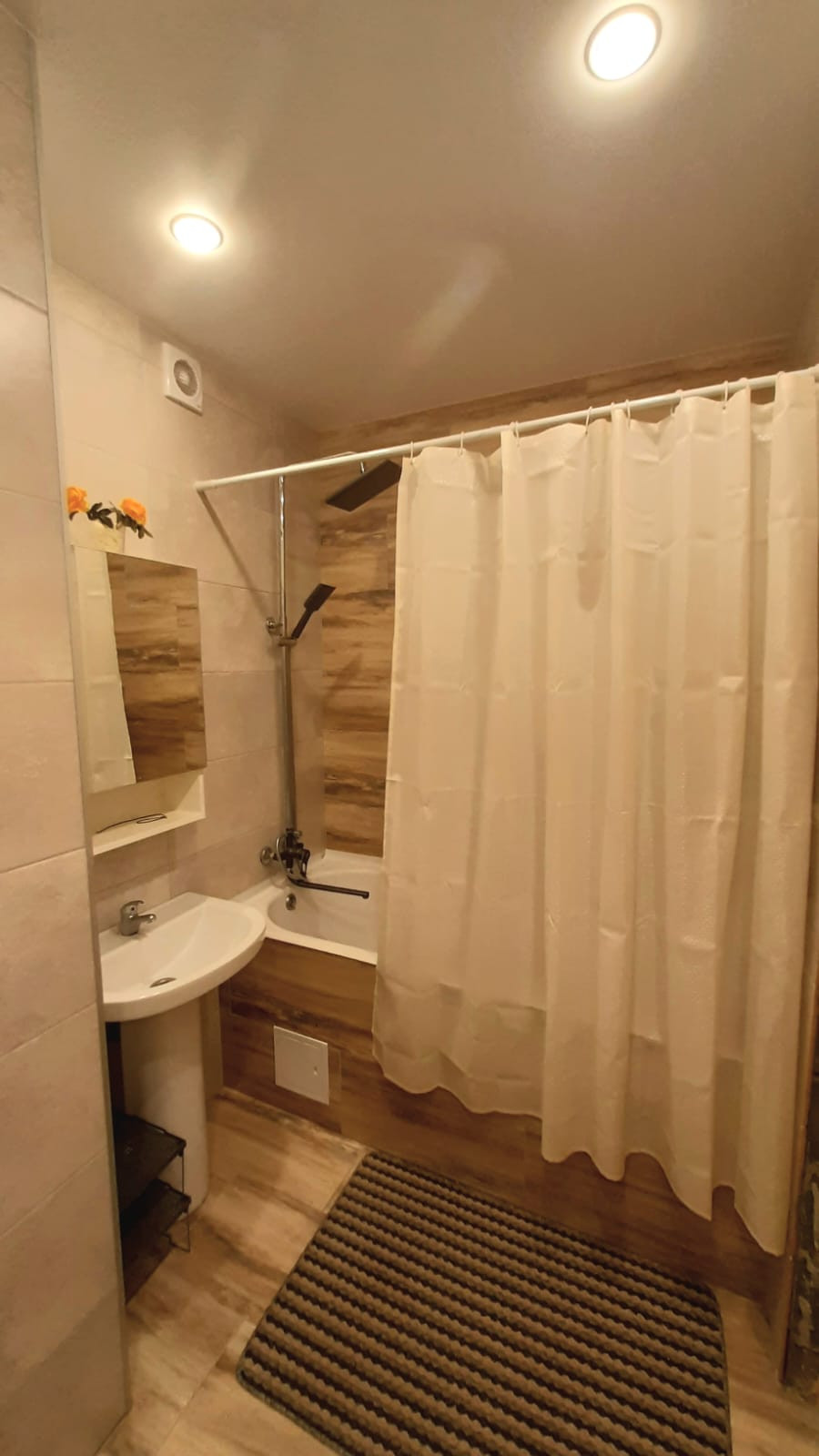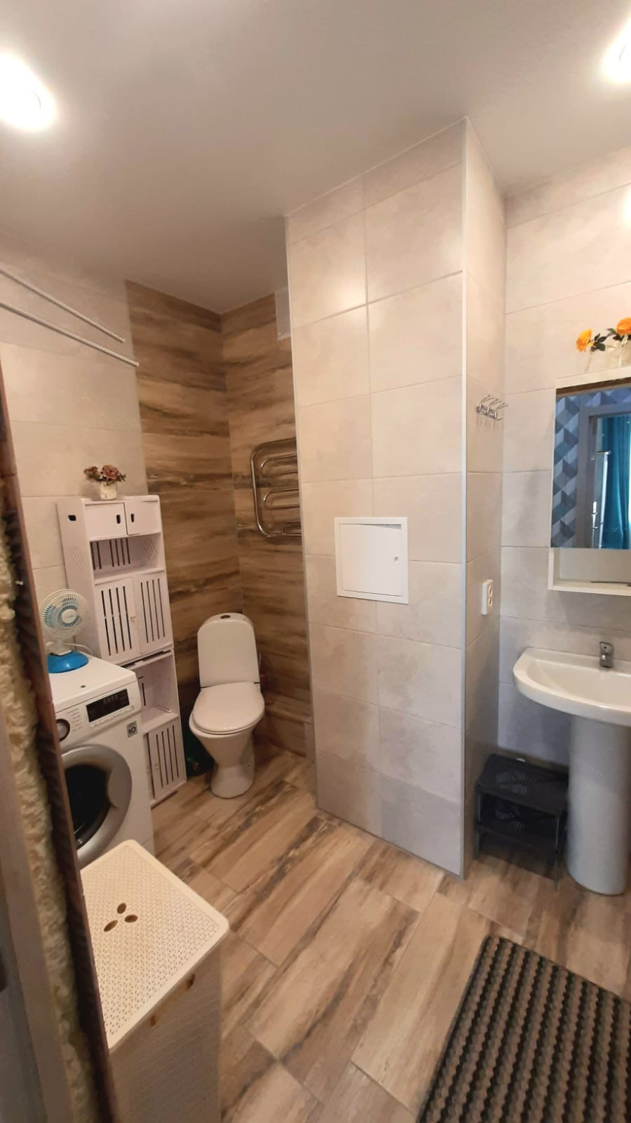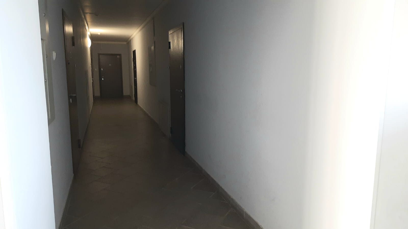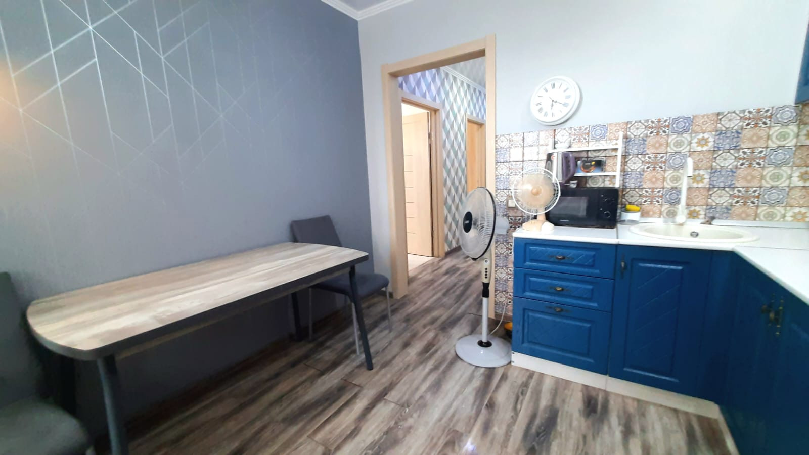 Установлены межкомнатные двери, на полу ламинат, входная зона выложена керамогранитом. По всей квартире натяжной потолок, поклеены современные обои.