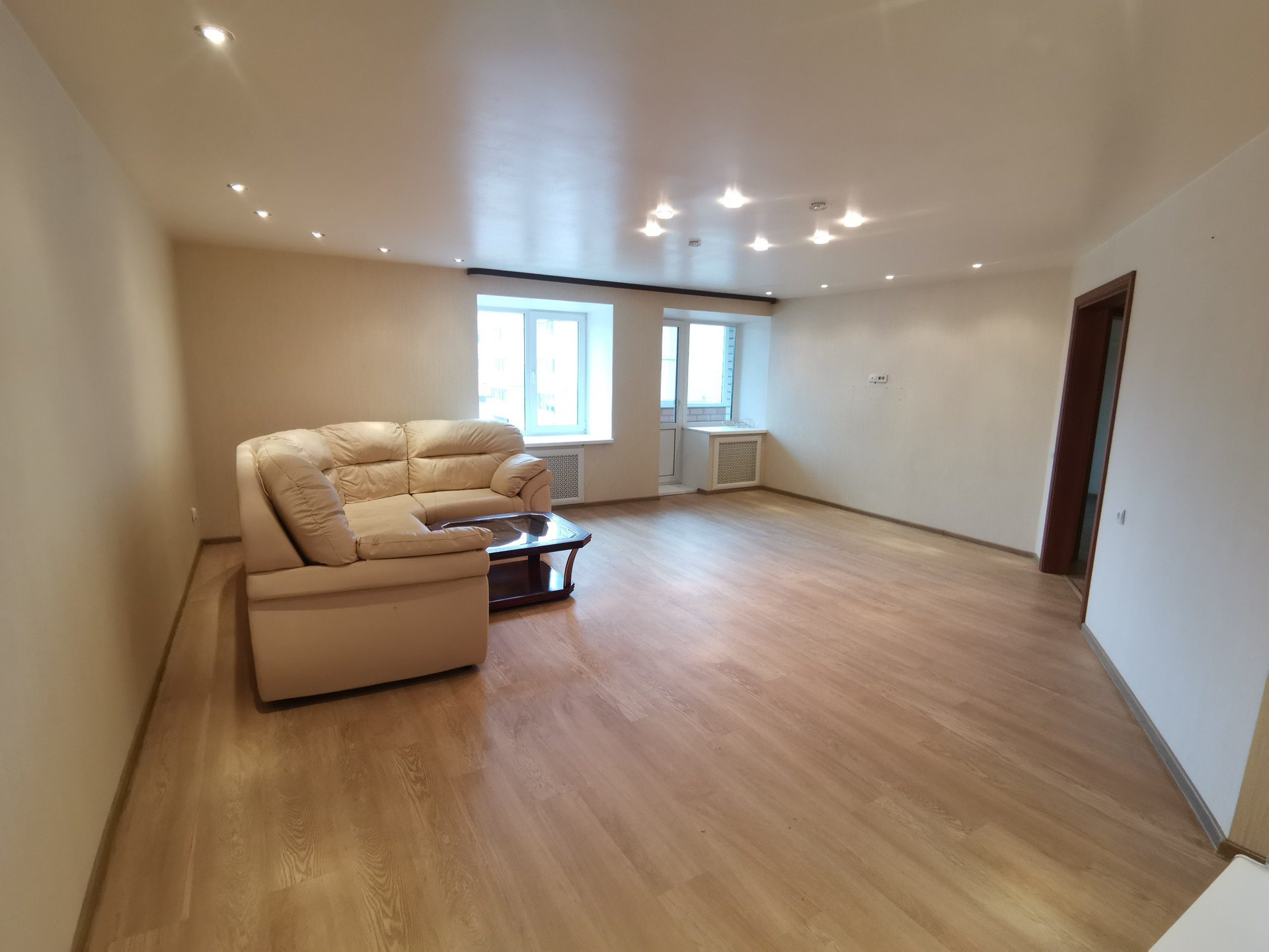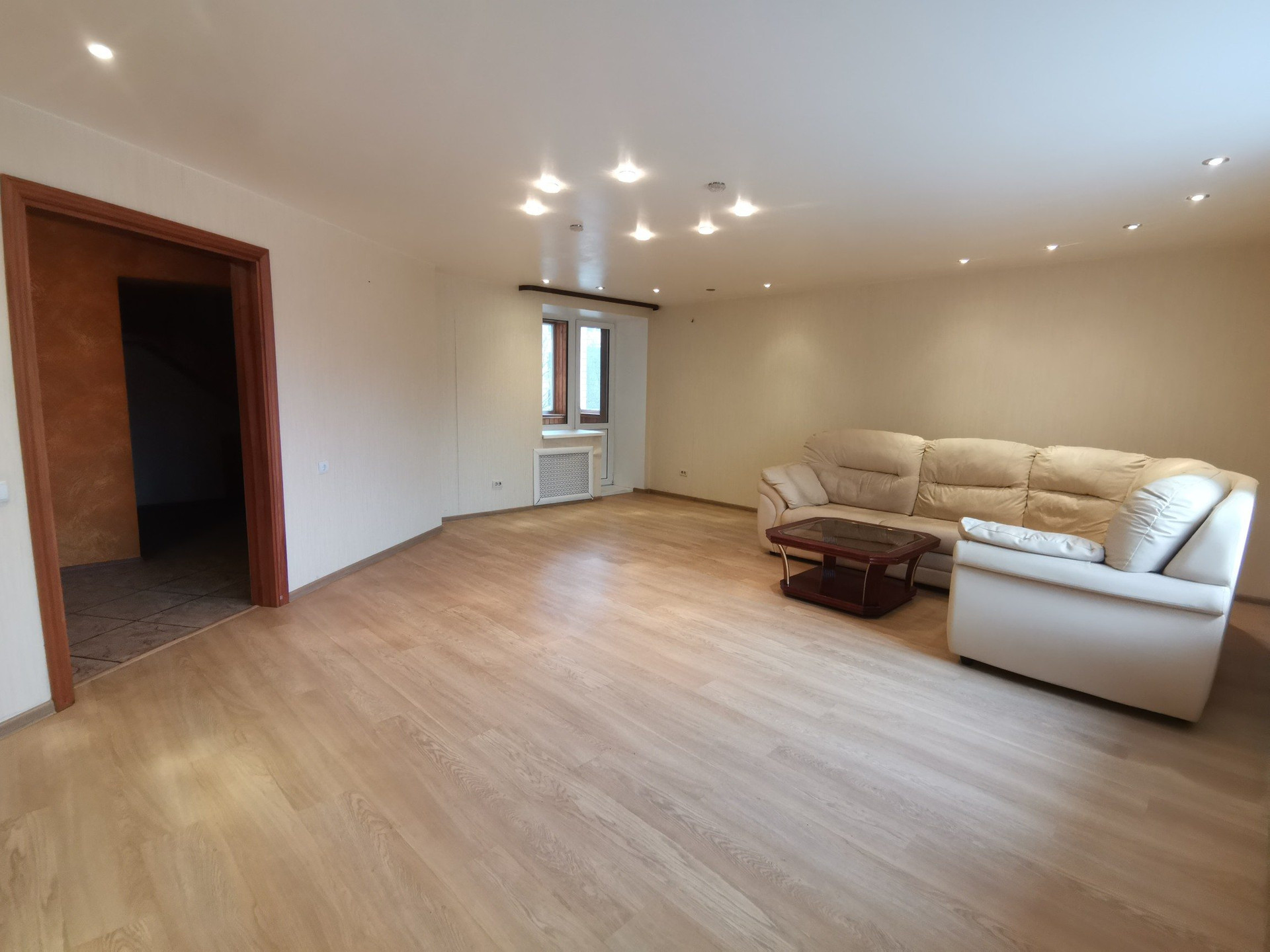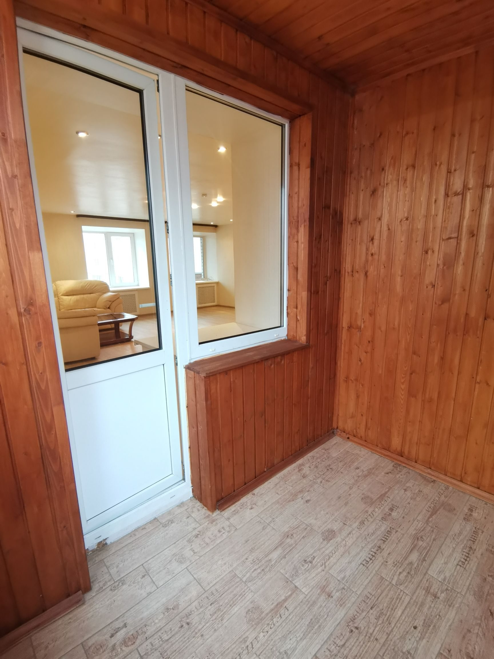На ПЕРВОМ этаже расположена гостиная комната 35,5 кв.м. с выходом на маленькую(обшитую вагонкой) и большую лоджии.