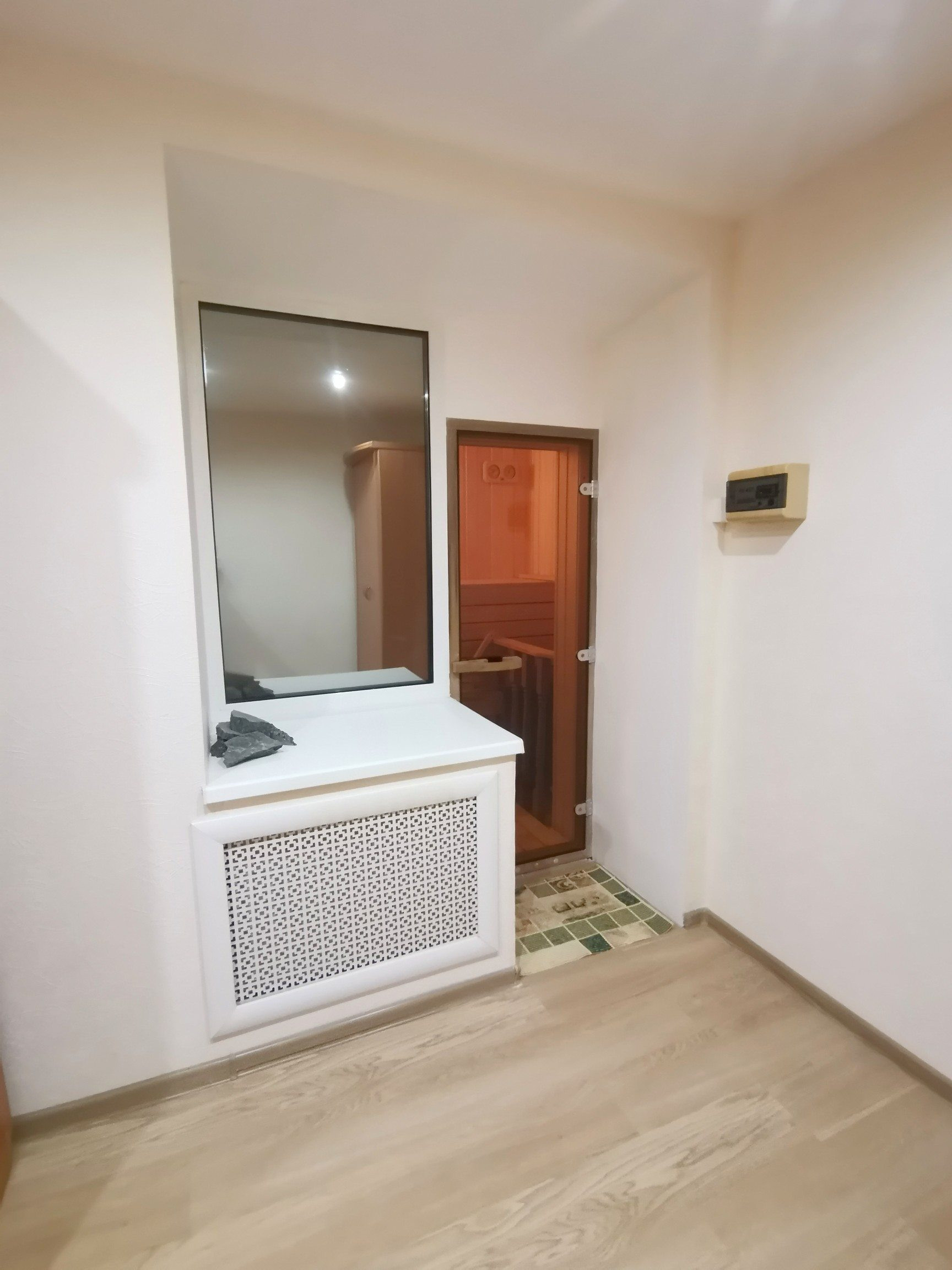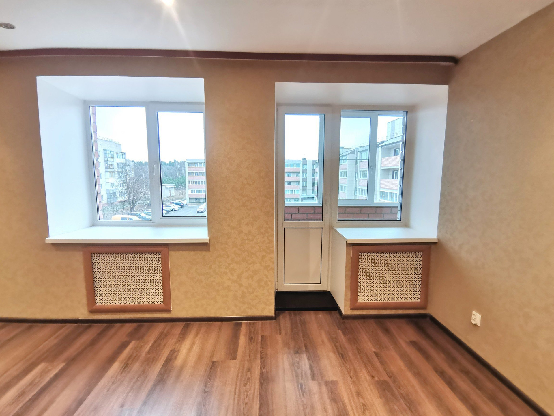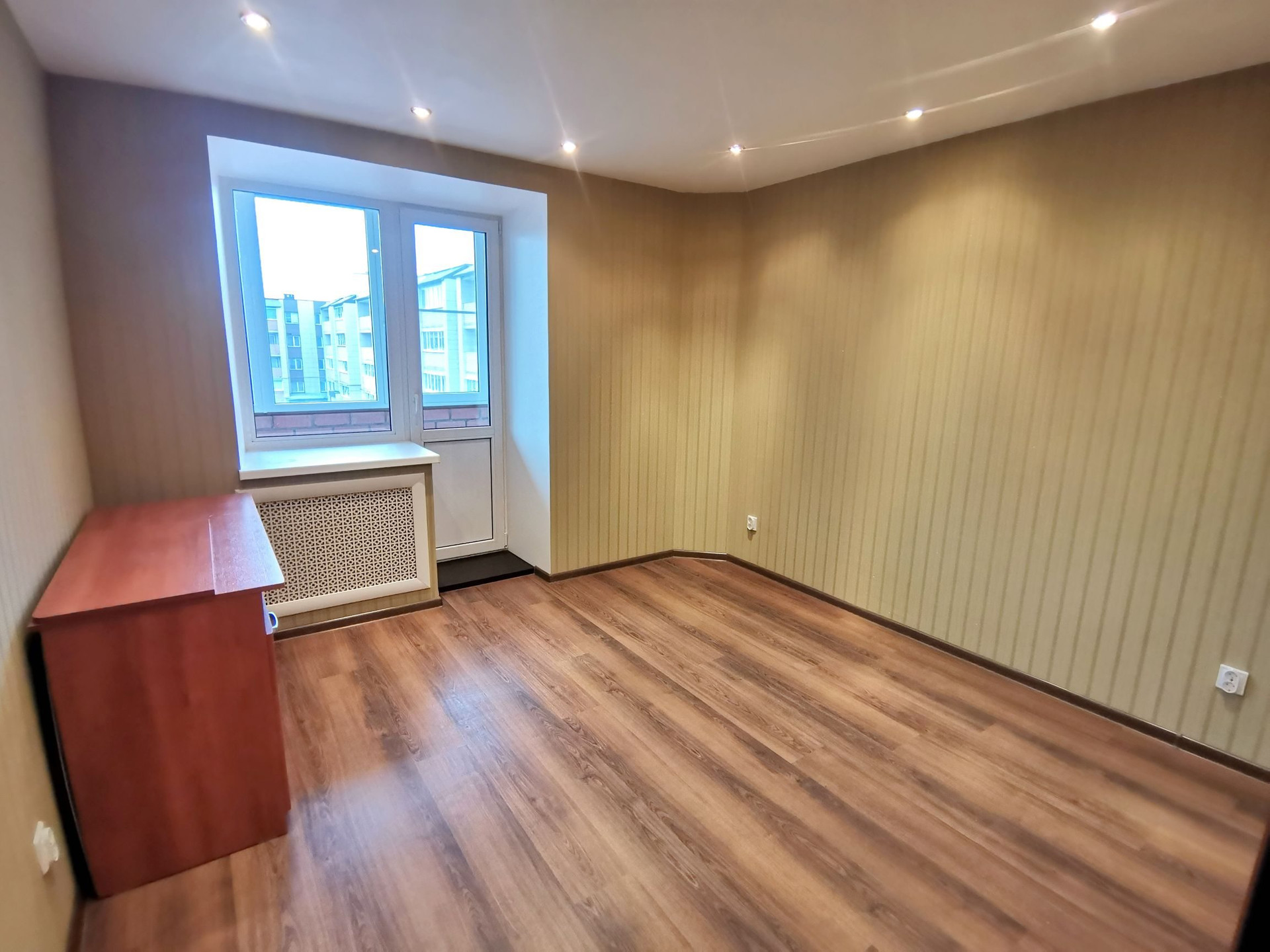 На ПЕРВОМ этаже расположена гостиная комната 35,5 кв.м. с выходом на маленькую(обшитую вагонкой) и большую лоджии.