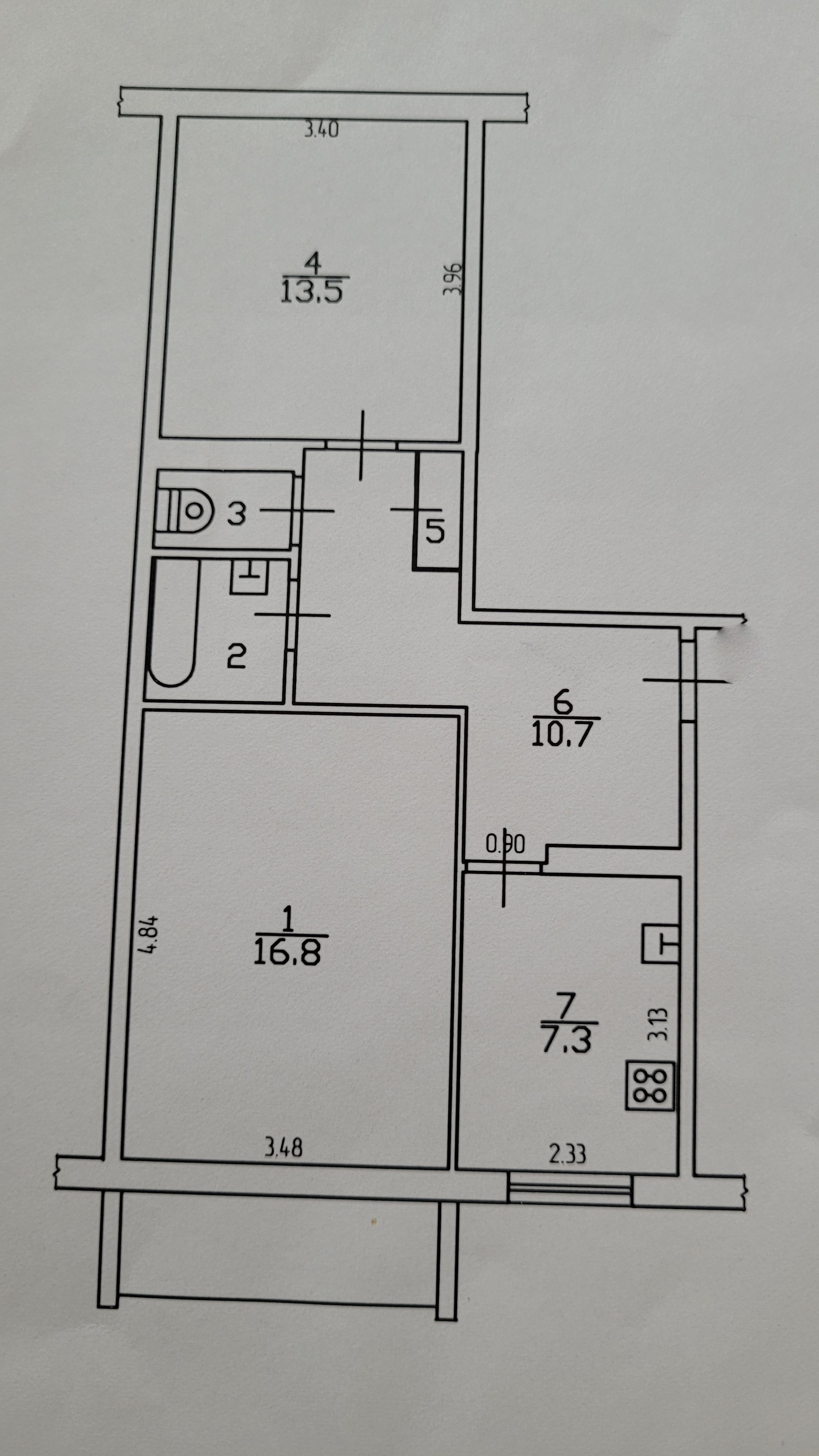 Общая площадь квартиры 53,1квм, комнаты 16,8 и 13,5 квм, благоустроенный балкон.