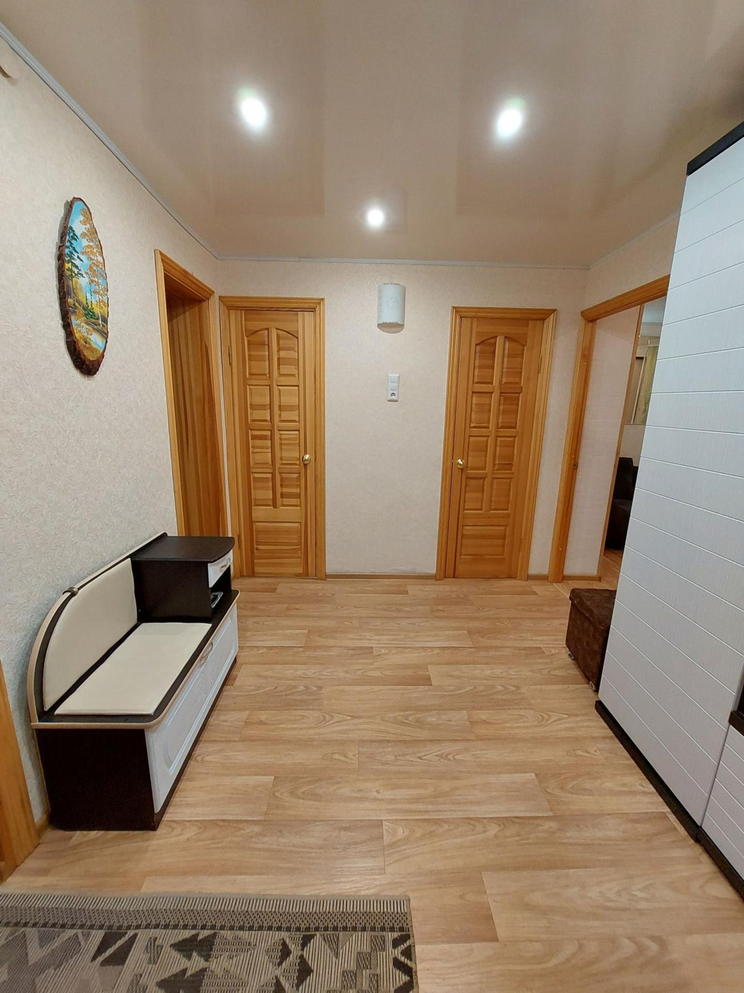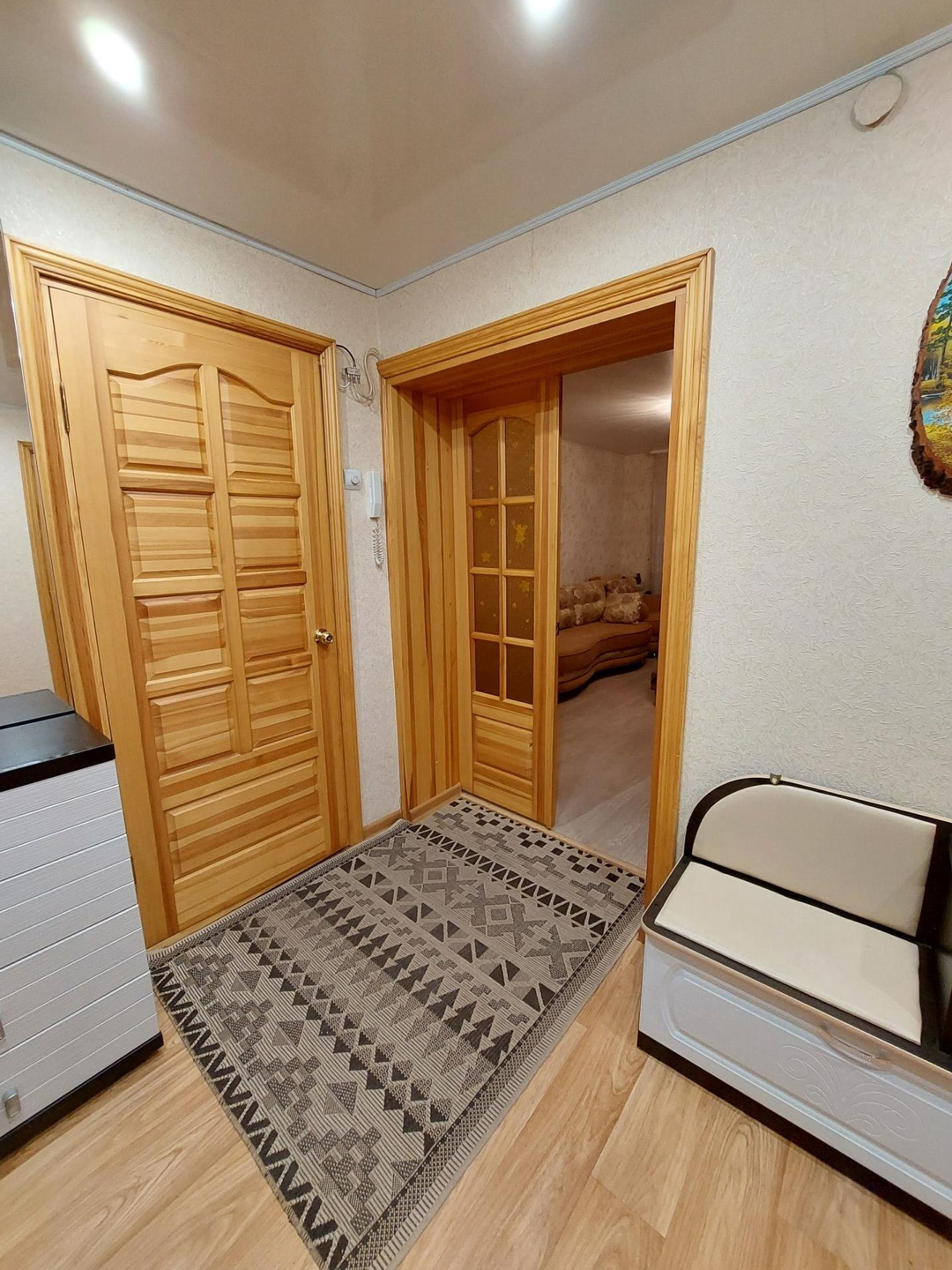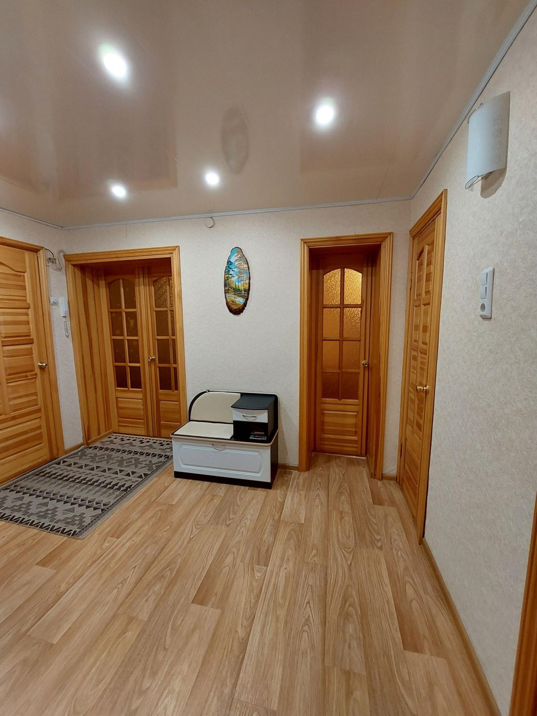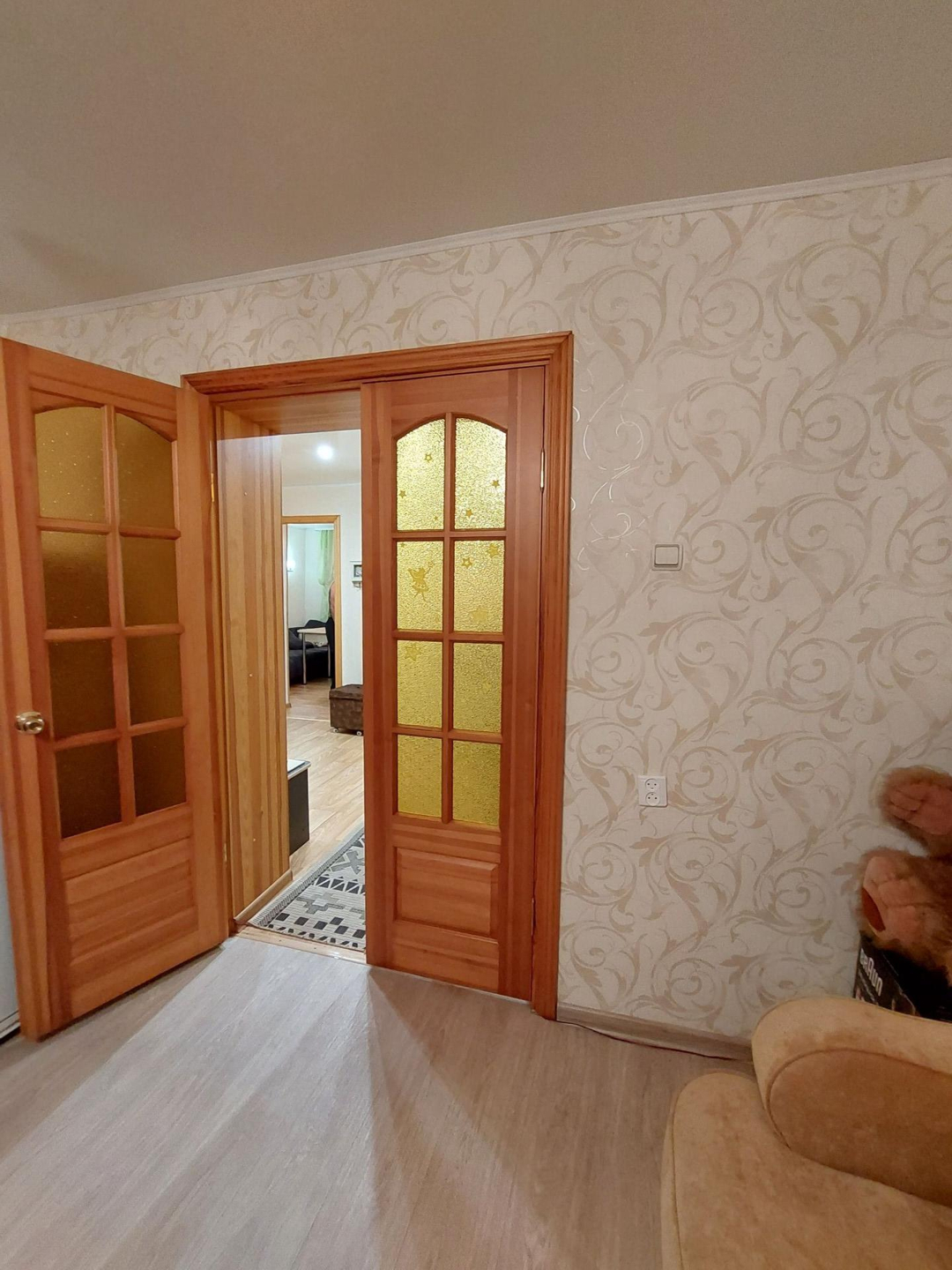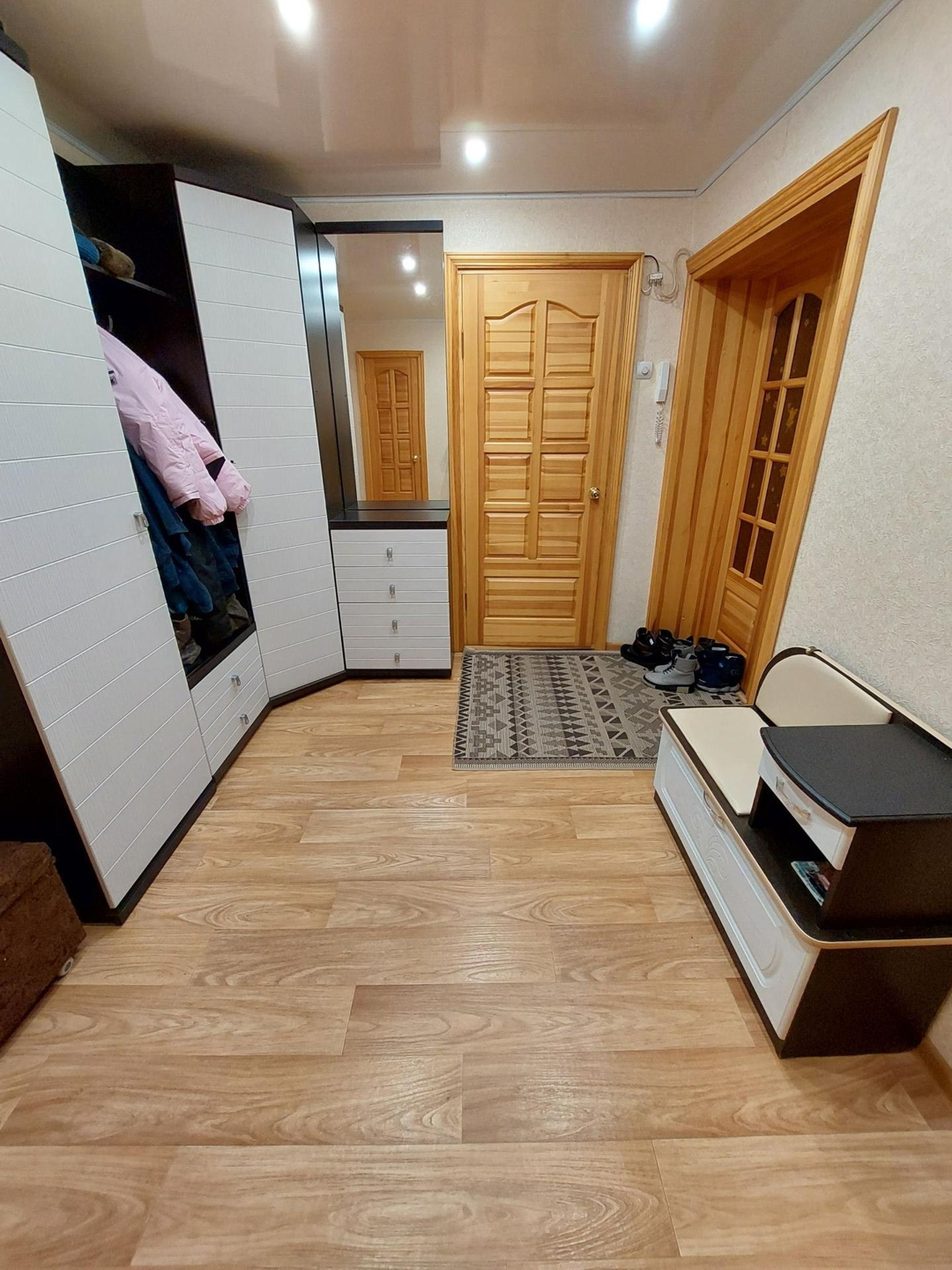 В квартире установлены ст/пакеты, межкомнатные двери из натурального дерева, потолки натяжные, сан/узел раздельный, установлены водо-счетчики, в ванной комнате отделка кафельной плиткой.