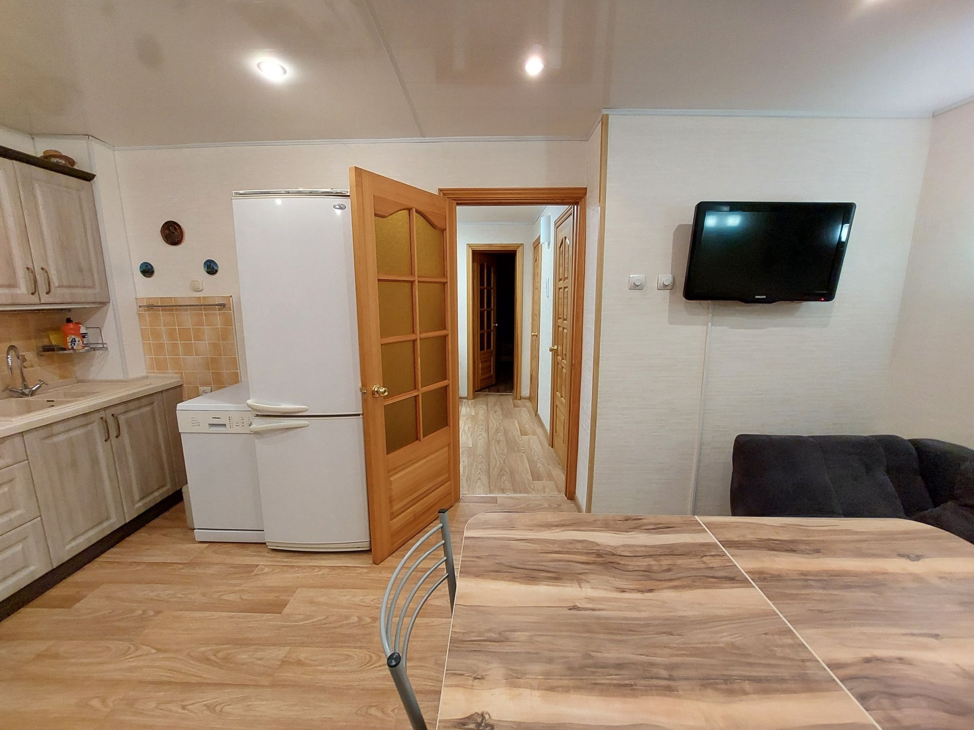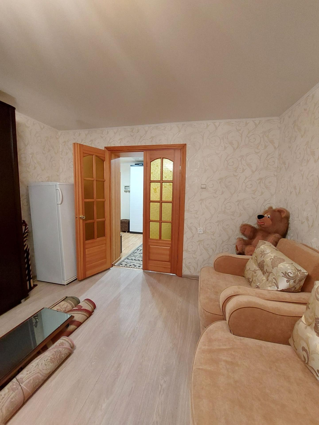 Из мебели остаётся кухонный гарнитур, прихожая, шкаф в спальне и мебельная стенка в гостинной.