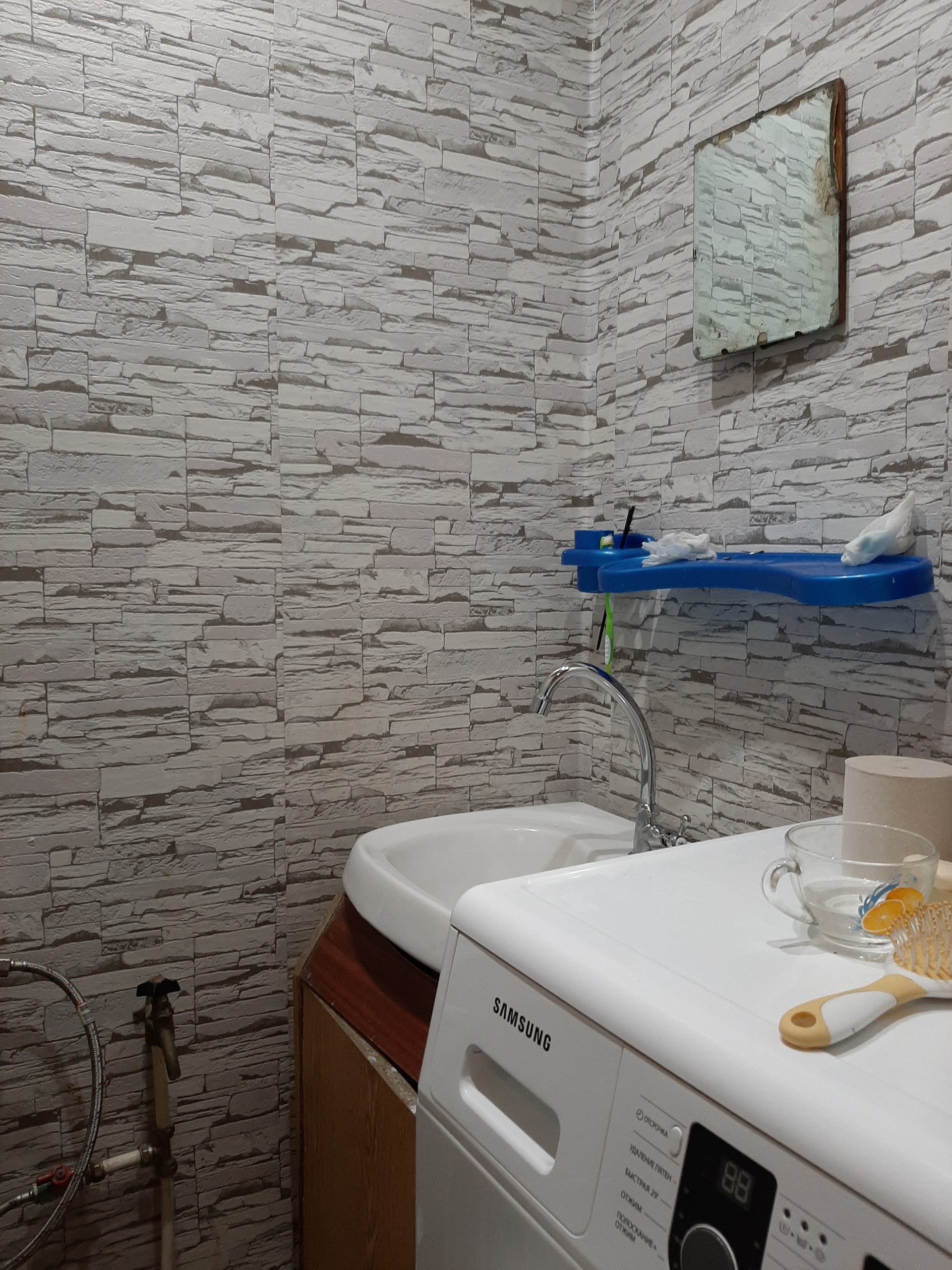 На полу-ДСП,линолеум,в ванной комнате уместилась стиральная машина,санузел и зона для умывания. Квартира очень теплая и сухая.