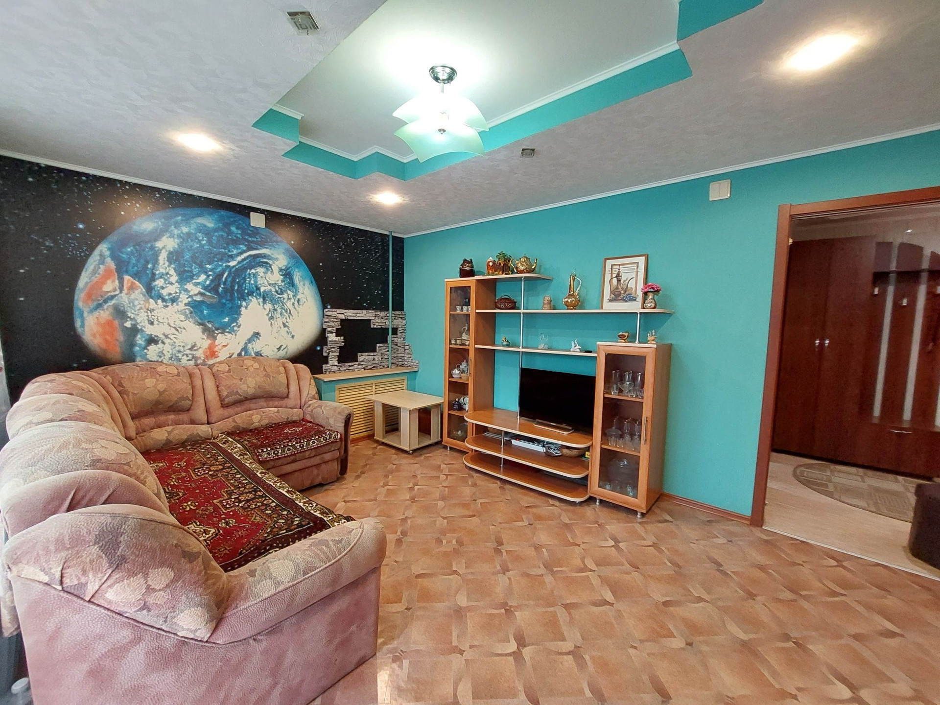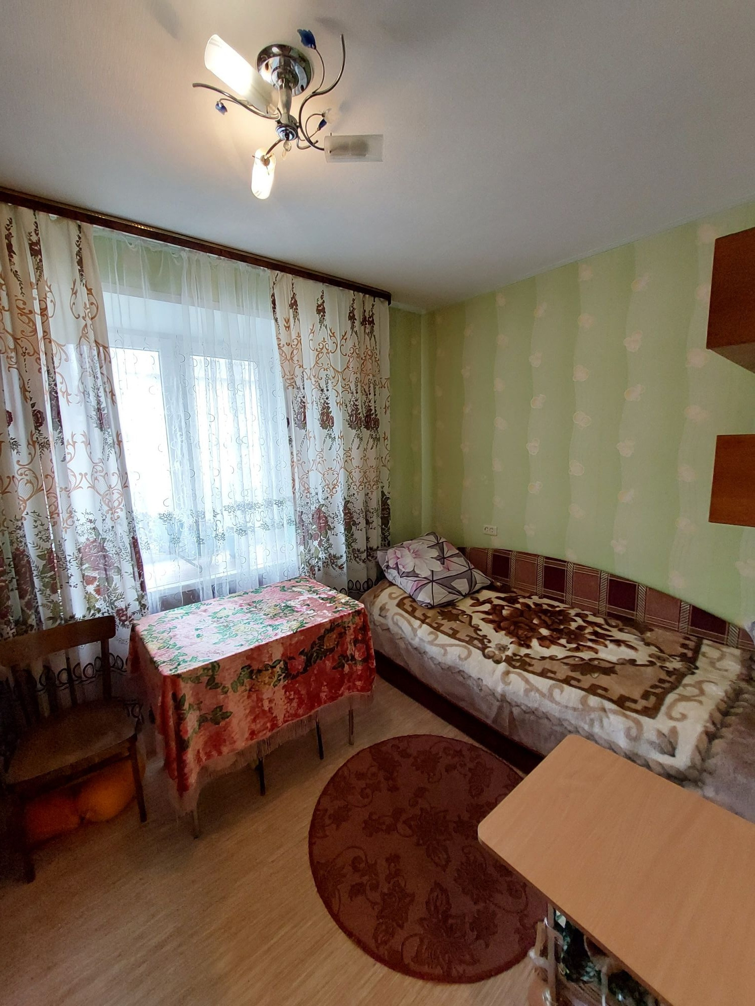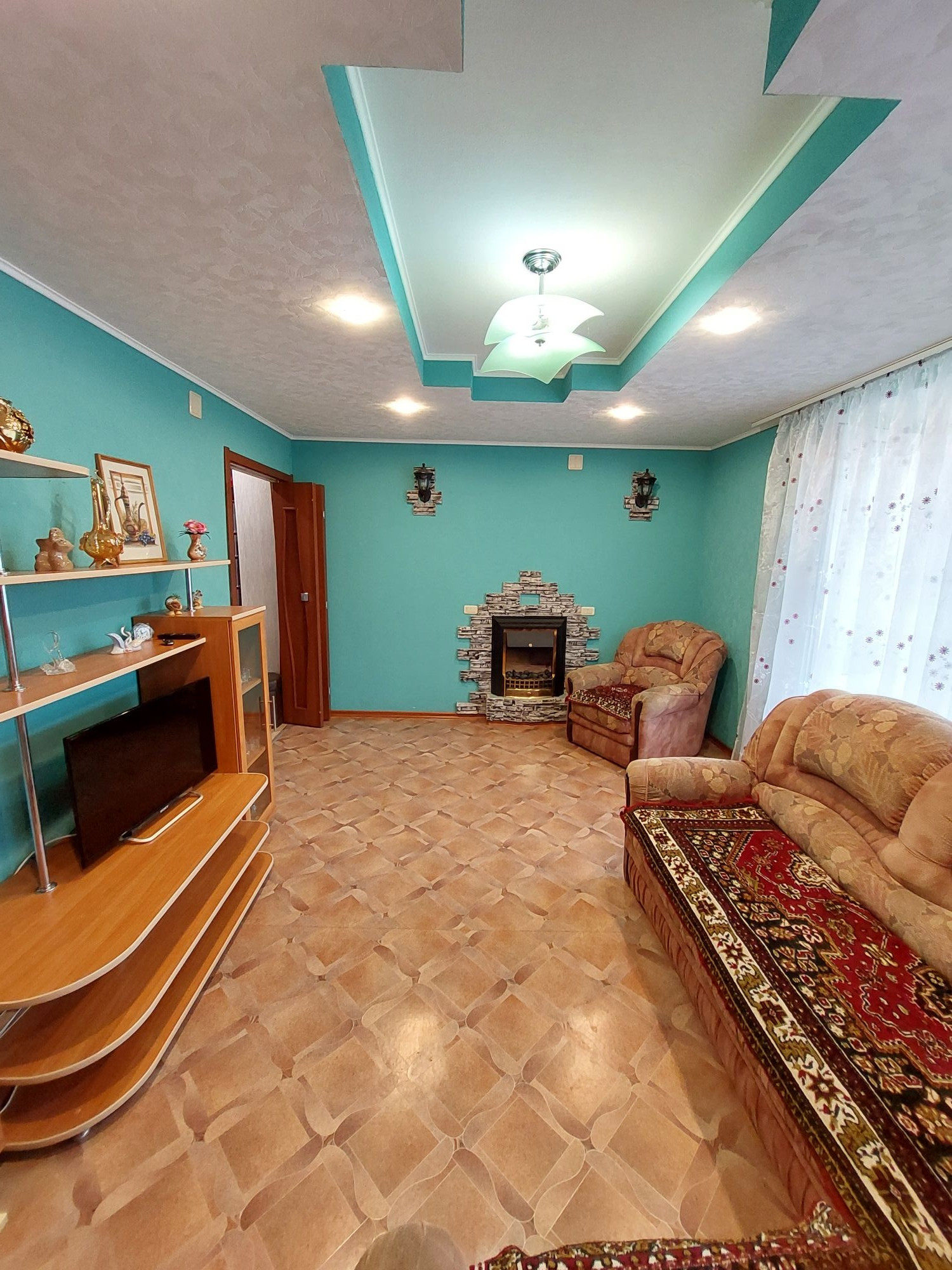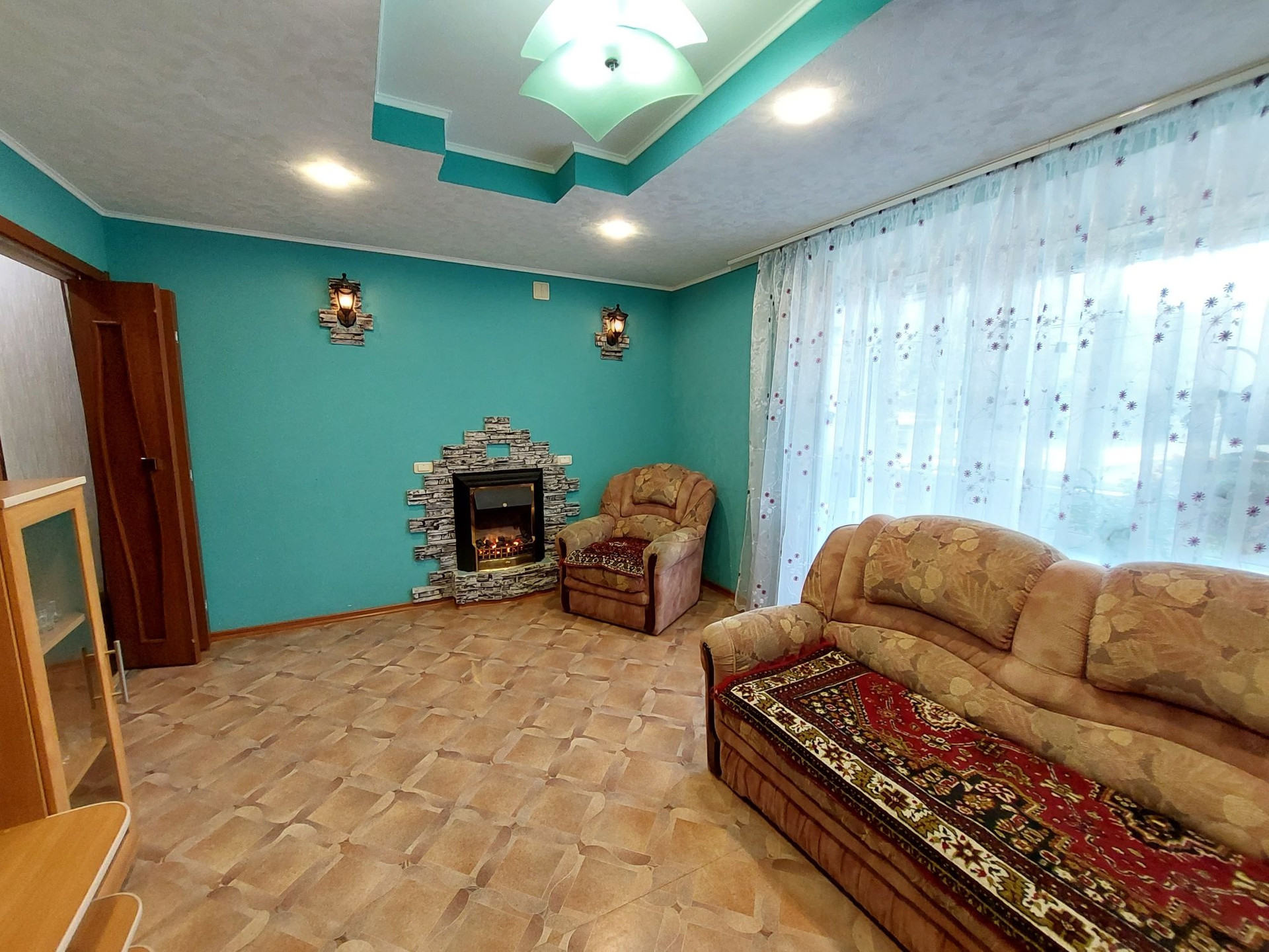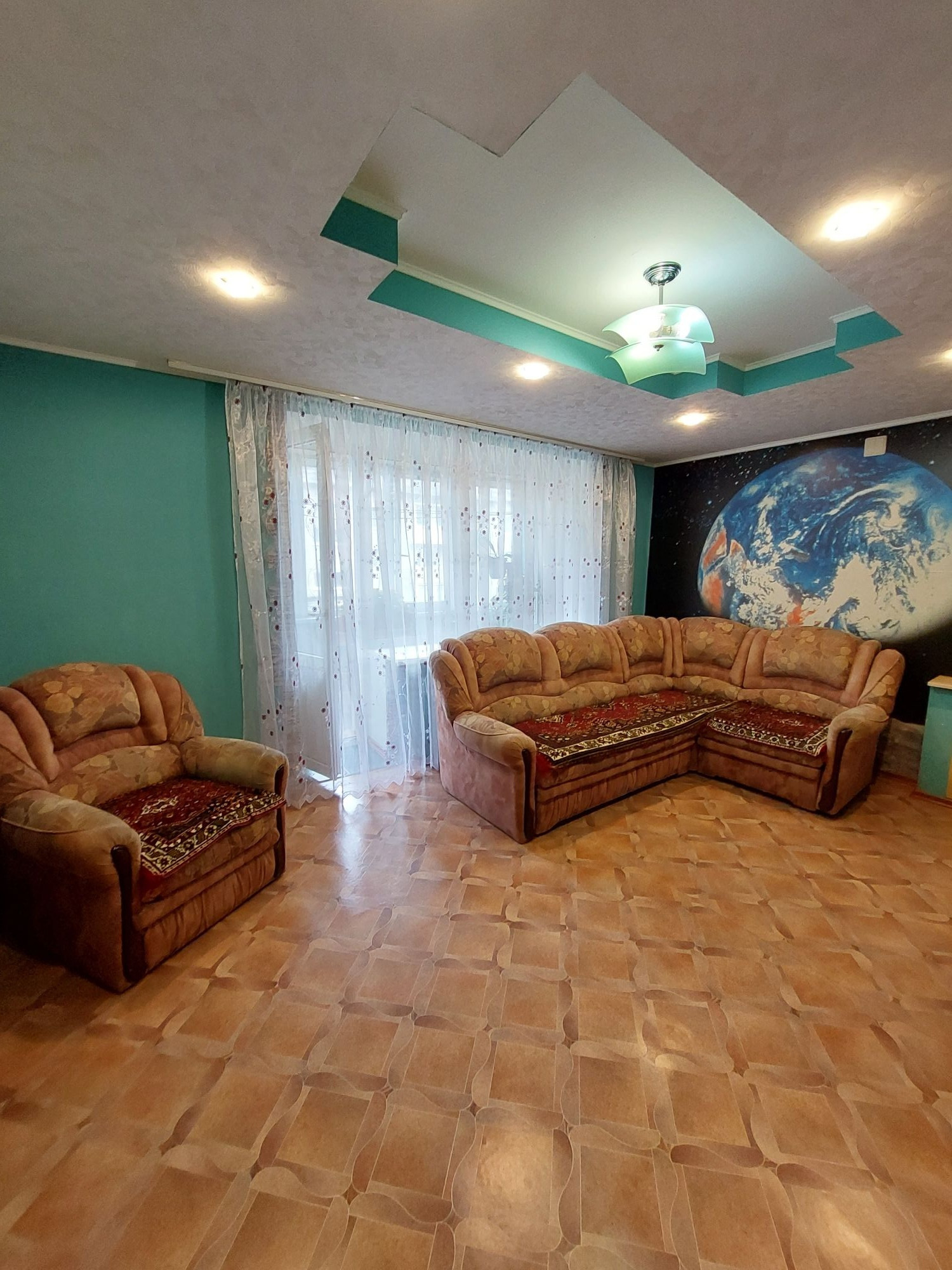 Цветовую гамму стен сможете изменить в любой момент, так как на стенах обои под покраску, полы покрыты линолеумом. Потолки подвесные с дополнительным освящением.