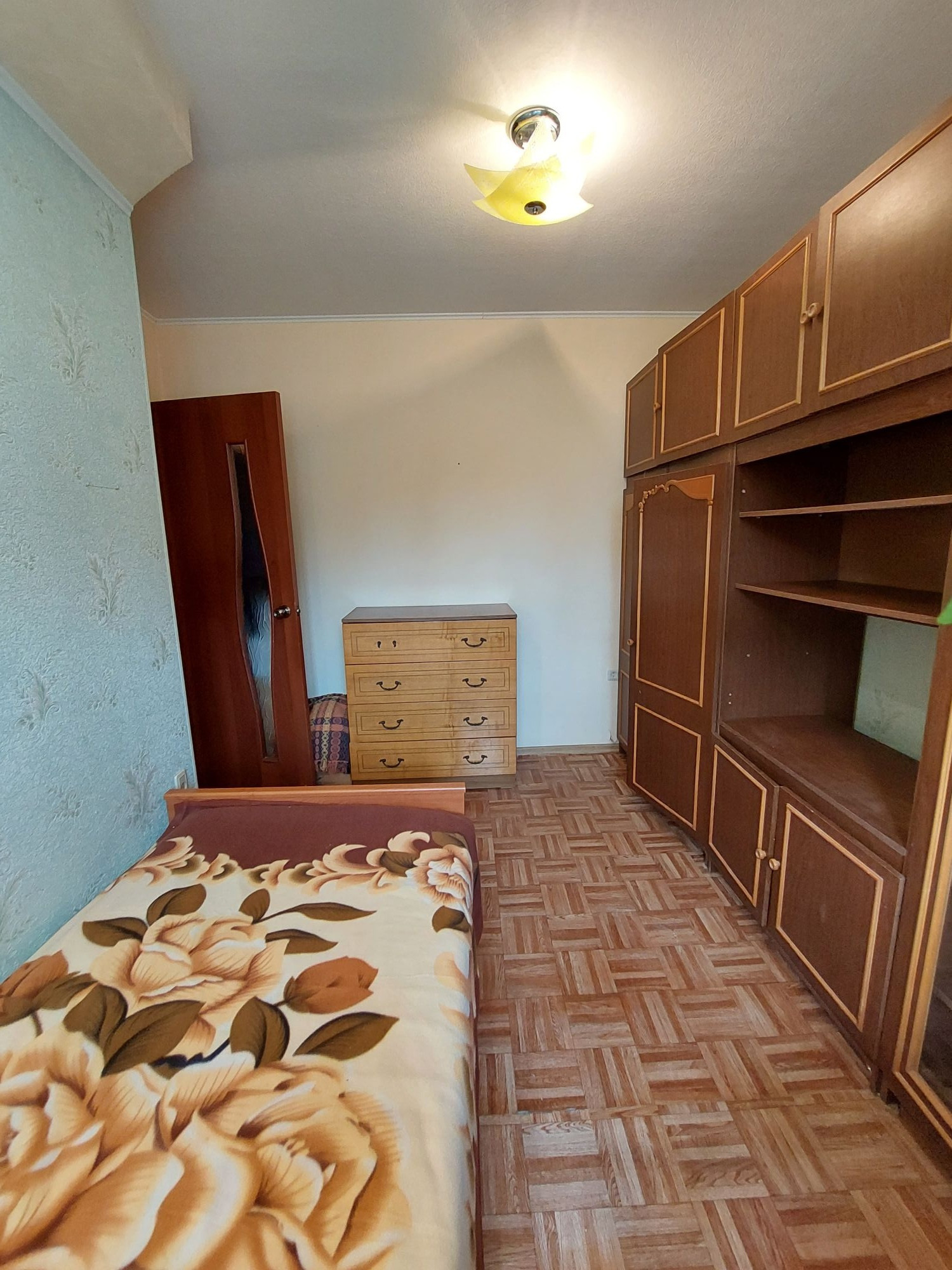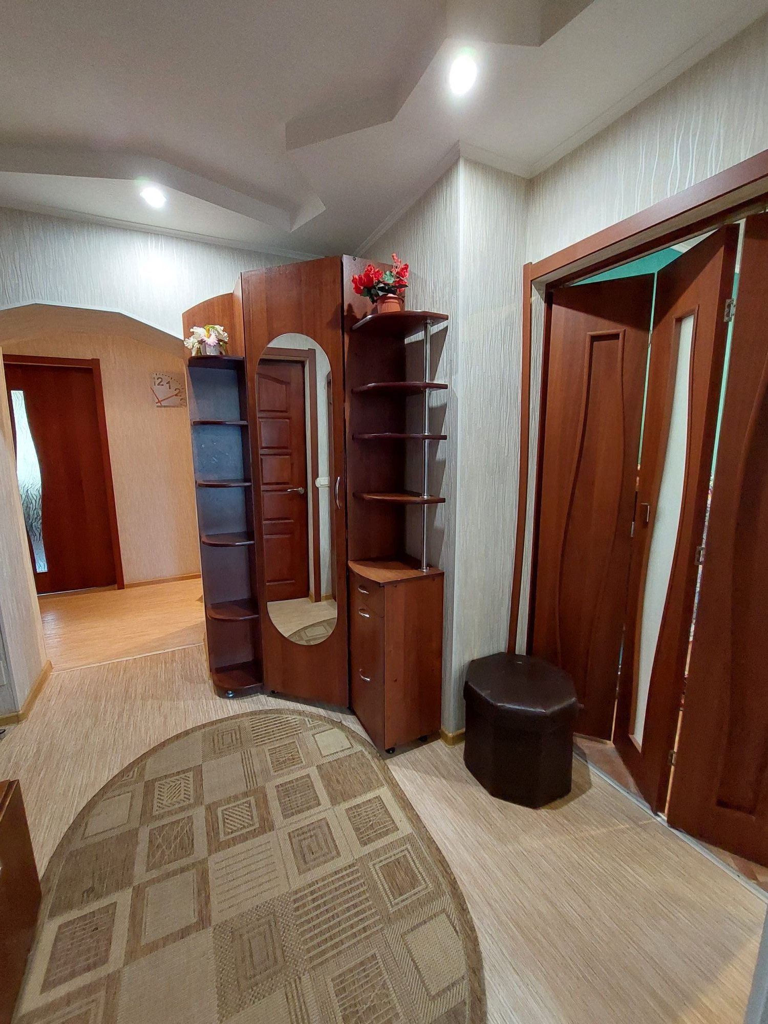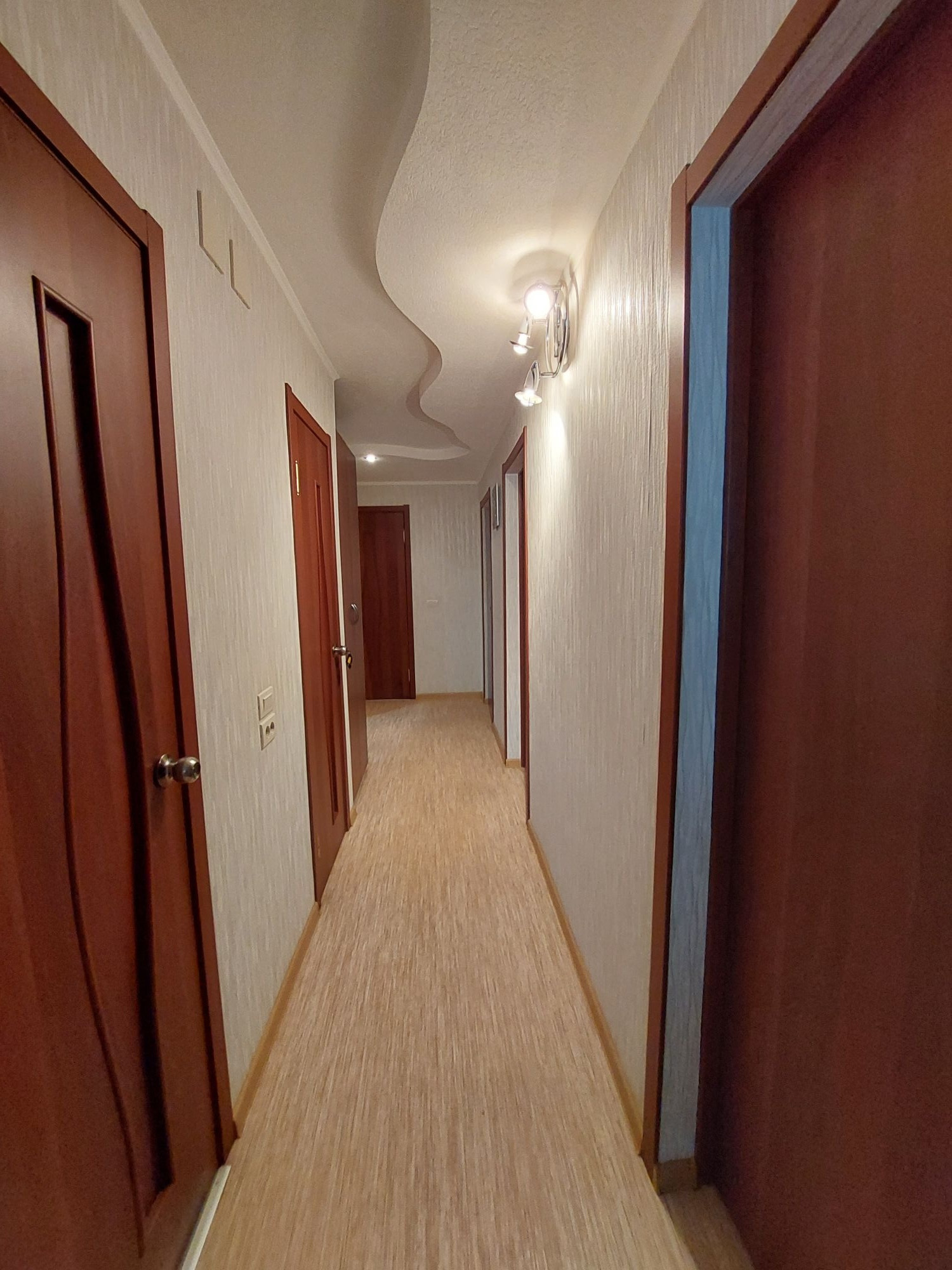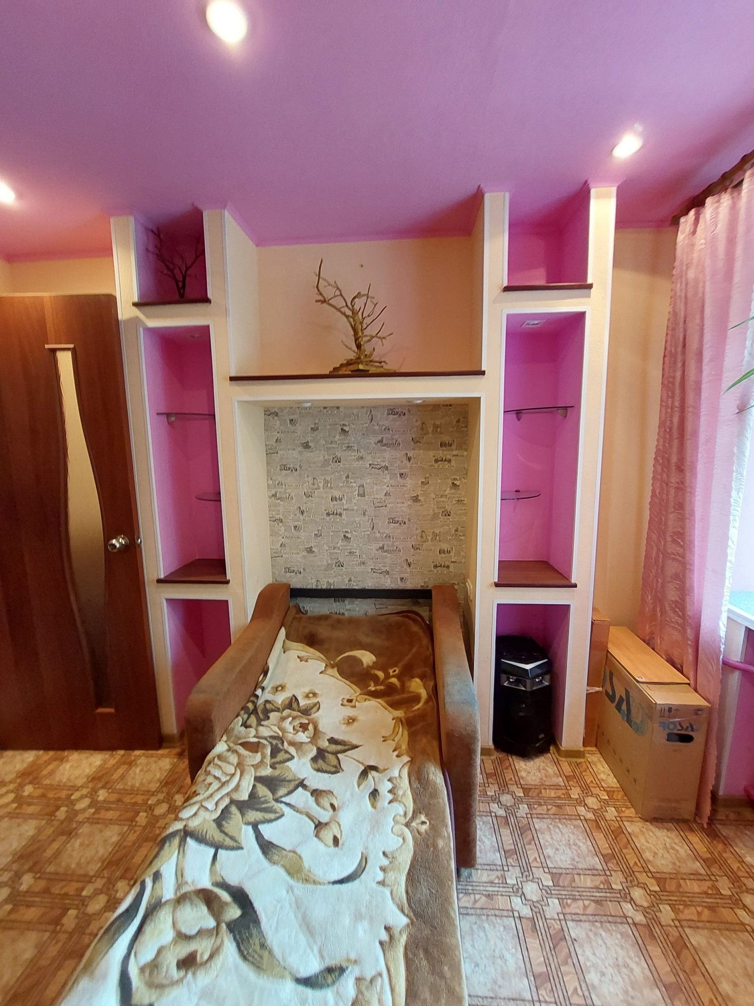 Цветовую гамму стен сможете изменить в любой момент, так как на стенах обои под покраску, полы покрыты линолеумом. Потолки подвесные с дополнительным освящением.