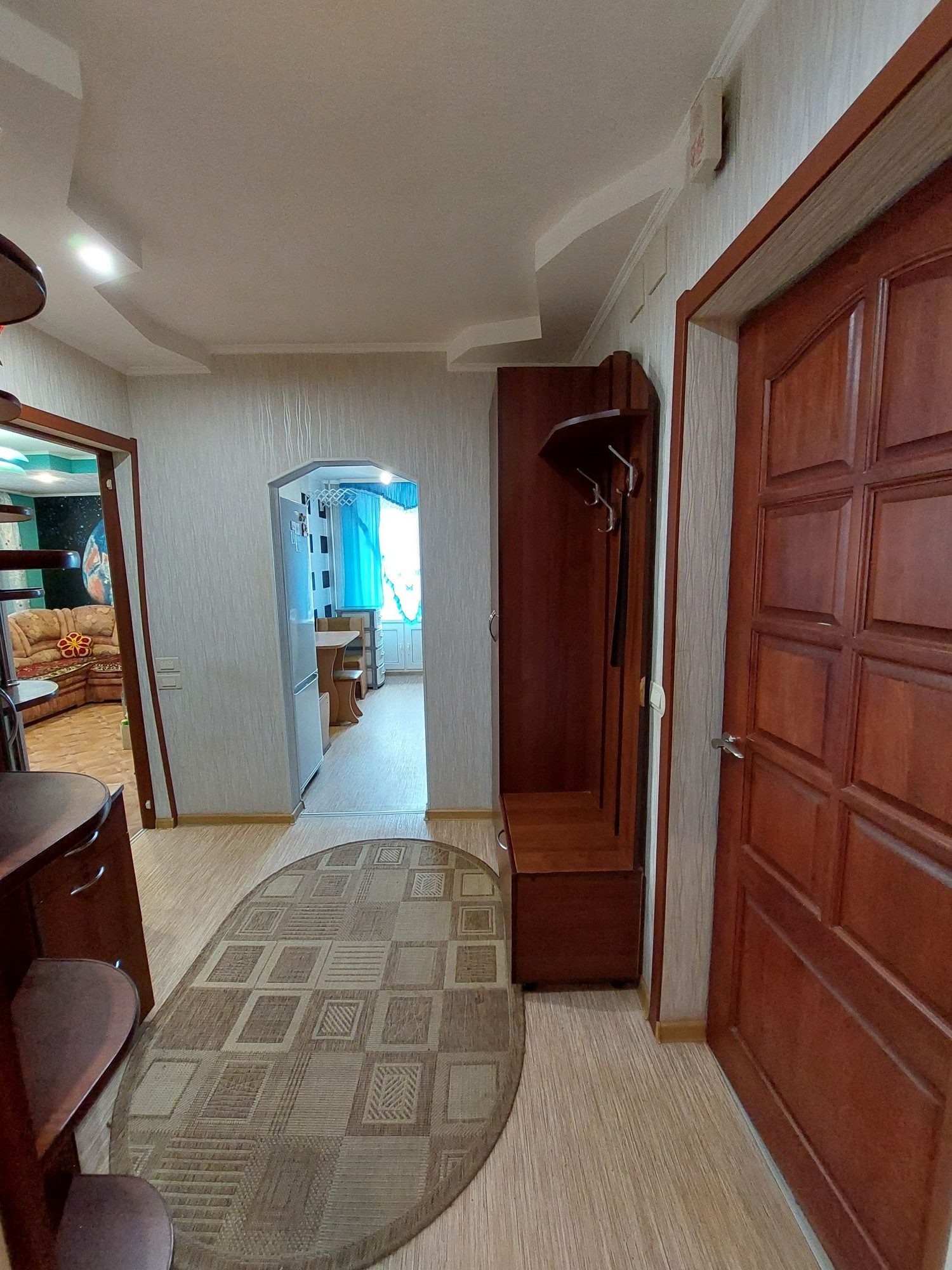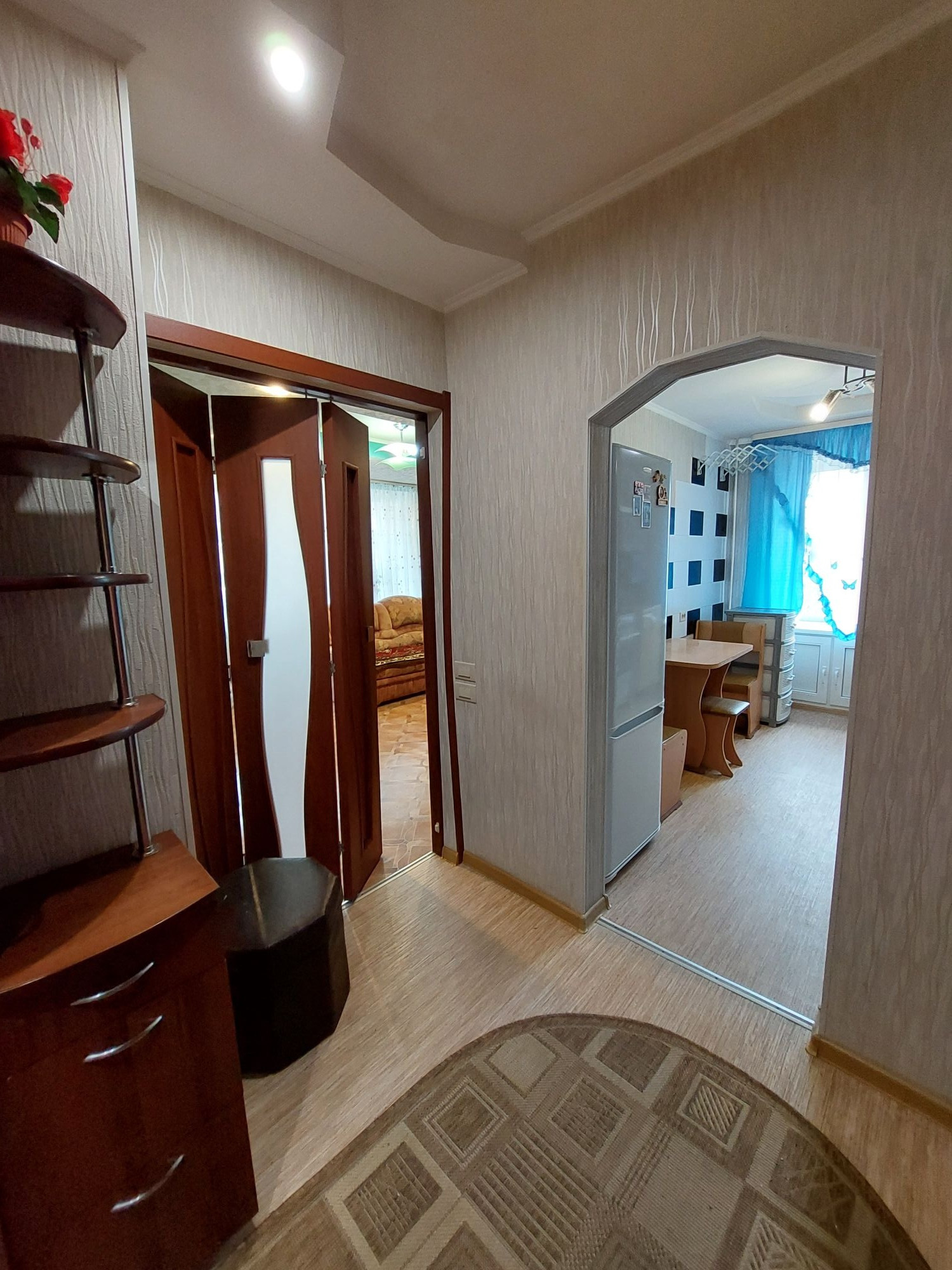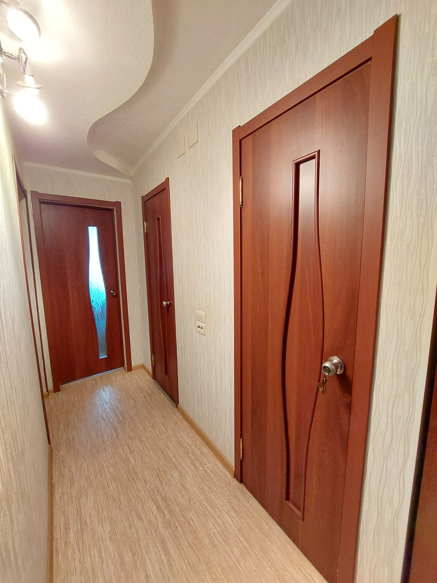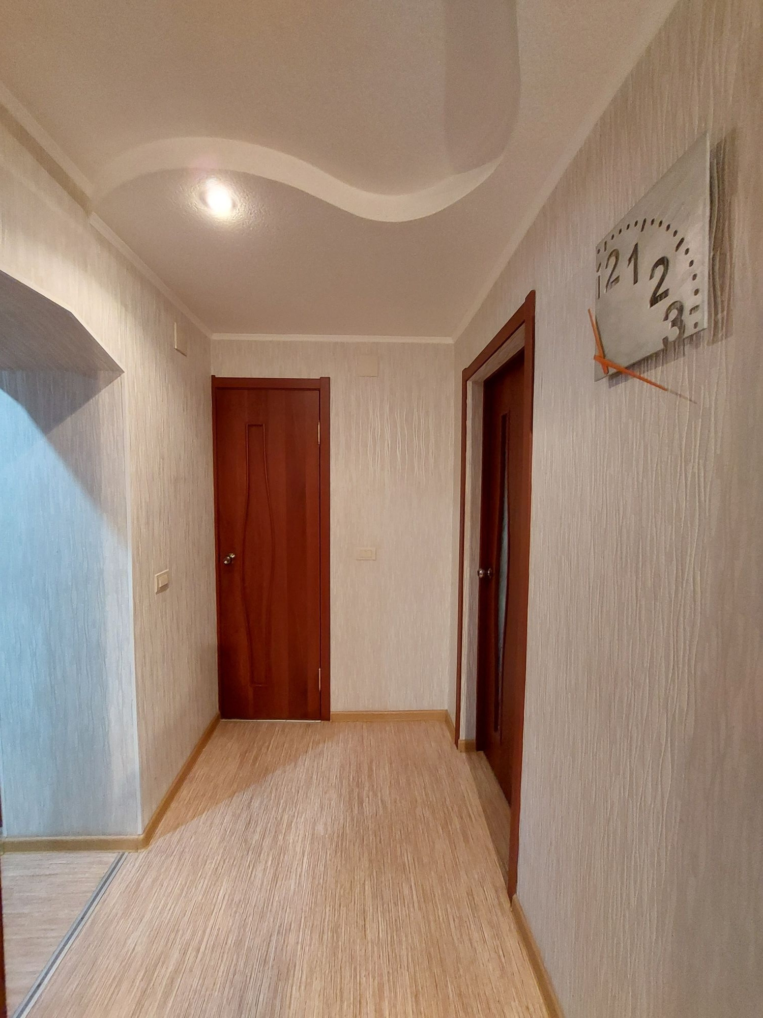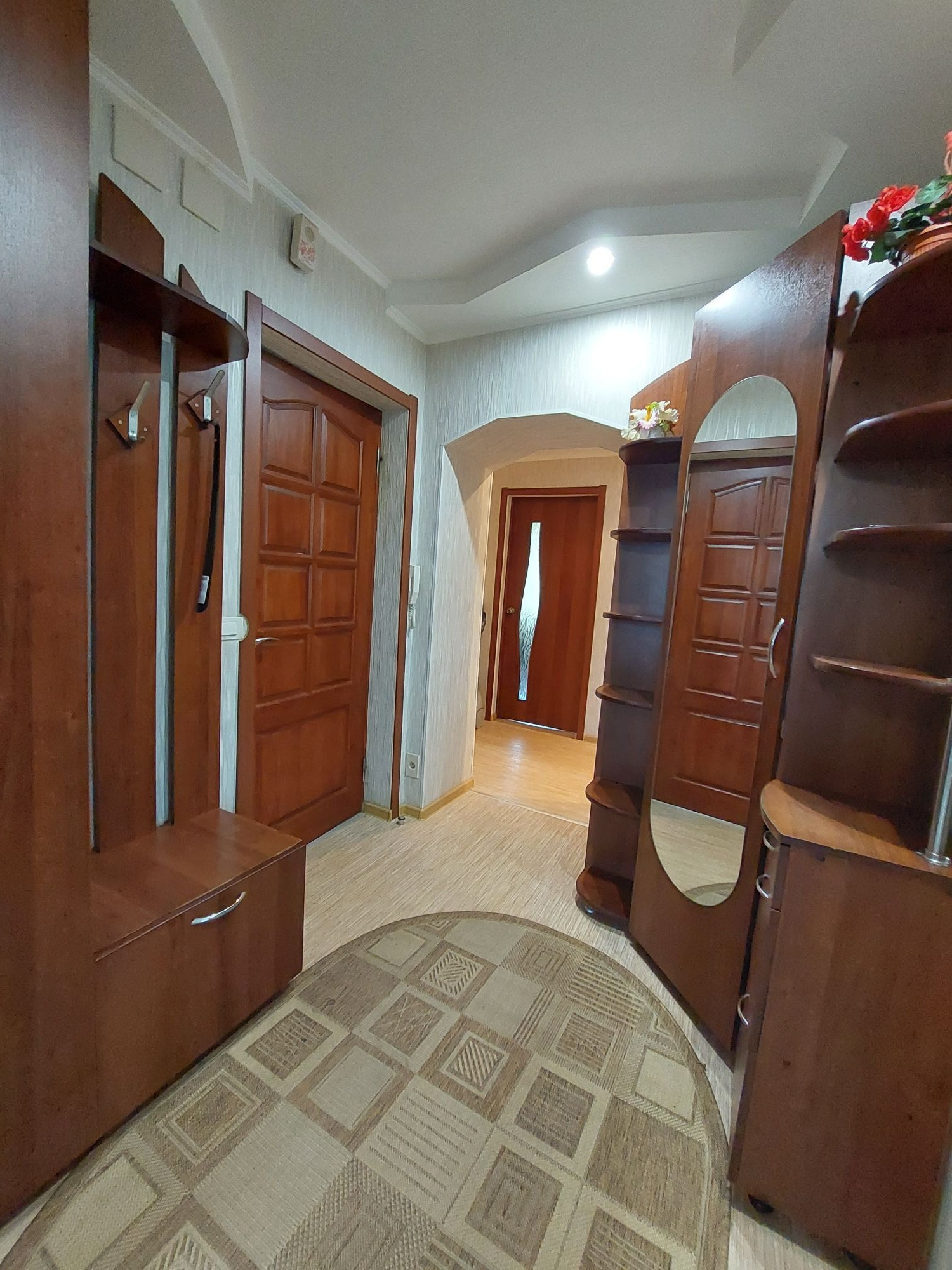 Цветовую гамму стен сможете изменить в любой момент, так как на стенах обои под покраску, полы покрыты линолеумом. Потолки подвесные с дополнительным освящением.