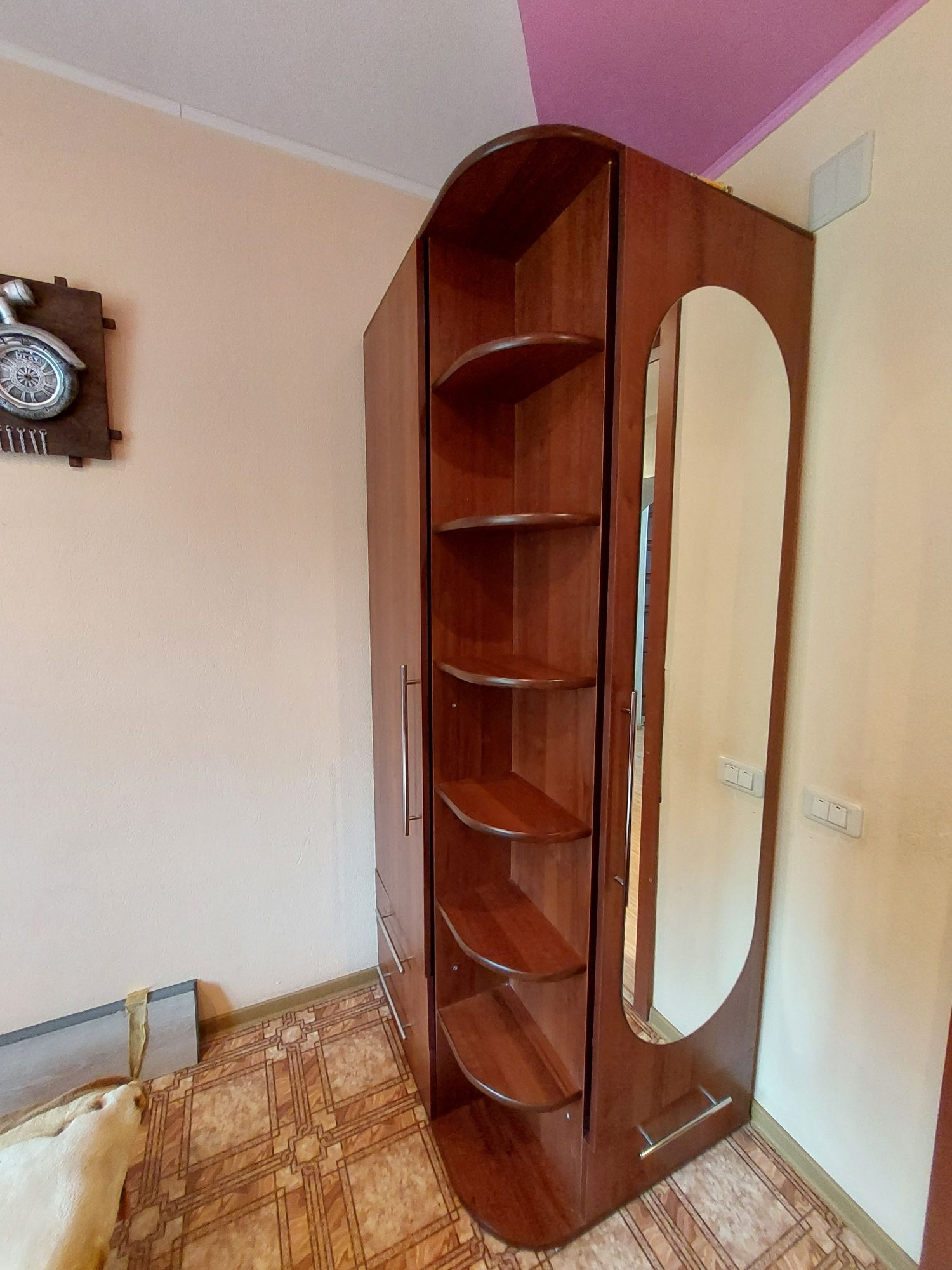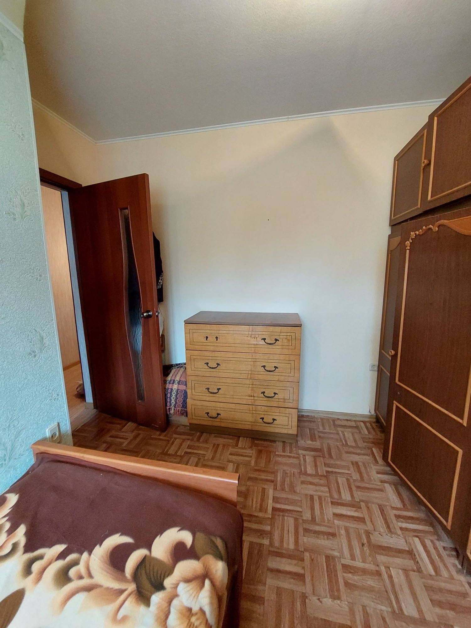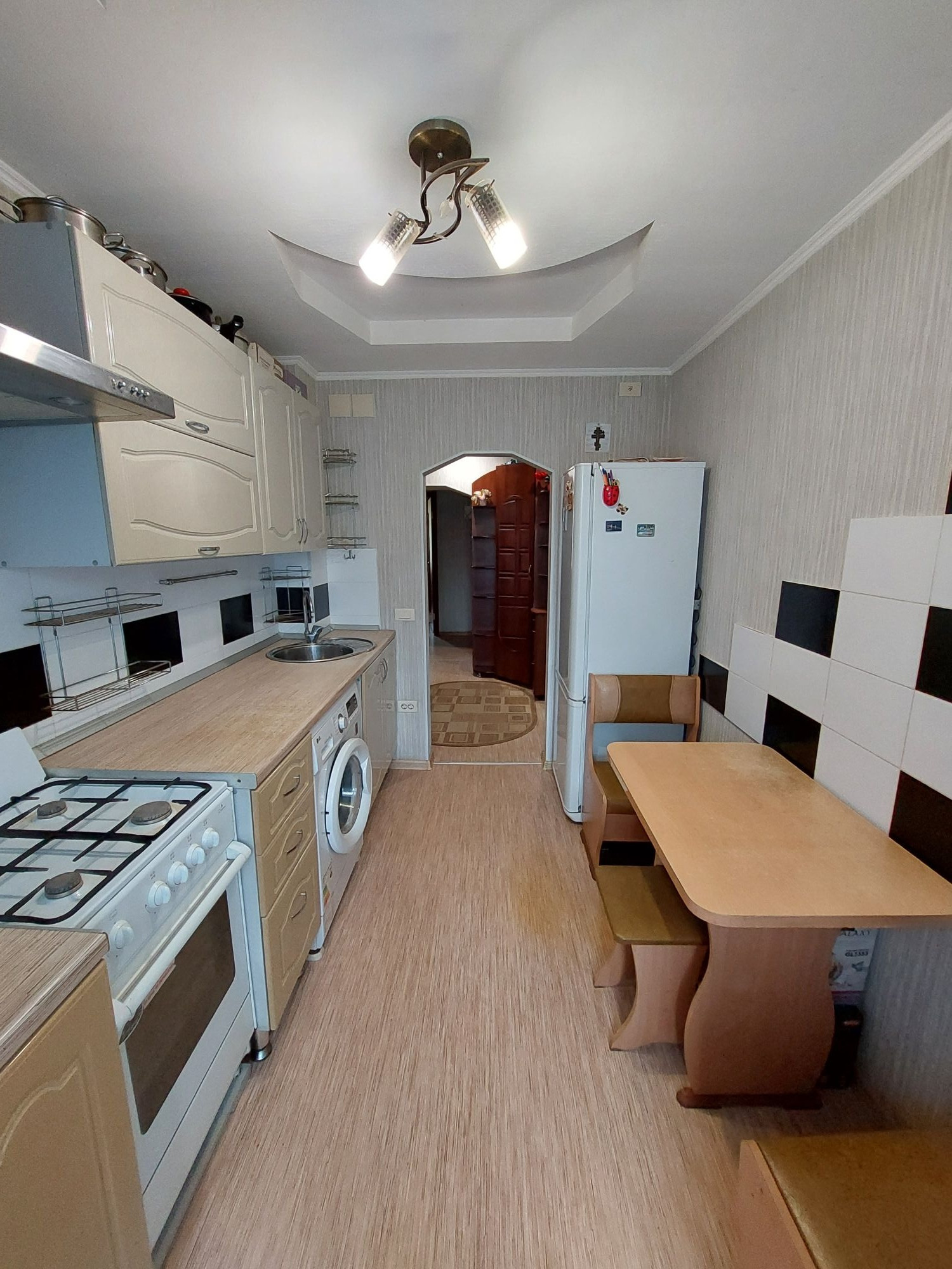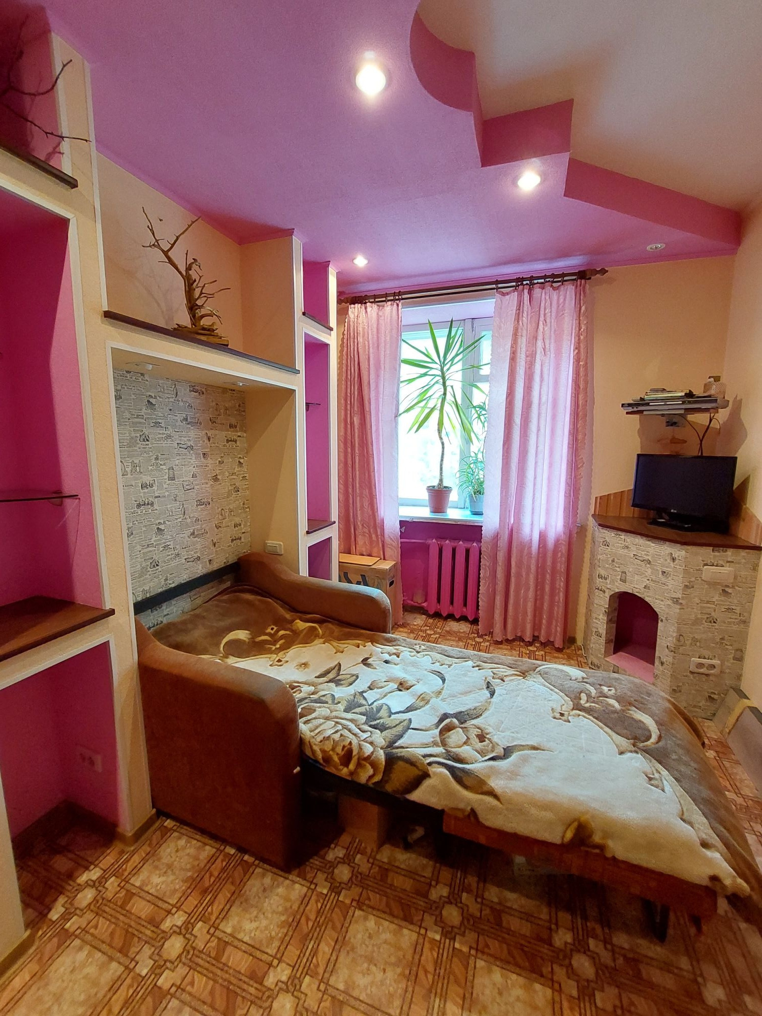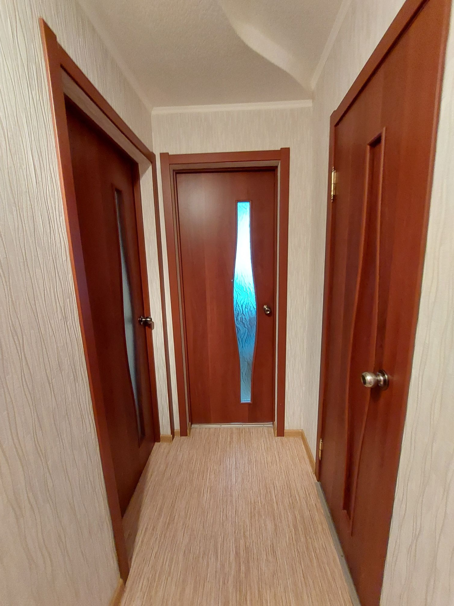 Цветовую гамму стен сможете изменить в любой момент, так как на стенах обои под покраску, полы покрыты линолеумом. Потолки подвесные с дополнительным освящением.