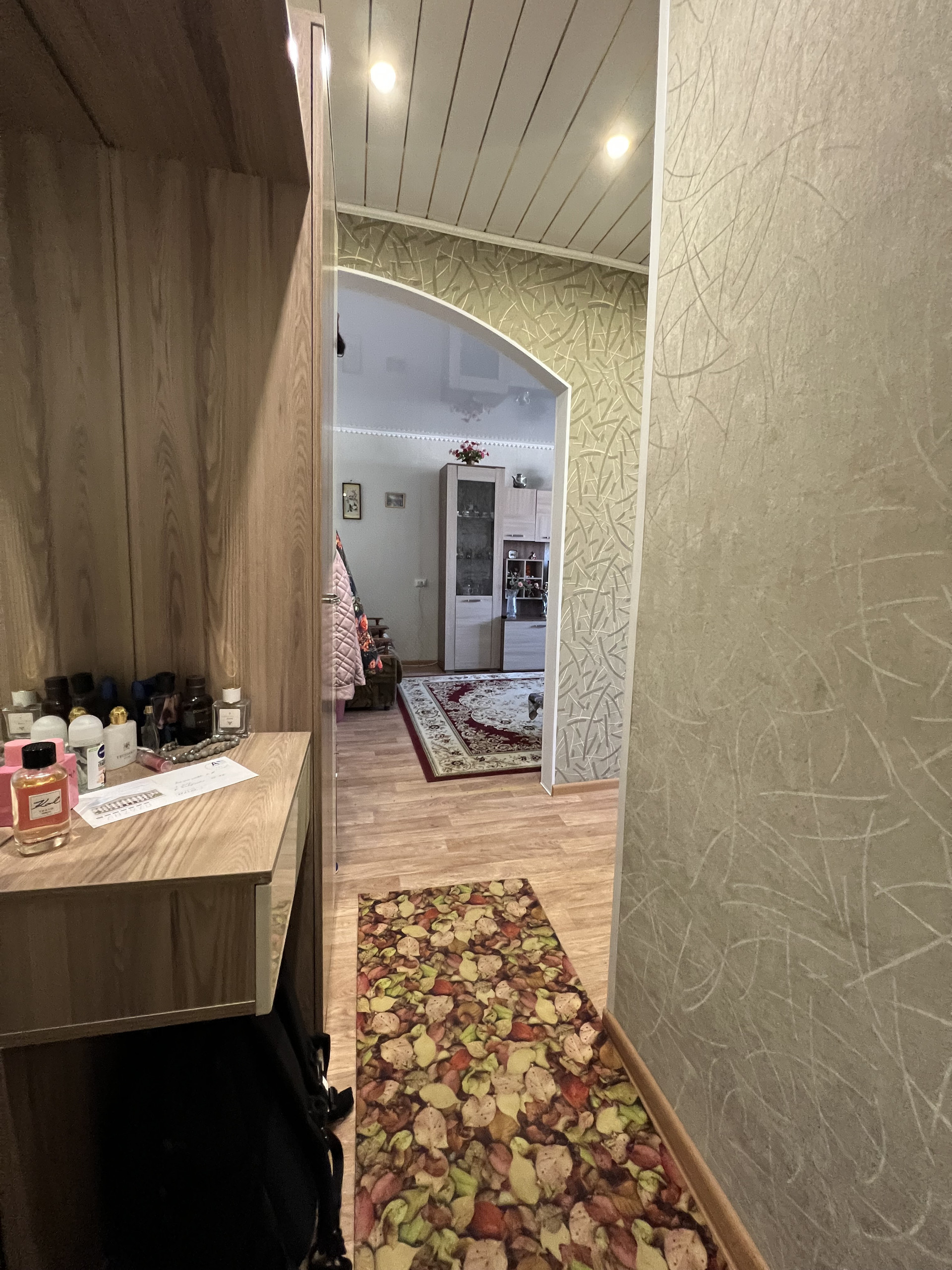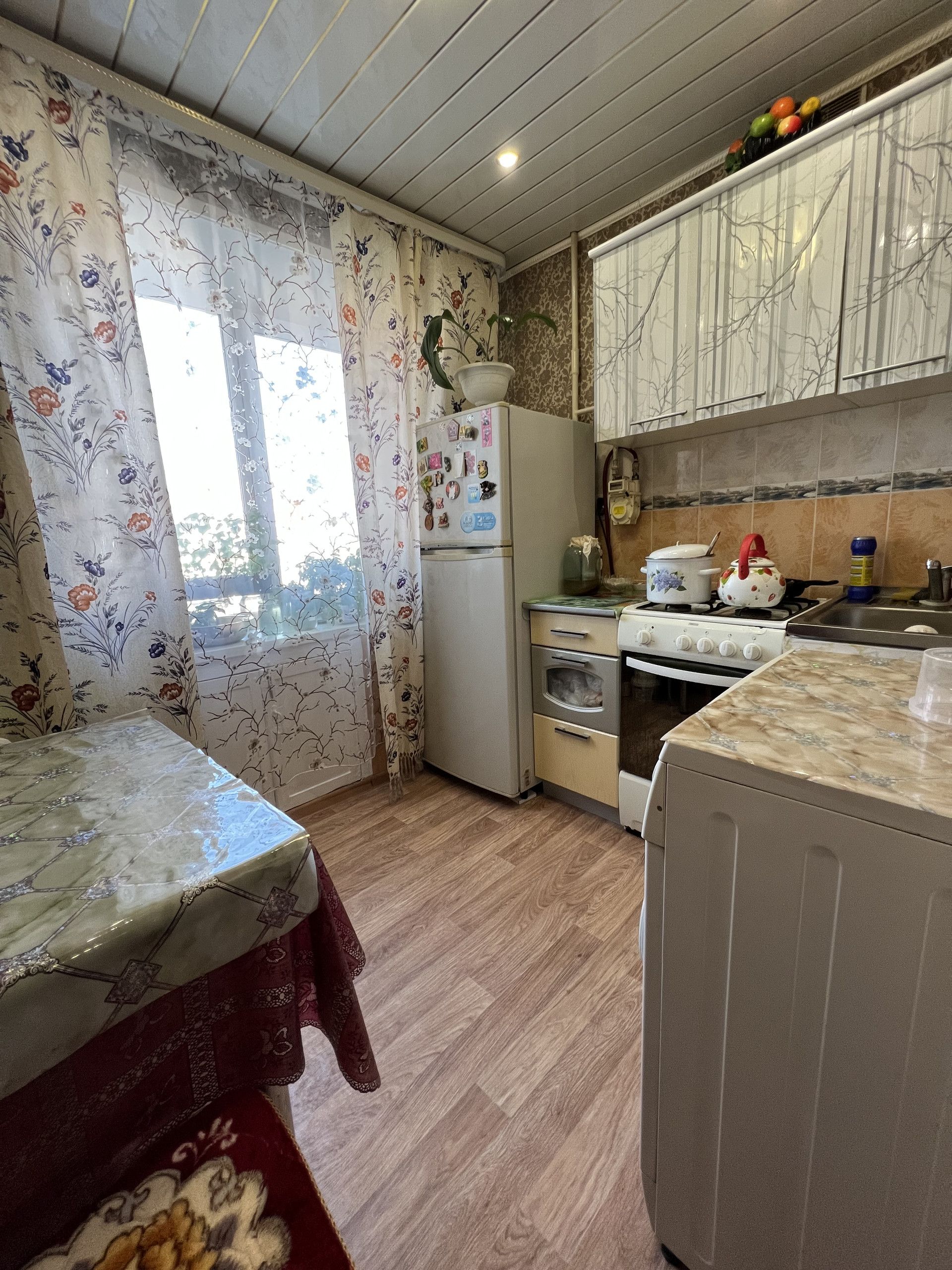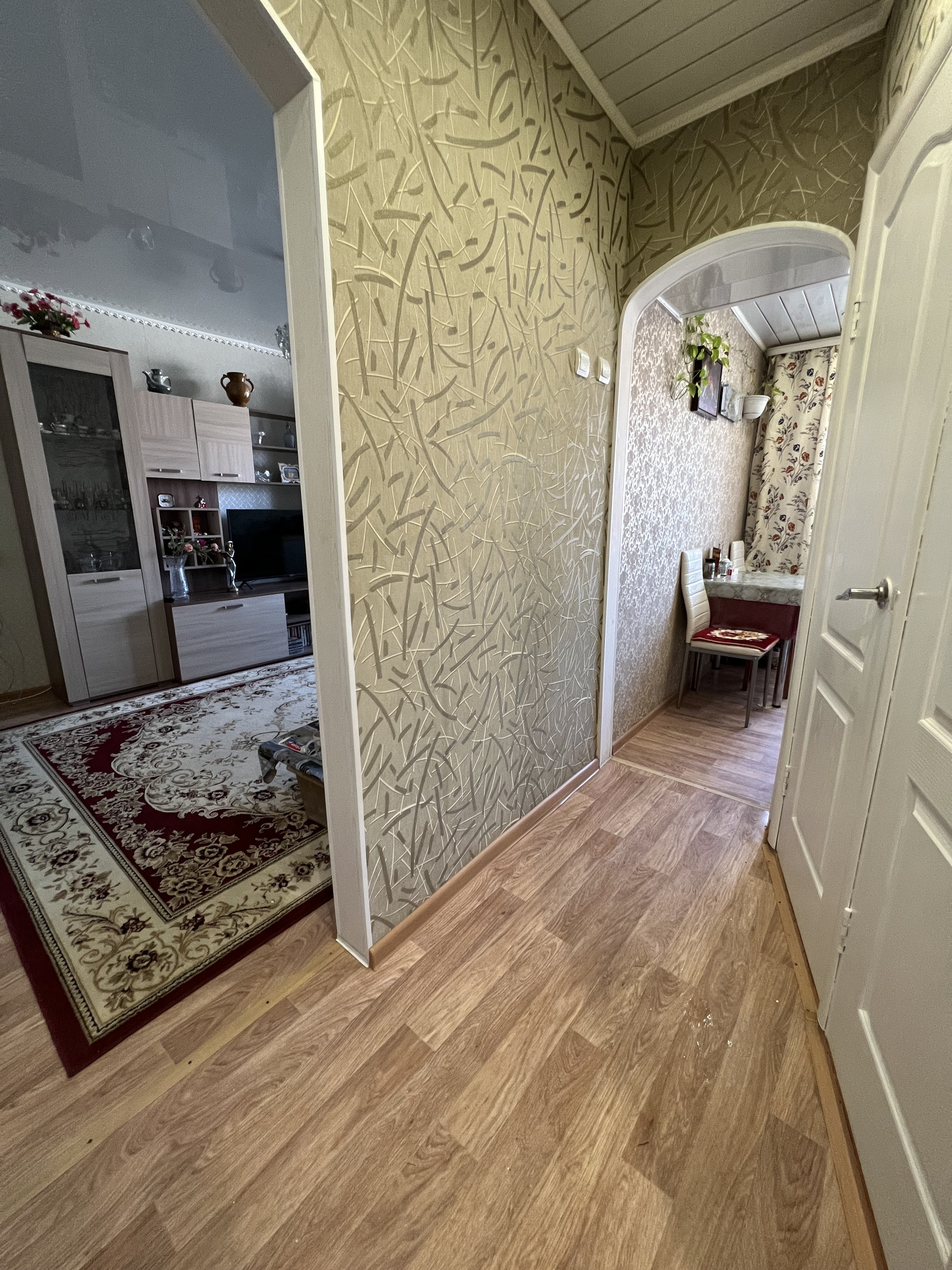 Стены ровные, пол линолеум, в ванной и туалете стены и пол - кафель, потолки в комнатах натяжные, в остальных помещениях-рейка с софитами.