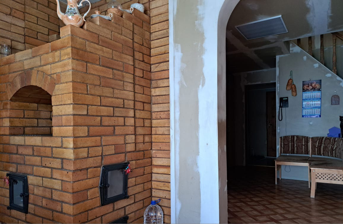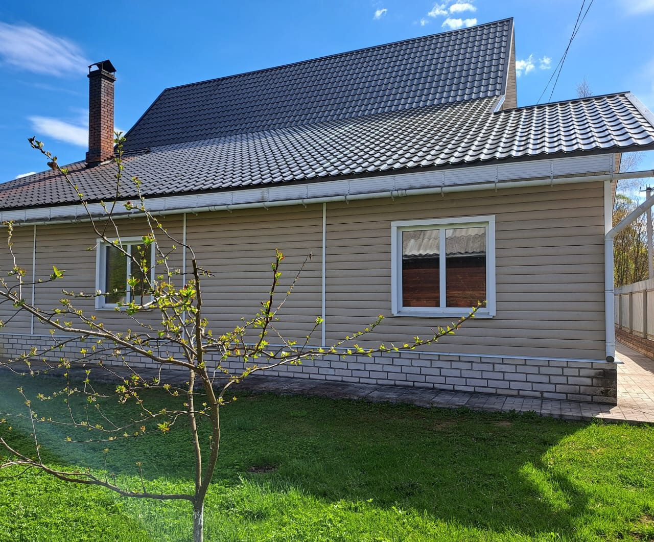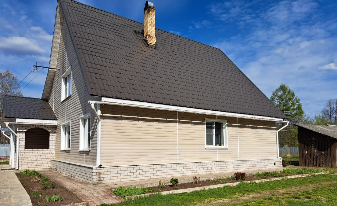 Первый этаж дома рубленное бревно, второй – брус 150*150. Дом утеплен и обшит сайдингом. Крыша двускатная покрыта финской металлочерепицей, окна -  двухкамерные энергосберегающие стеклопакеты, фундамент - ленточный.