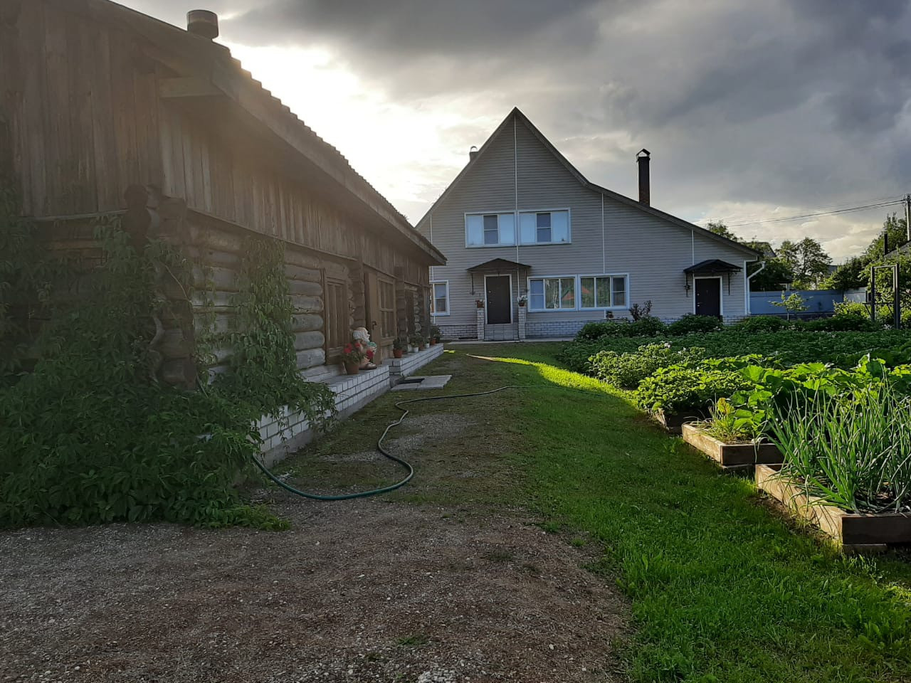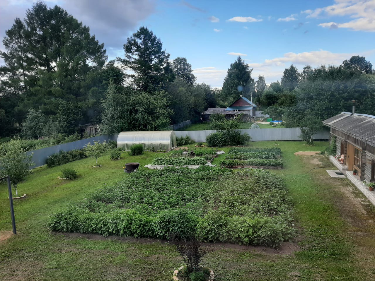 Для обслуживания имеется хозяйственный заезд. На участке растут плодово-ягодные деревья и кустарники (яблони, груша, орех, сливы, вишня, смородина, крыжовник, малина, жимолость), многолетние цветы. Разработан огород и на бетонном фундаменте установлена теплица. С южной стороны дома находится зона декоративных кустарников и небольшой пруд.
