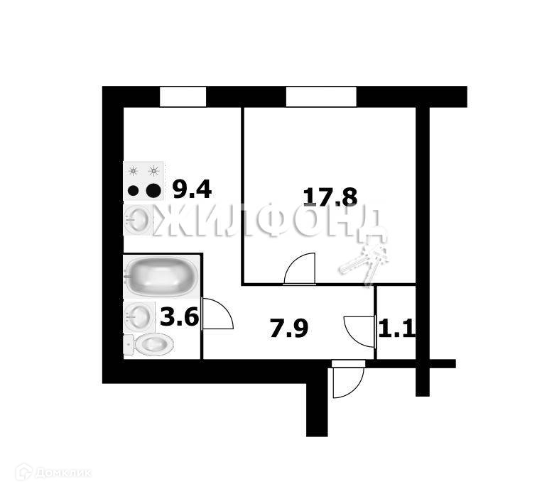 Планировка: жилая комната S17,8 кв.м, просторная кухня 9,4 кв.м, санузел совмещенный, коридор 7,9 кв.м. Отсутствие балкона компенсируется наличием кладовой S1,1 кв.м.