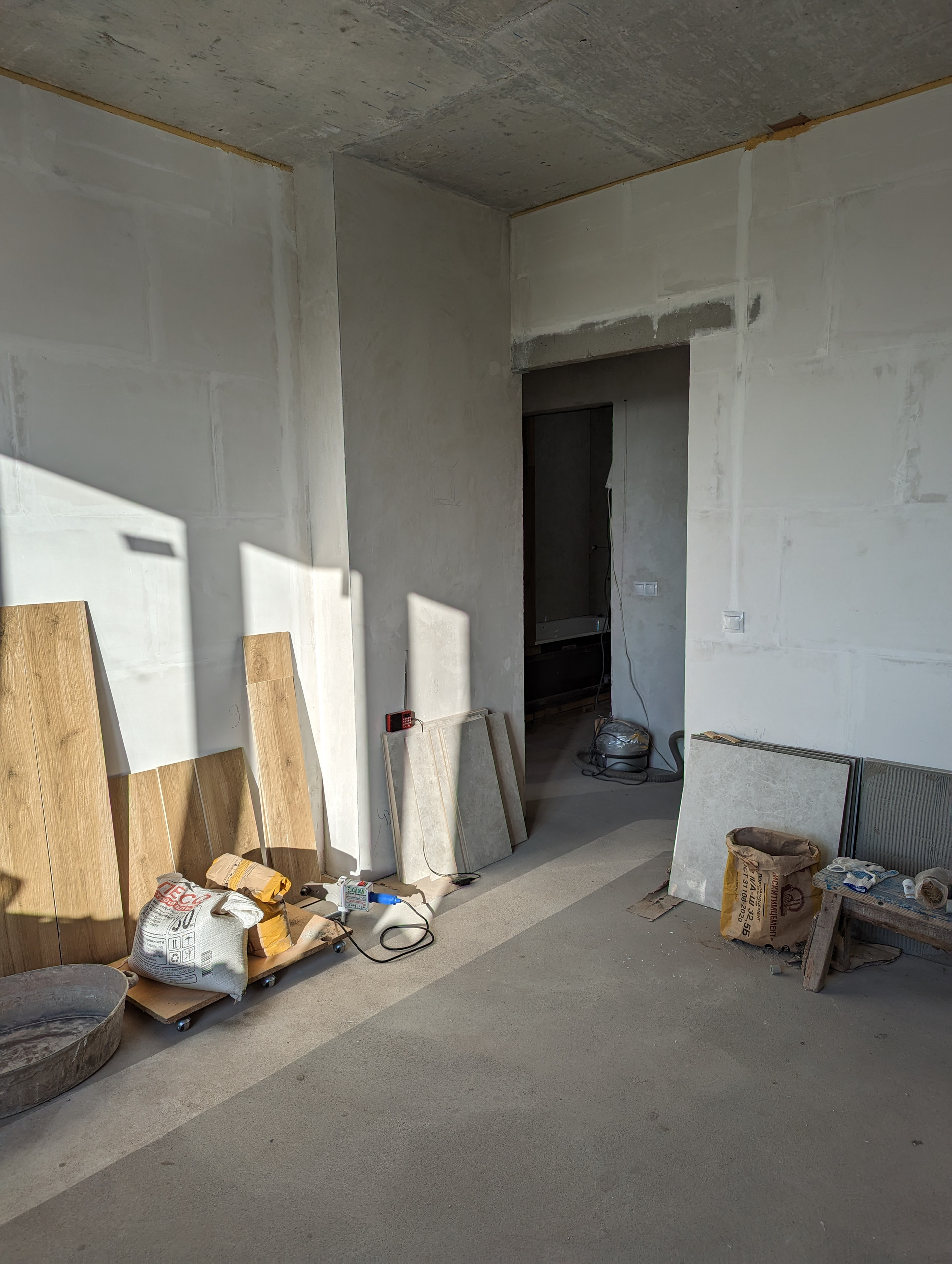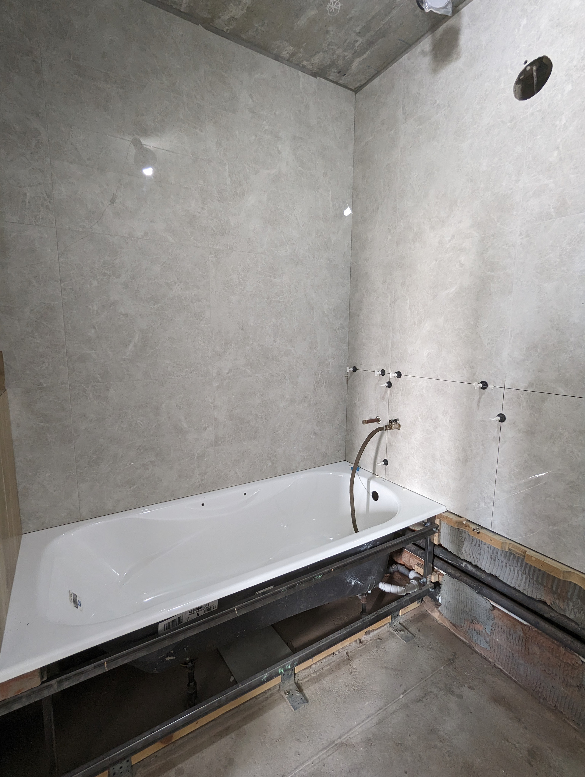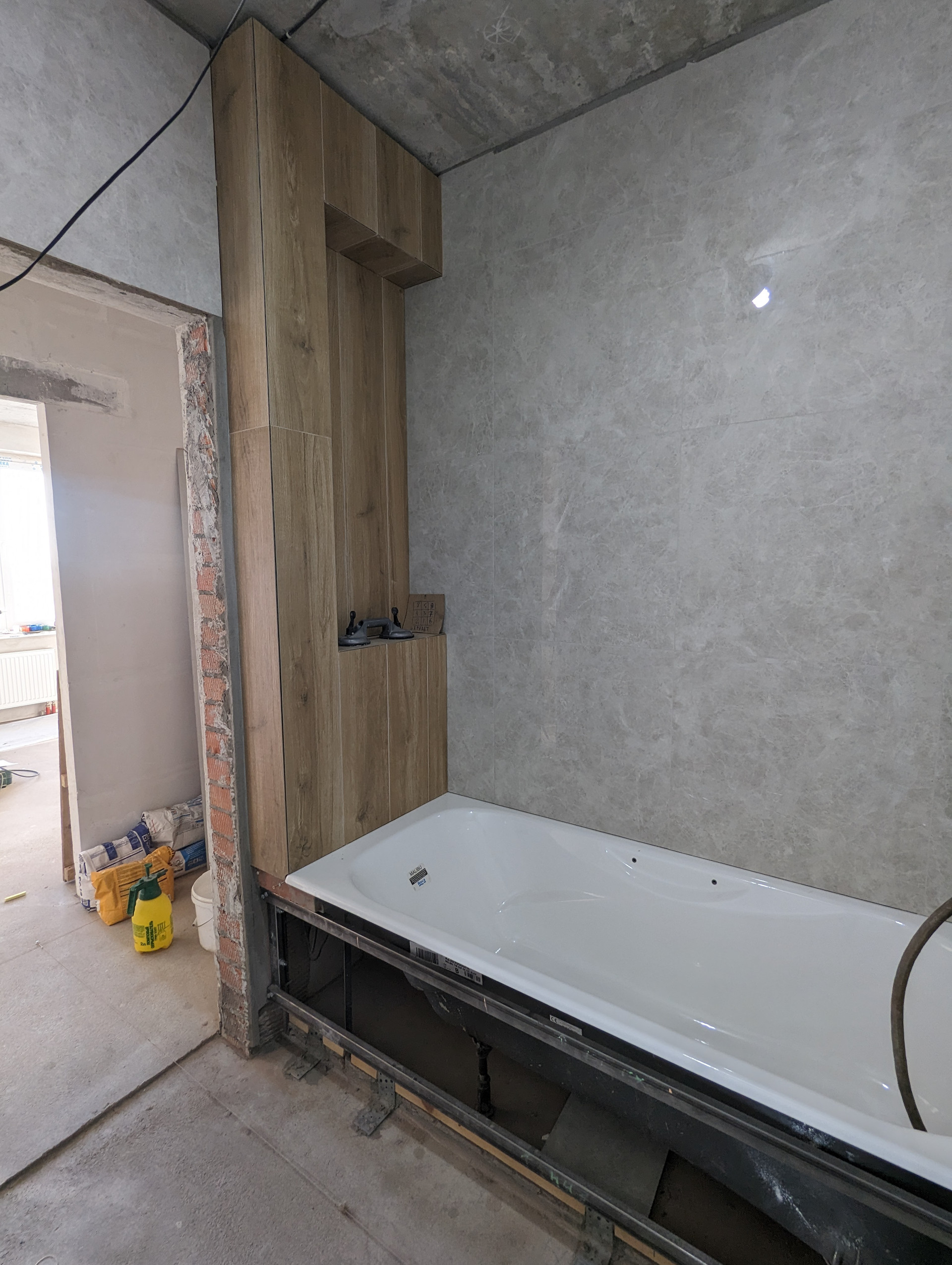 + Готовность большого санузла 80%. Делал профессионал.  Правильно установлена испанская чугунная ванна Roca. Никаких силиконов, плитка заходит на ванну, плесень и подтекания исключены. Плитка Laparet, вся закуплена. Дальнейший ремонт приостановлен, так как пол планируется в одном уровне и сначала нужно сделать пол в комнатах.