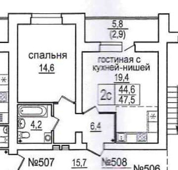 Просторная 2-ком. студия 47,5 кв.м., кухня-гостинная 19,4 кв.м. и спальня 14,6 кв.м. Высота потолка - 2,7 м. В кухне-гостиной удобно отделена зона кухни от зоны отдыха, заниженный подоконник дает больше естественного света в комнате. Лоджия 5,8 кв.м остеклена алюминиевыми витражами, стены оформлены декоративной штукатуркой.