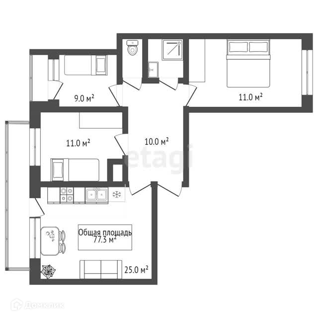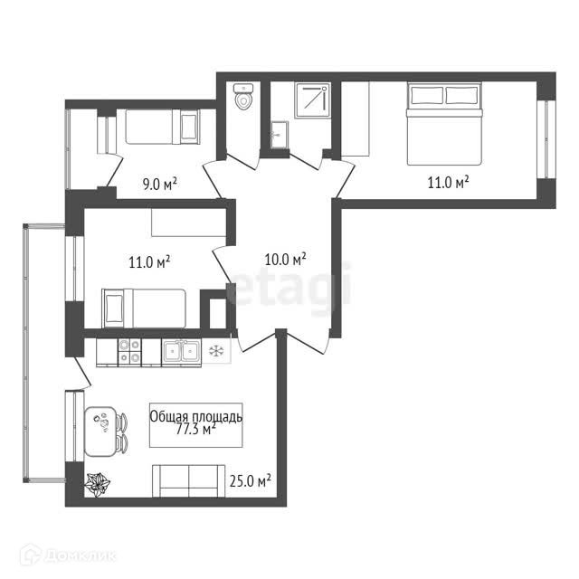 Общая площадь 77.3 м2