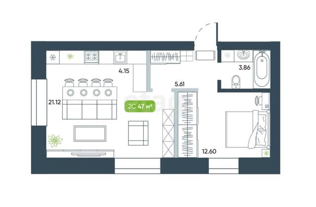 Общая площадь 47.3 м2