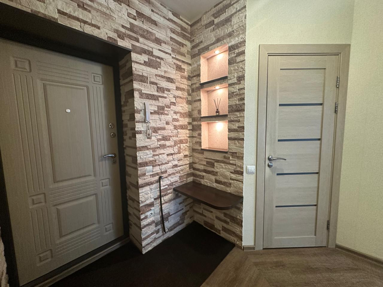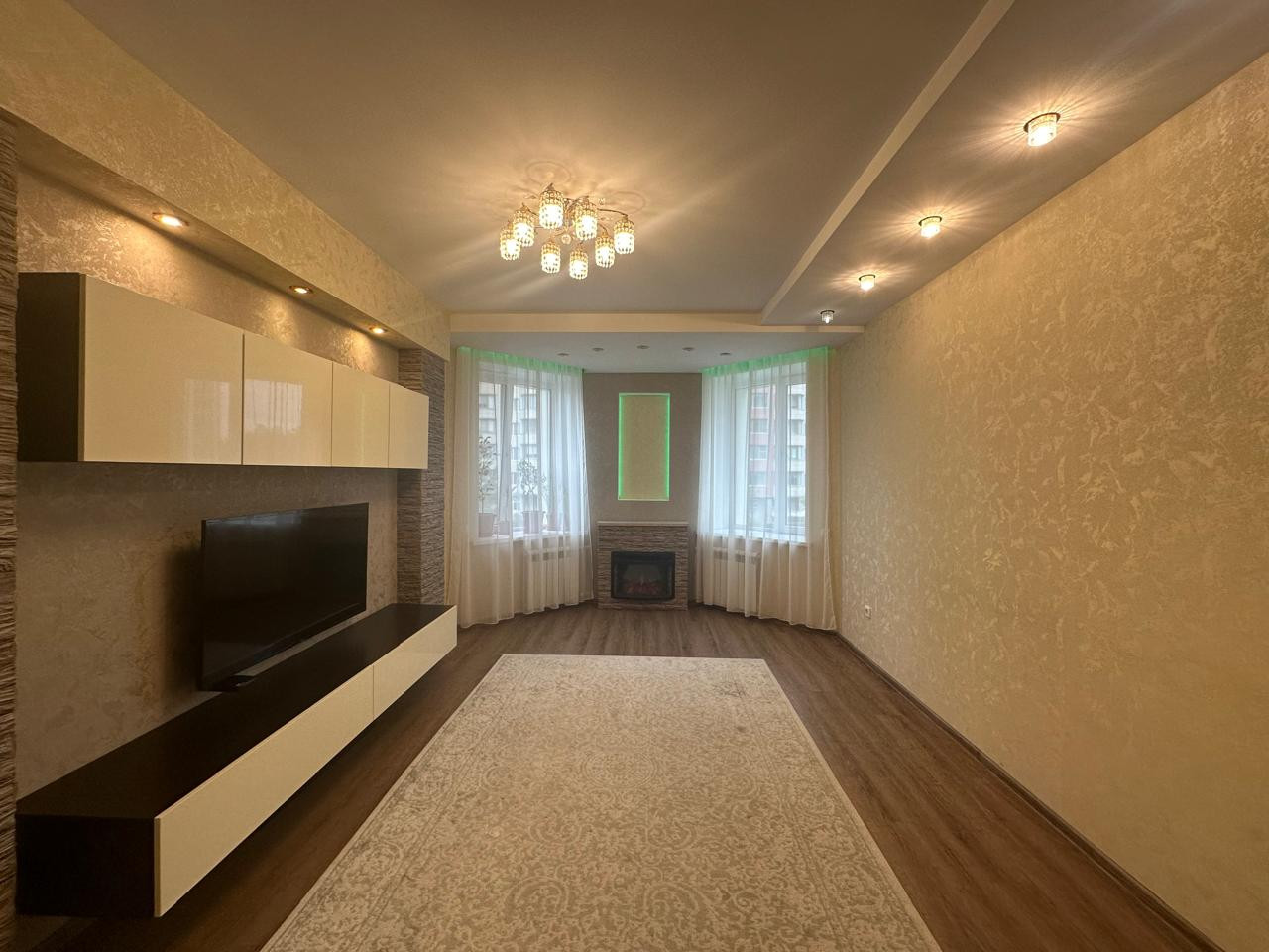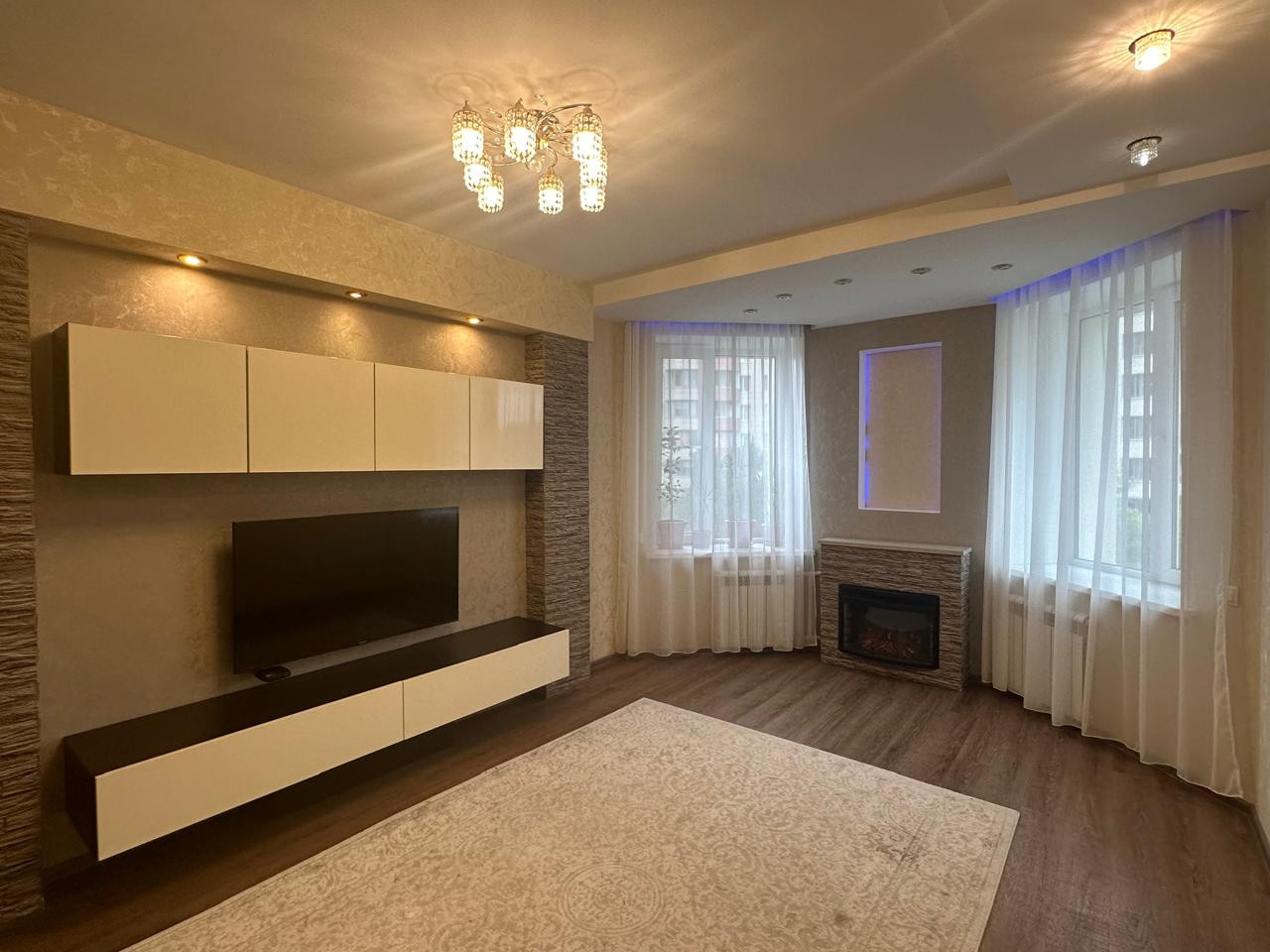 Квартира в отличном состоянии, ничего делать не нужно, "ЗАХОДИ и ЖИВИ". Ремонт делали для себя,все продумано, много дополнительного света. Дополняет интерьер гостиной электрокамин, который можно использовать и как элемент декора, а можно и обогреть комнату. В санузле сделан теплый пол, эксклюзивное зеркало на заказ во всю комнату, столешница под камень.
