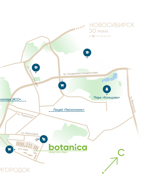 Непосредственная близость к инфраструктуре наукограда создает для юных жителей квартала-парка уникальную возможность обучения и развития рядом с домом. На территории квартала-парка будут работать: детский сад , магазин . На расстоянии 1 км находятся: престижное учебное заведение «Лицей Технополис» , Биотехнопарк Новосибирской области.