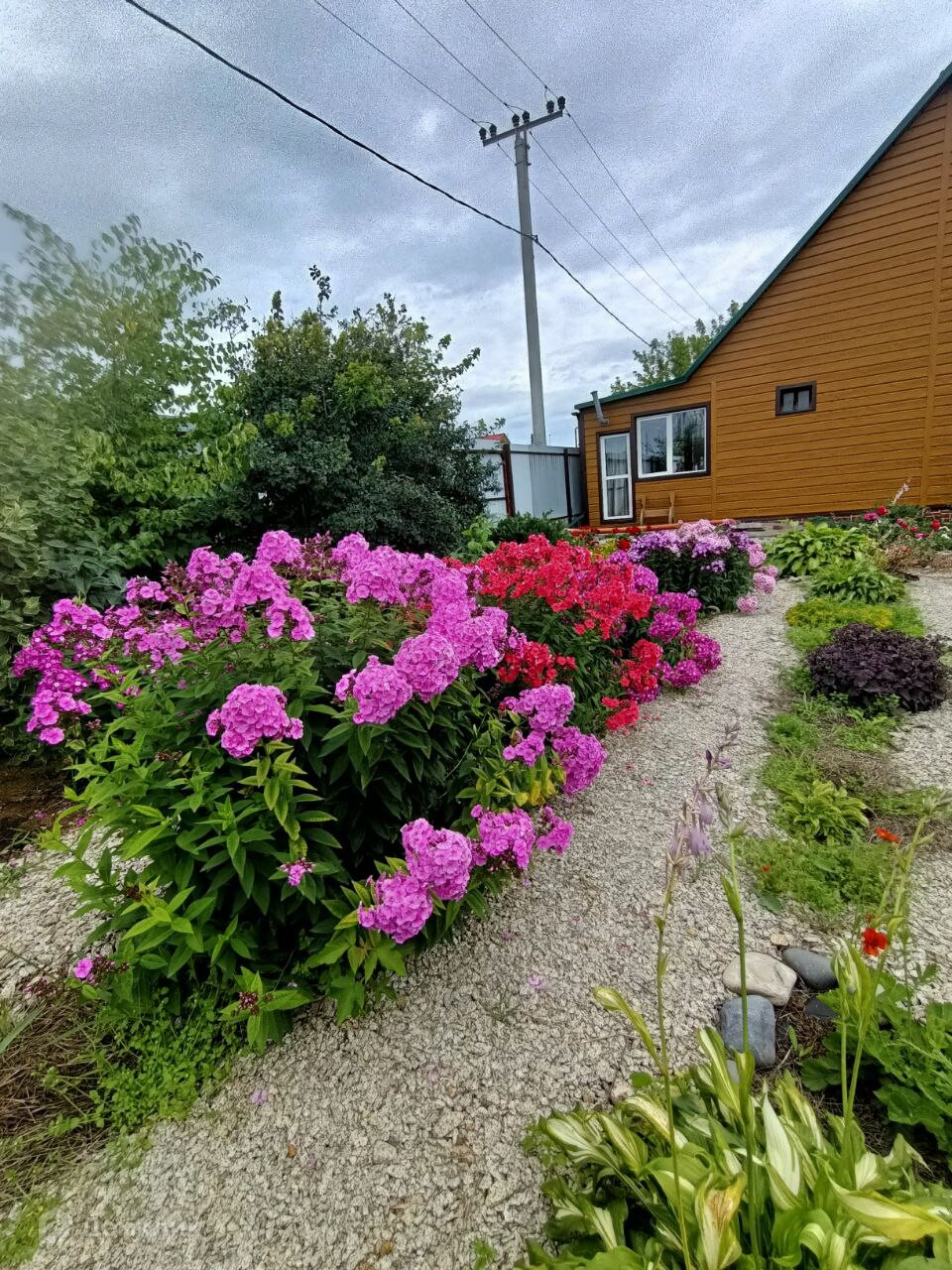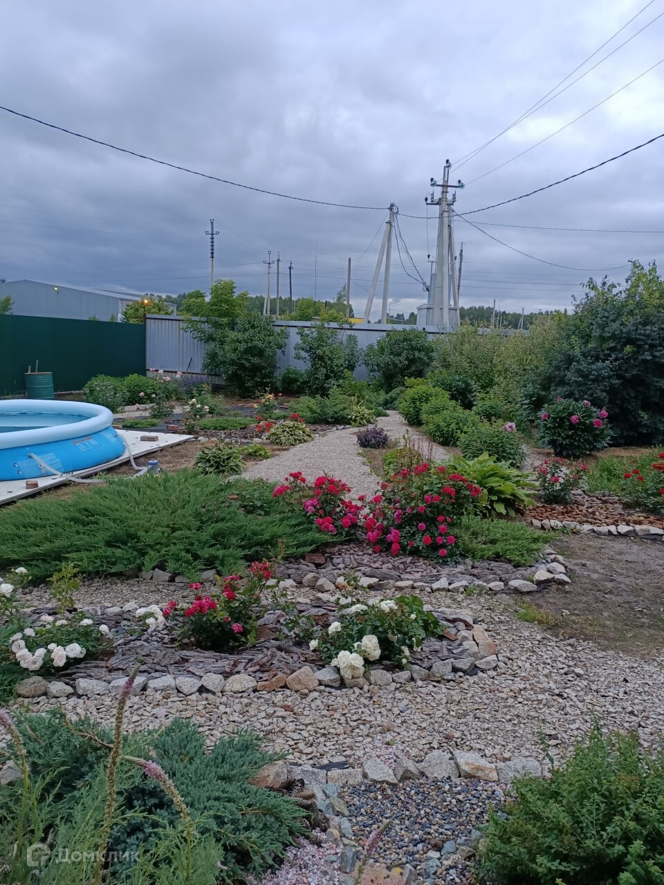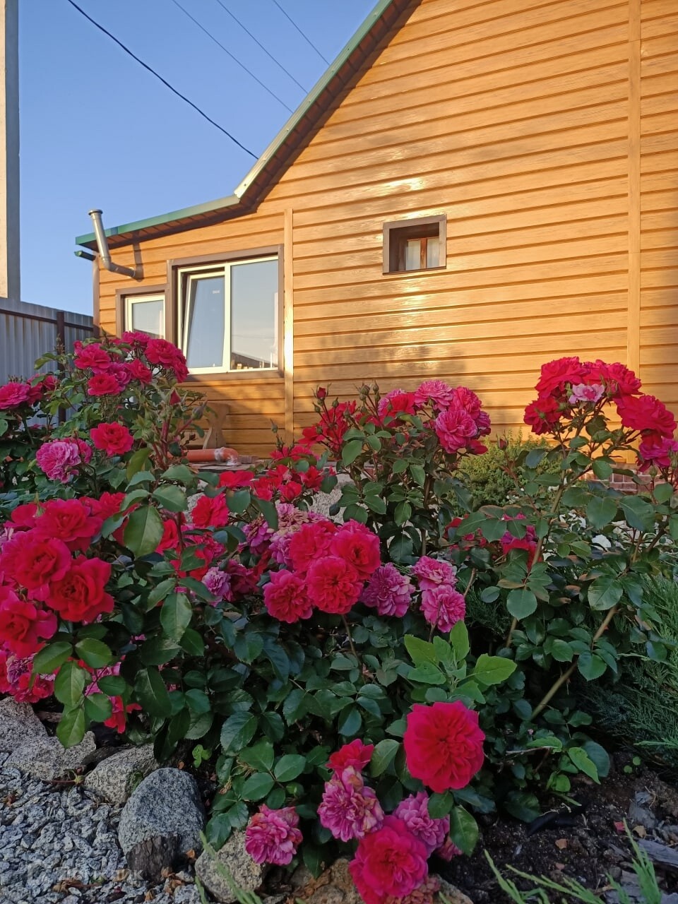 В огороде есть теплица, две яблони, сортовая малина и клубника, крыжовник, смородина. Также шикарные сортовые розы, гортензии, декоративные кустарники, можжевельник.