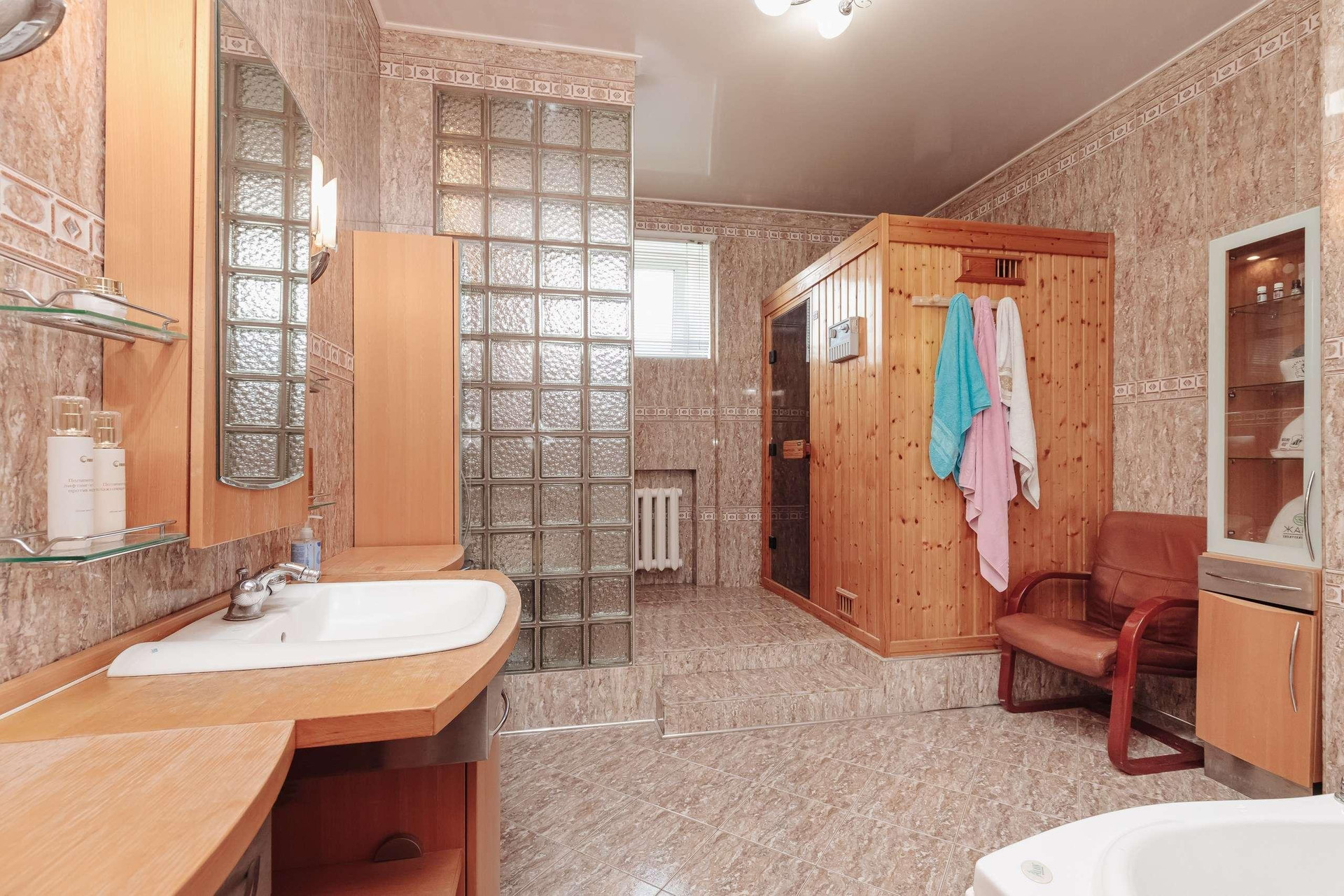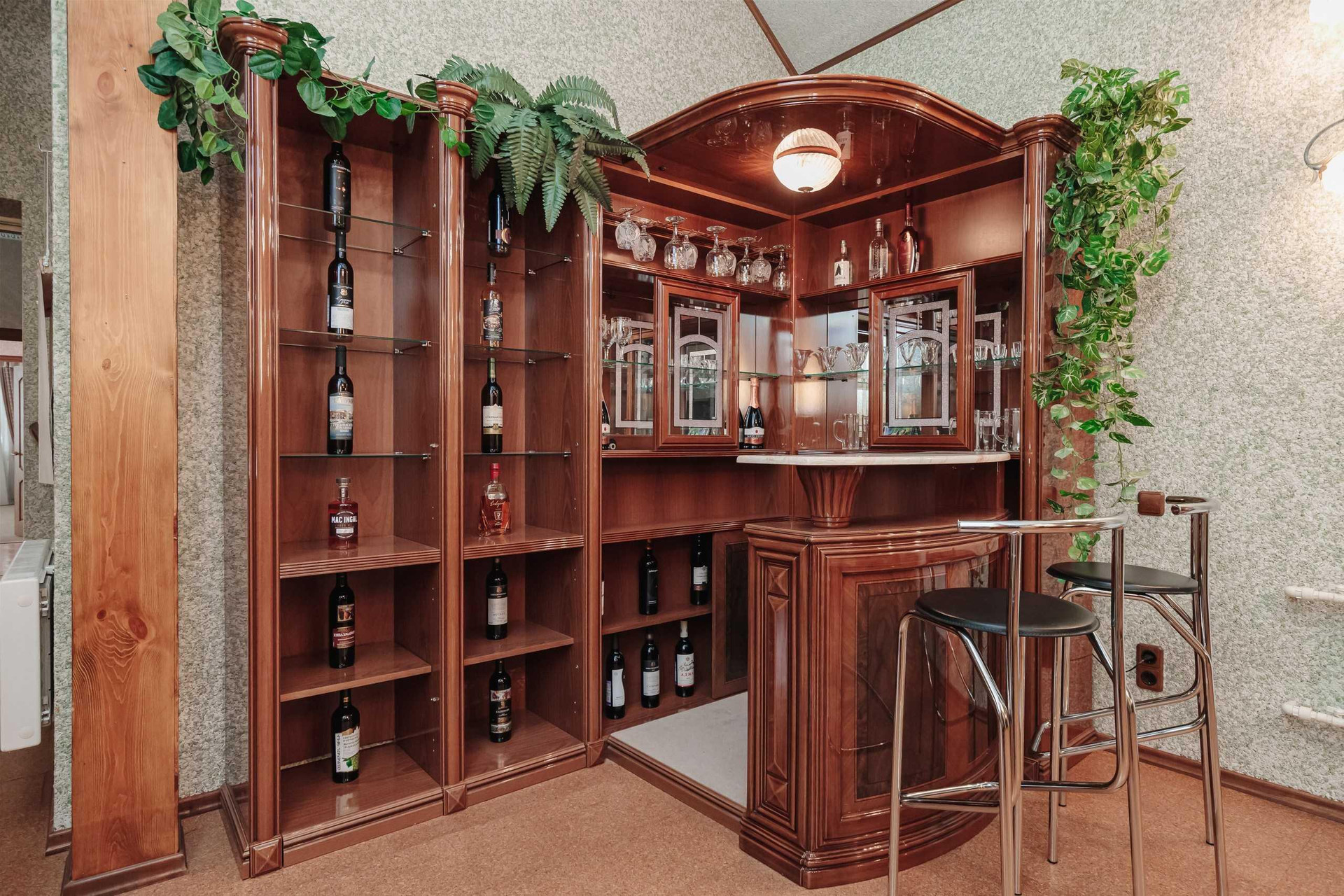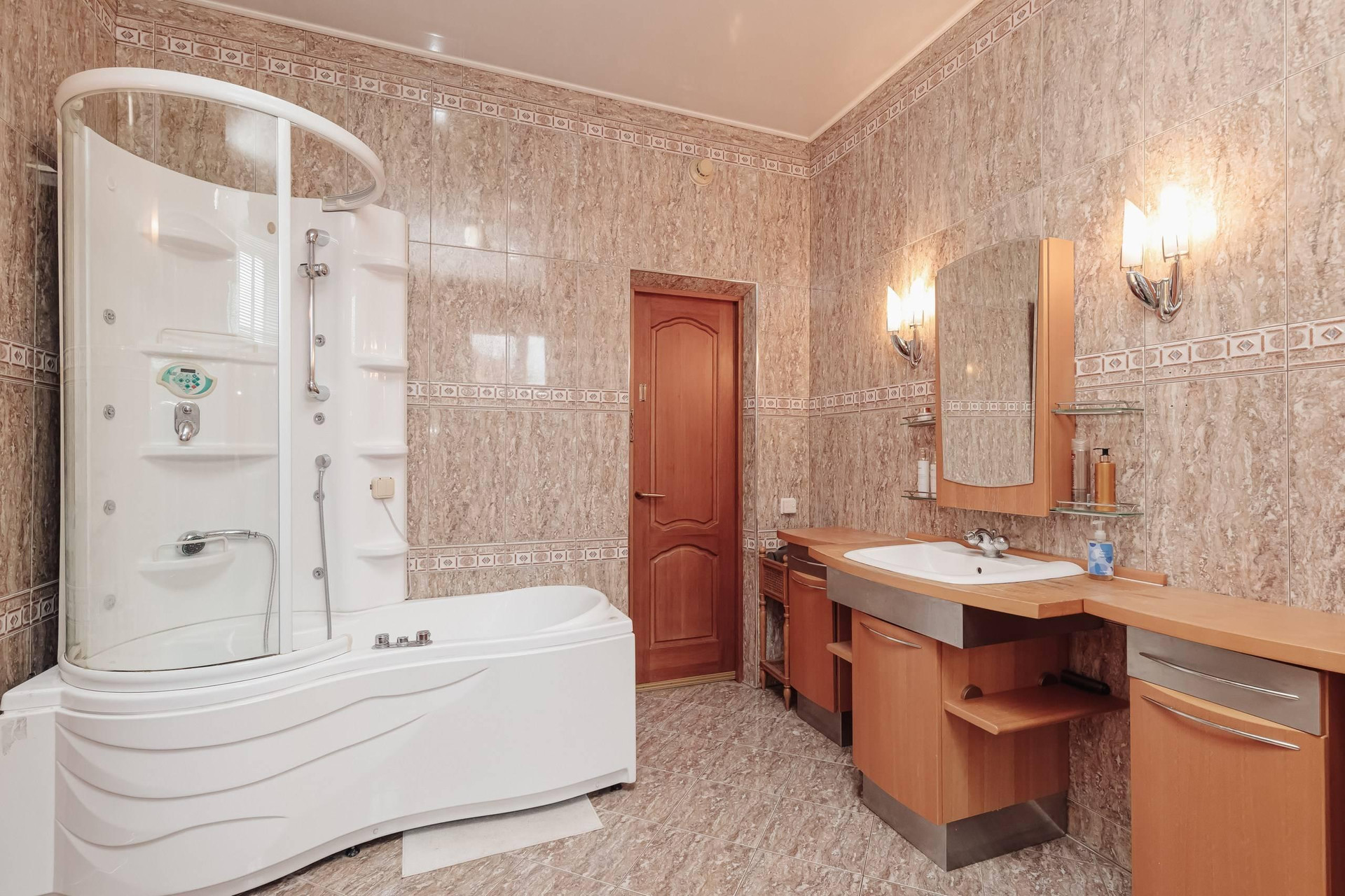 Ремонт выполнен из экологических материалов, привезенных из Арабских Эмиратов. Натуральный камень, дерево, моющиемя обои, на полу постелено высококачественное пробковое покрытие, в санузлах установлена сантехника класса люкс.