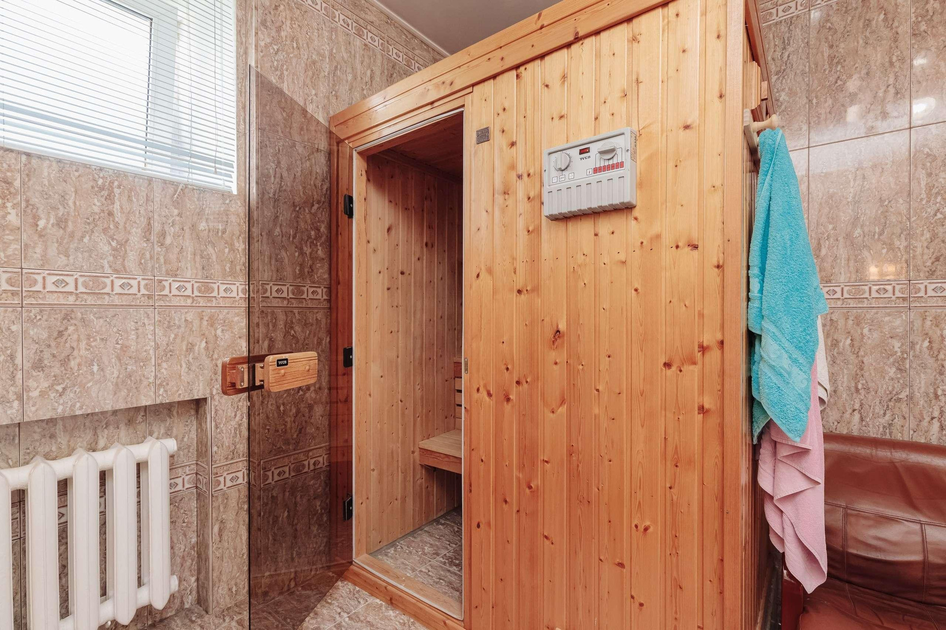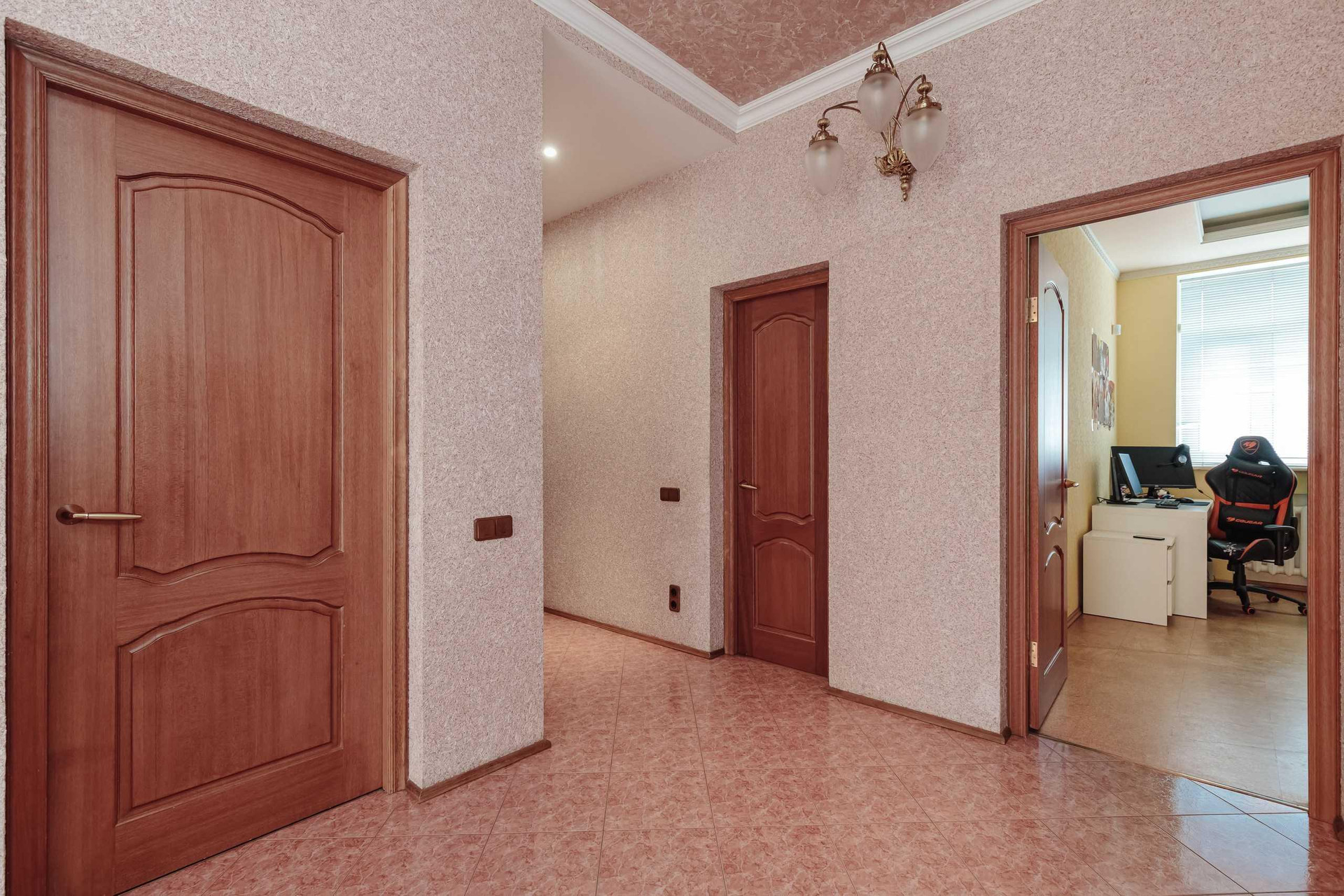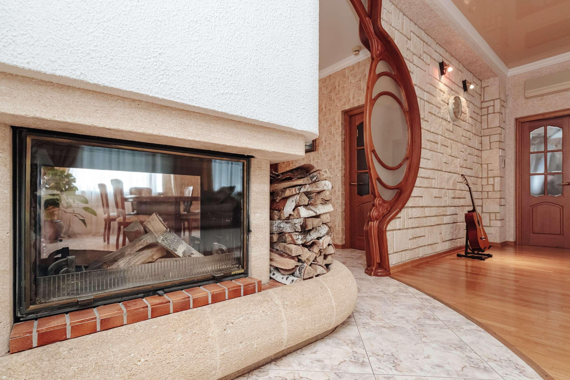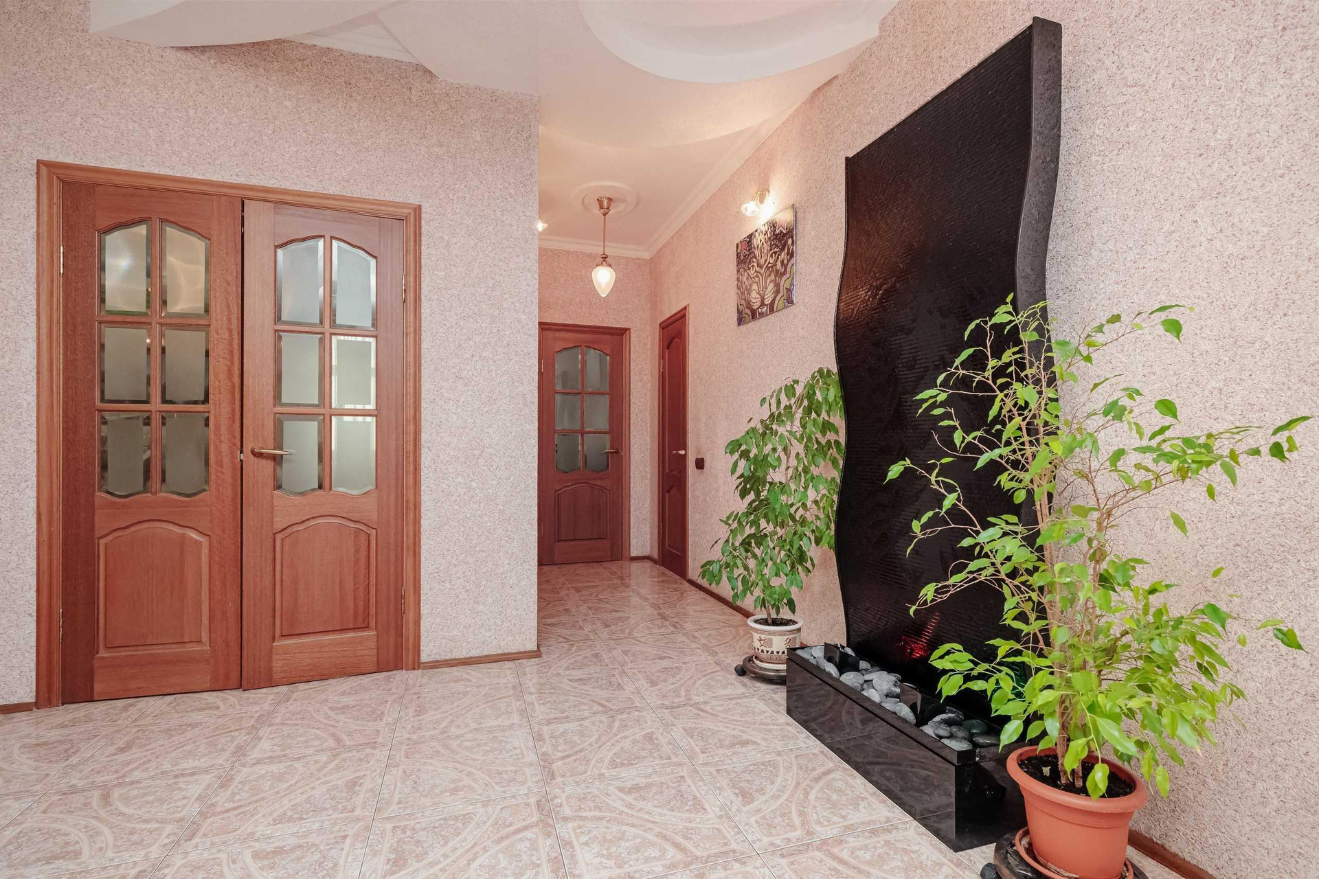 Ремонт выполнен из экологических материалов, привезенных из Арабских Эмиратов. Натуральный камень, дерево, моющиемя обои, на полу постелено высококачественное пробковое покрытие, в санузлах установлена сантехника класса люкс.