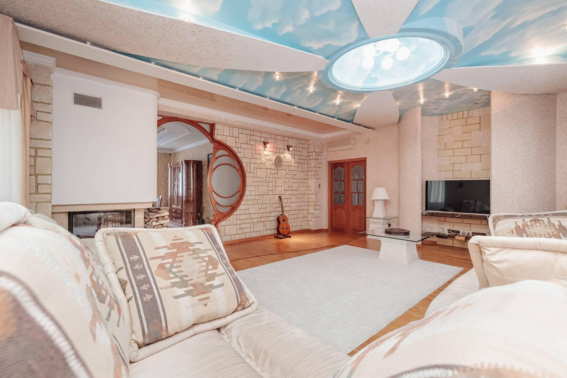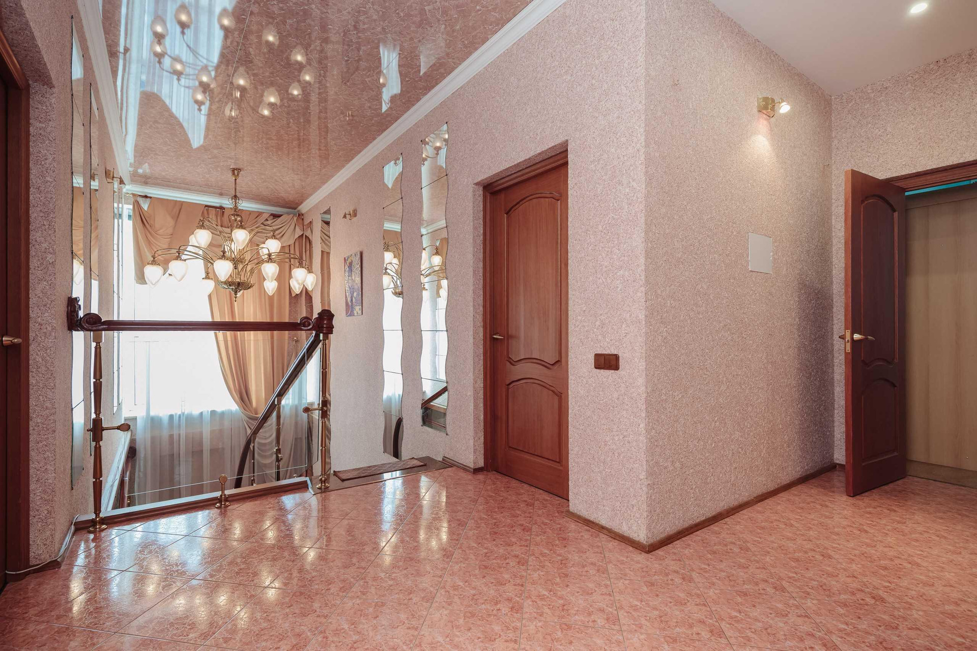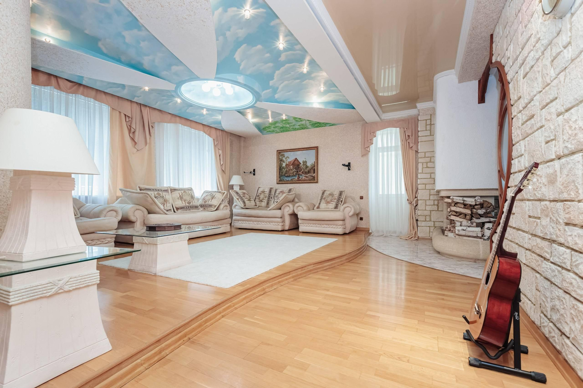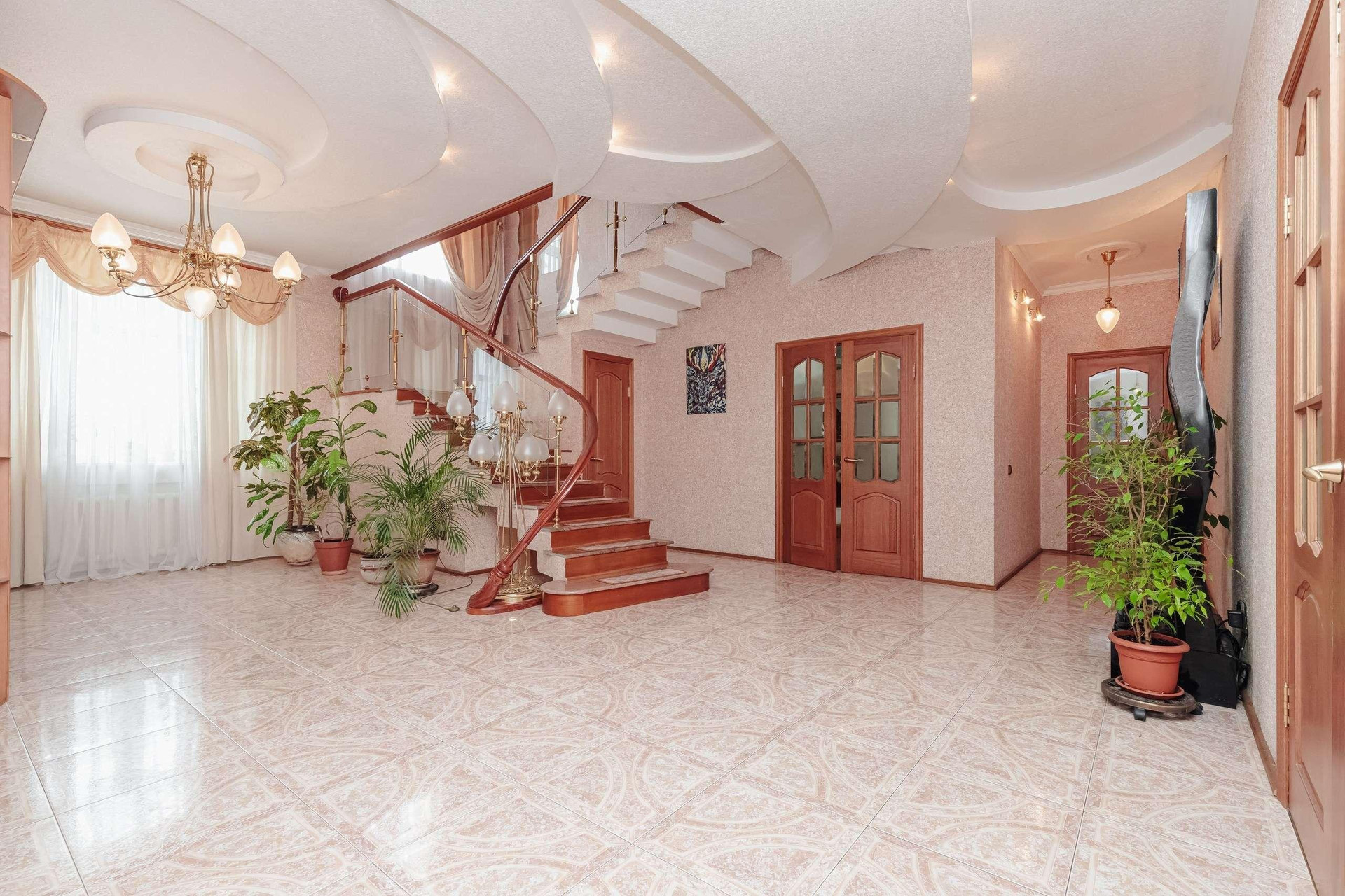 В квартире 2 этажа ( 4й и 5й этажи в подъезде): на первом этаже располагаются гостиная с натуральным камином с живым огнём, столовая, просторная кухня, санузел с электросауной на 2 человек (в которой можно париться с веником, аромамаслами), просторный холл и выполненная из натурального камня лестница. Второй этаж включает 2 спальни, 2 рабочих кабинета, бильярдная зона, спортзал, бар, сейфовая, прачечная. На каждом этаже простосторные лоджии с видом на двор, утопающих в зелени, где по утрам поют птицы.