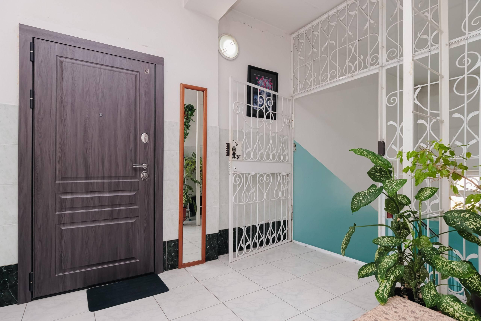 Ни одна из стен квартиры не граничит с соседями. На лестничной площадке расположены 2 квартиры.