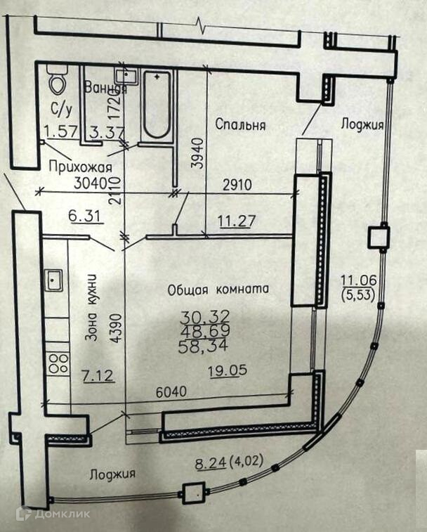 Общая площадь 58 м2