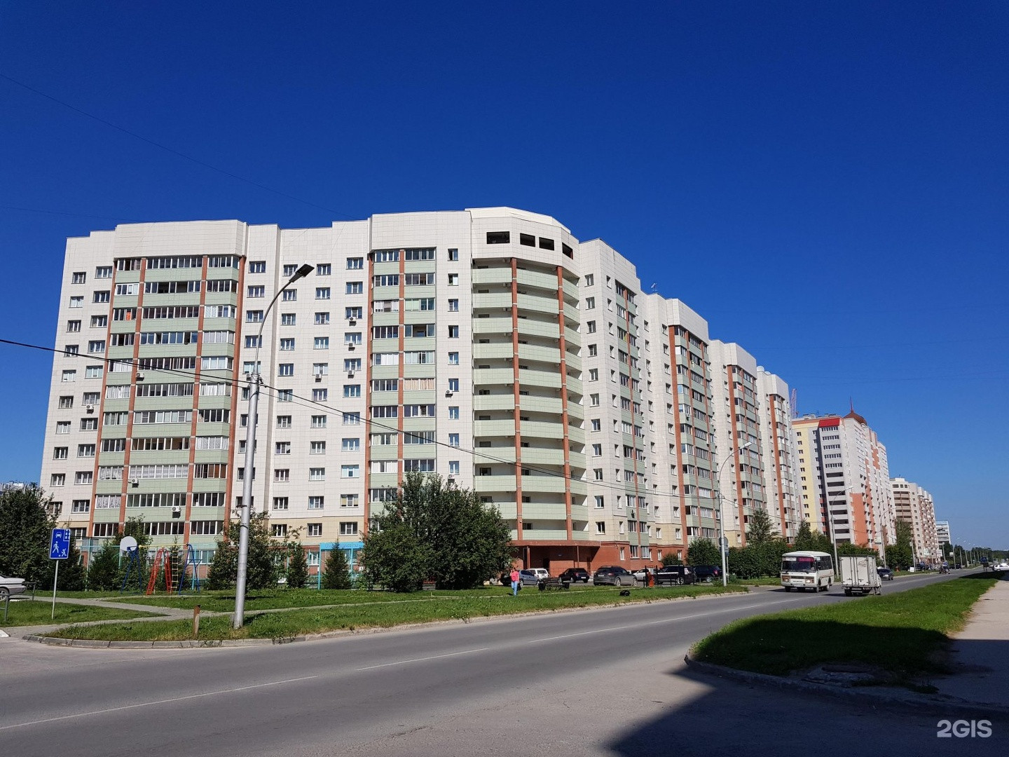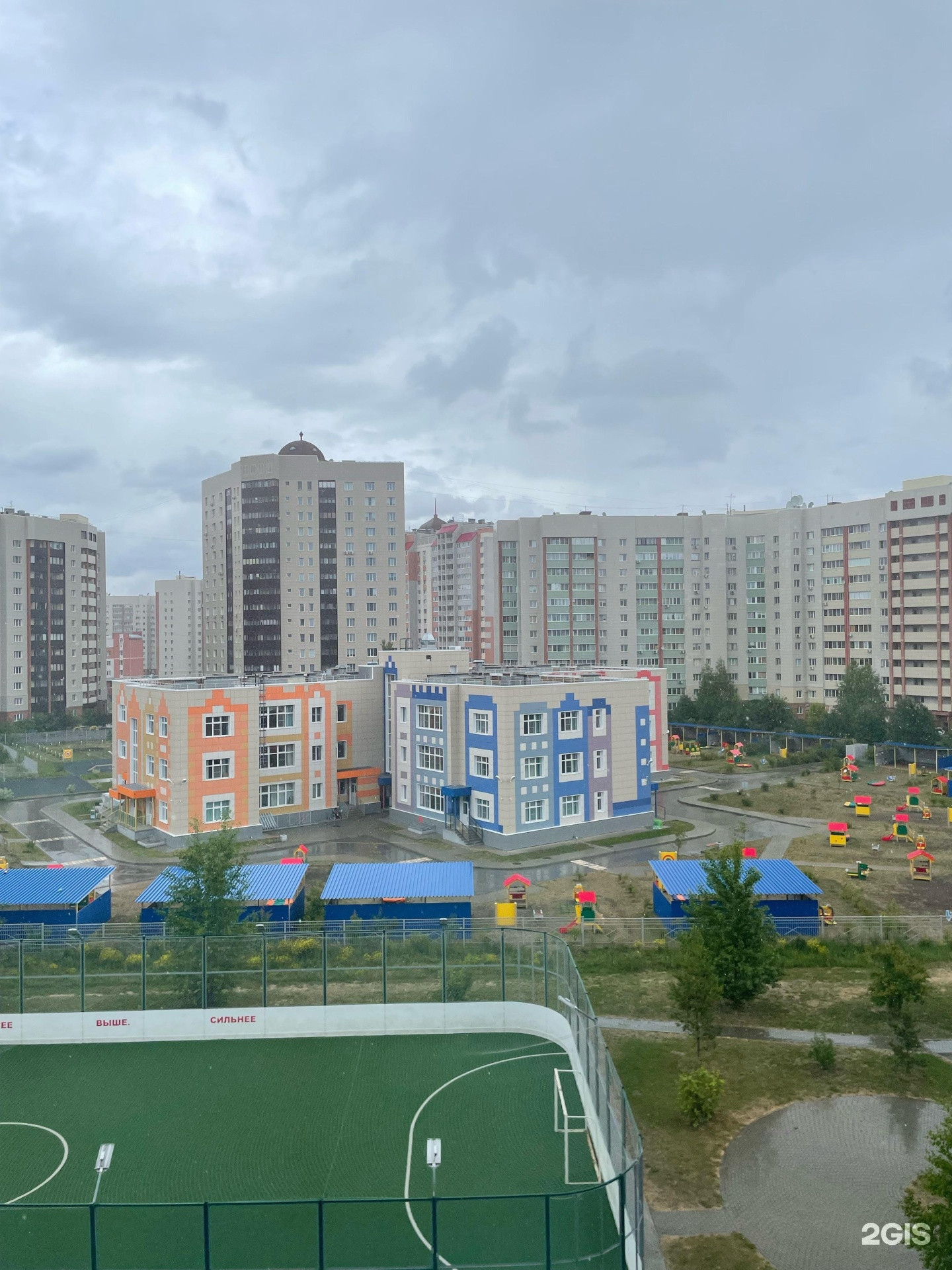 Во дворе современно оборудованная детская площадка, хоккейная коробка, новое баскетбольное поле, уличные тренажеры, зимой-каток, много прогулочных дорожек.