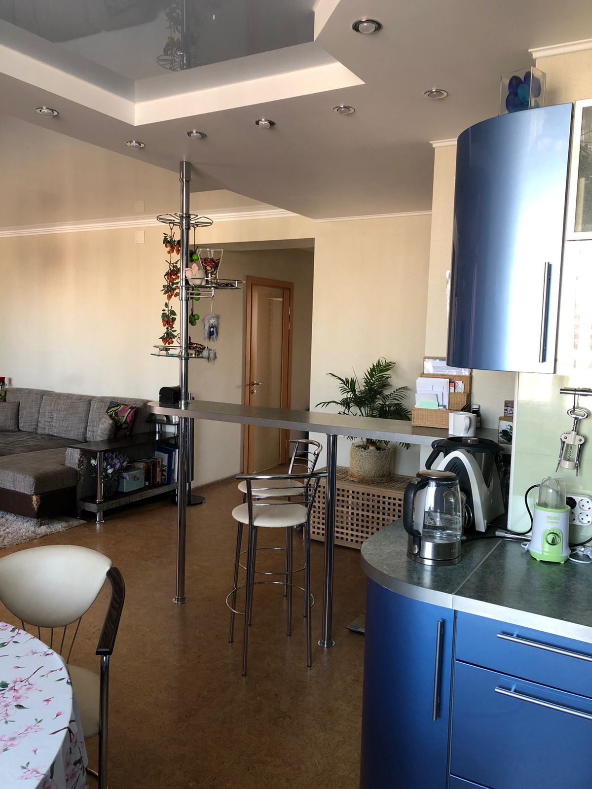 Функциональная кухонная зона с барной стойкой совмещена с гостиной, удобно принимать гостей и проводить время с близкими.