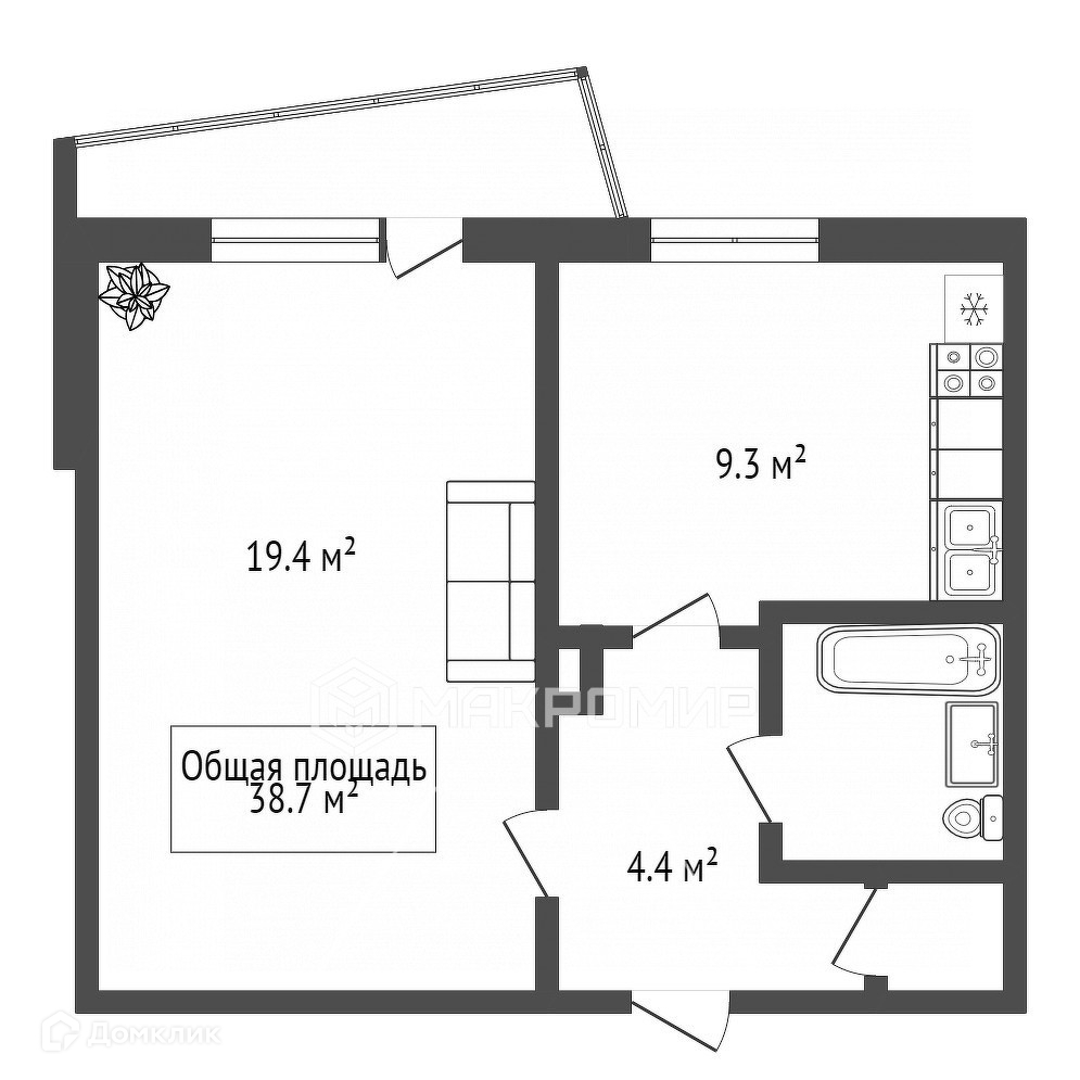Общая площадь 38.7 м2