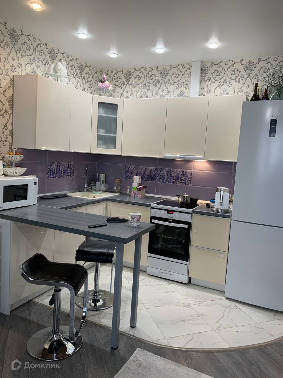 В стоимость квартиры входит: кухонный гарнитур с навесными шкафами и барной стойкой, электрическая плита и вытяжка на кухне.