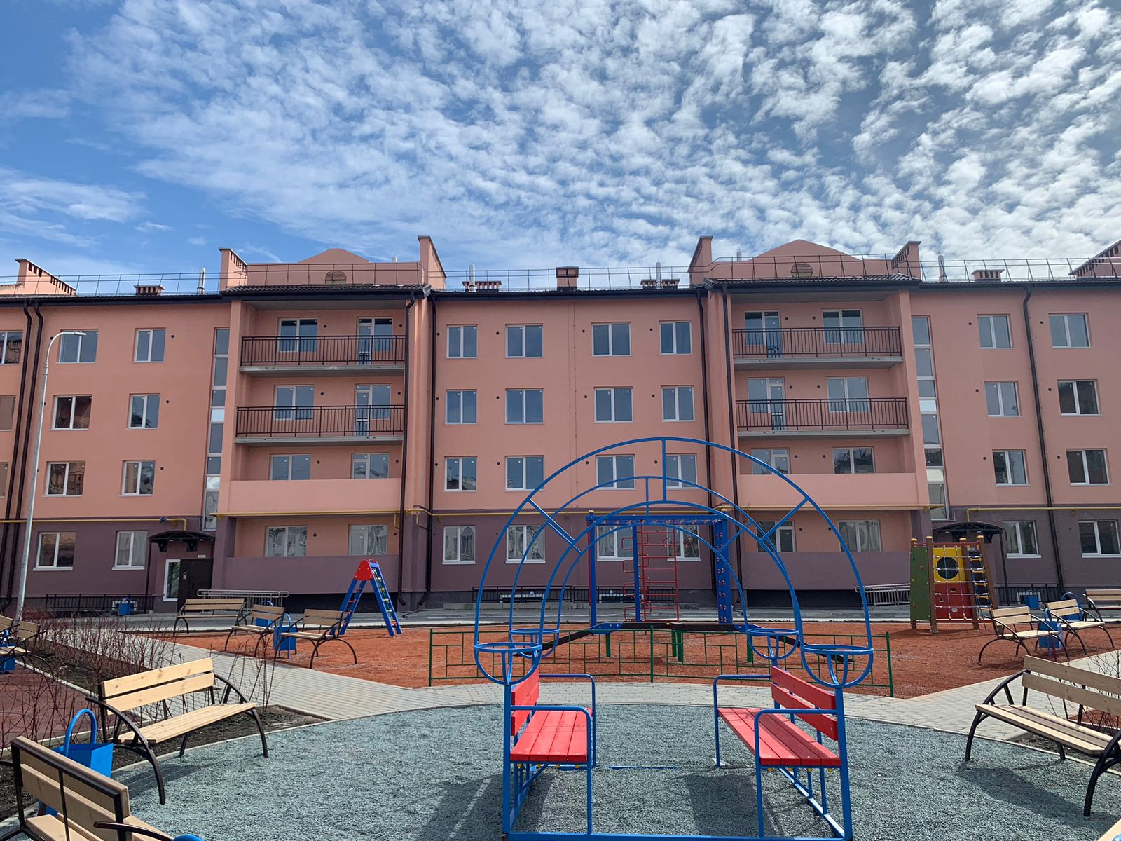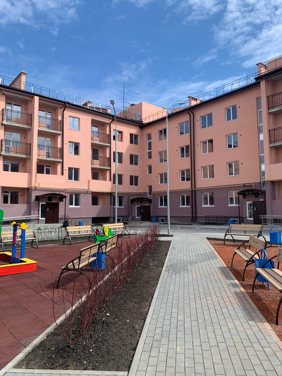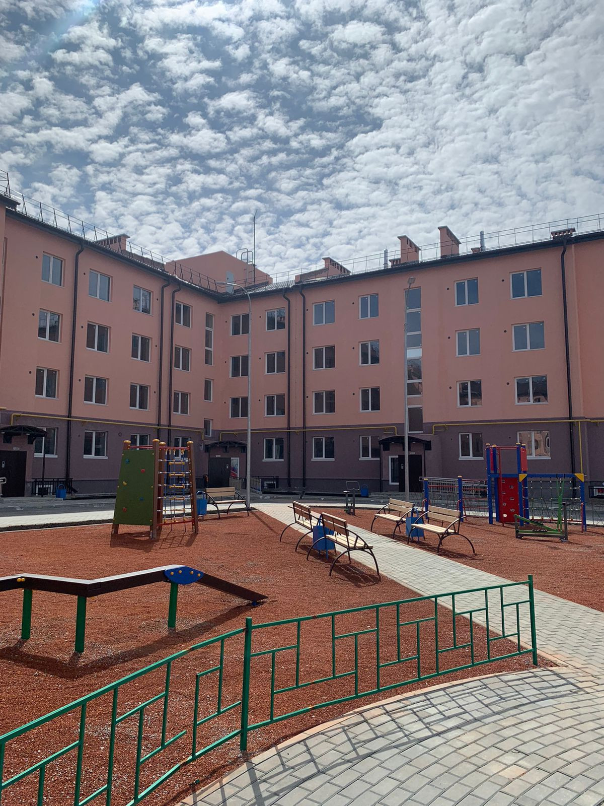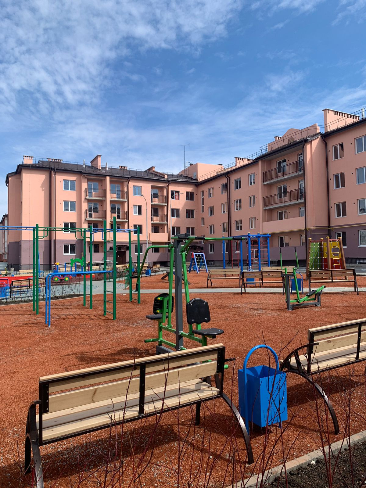 Во дворе детская площадка со спортивными тренажерами.