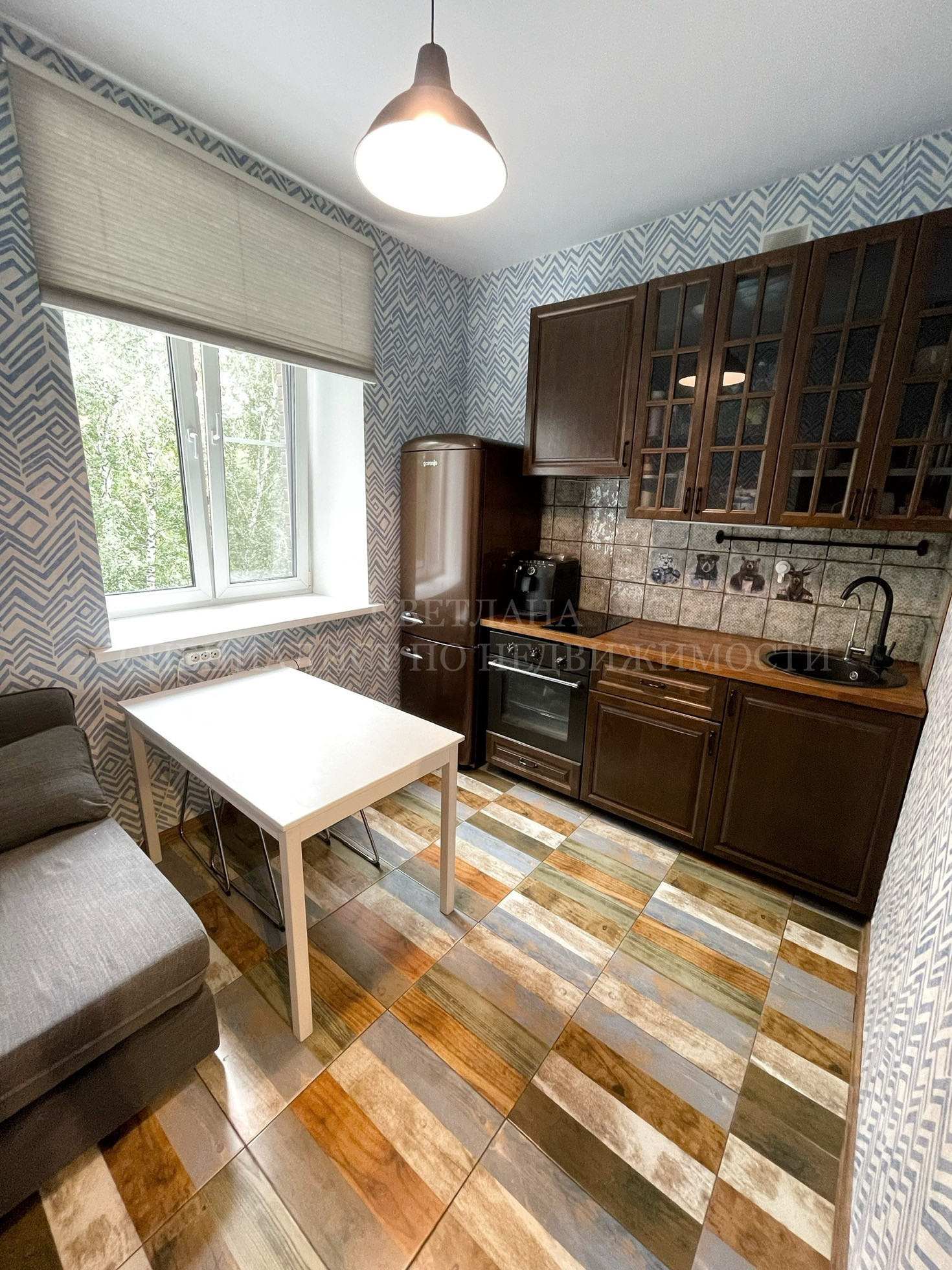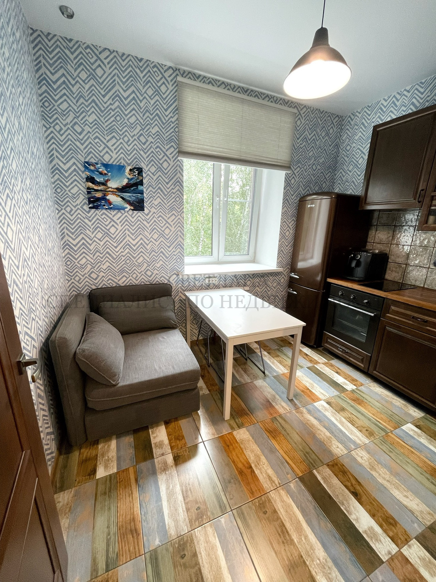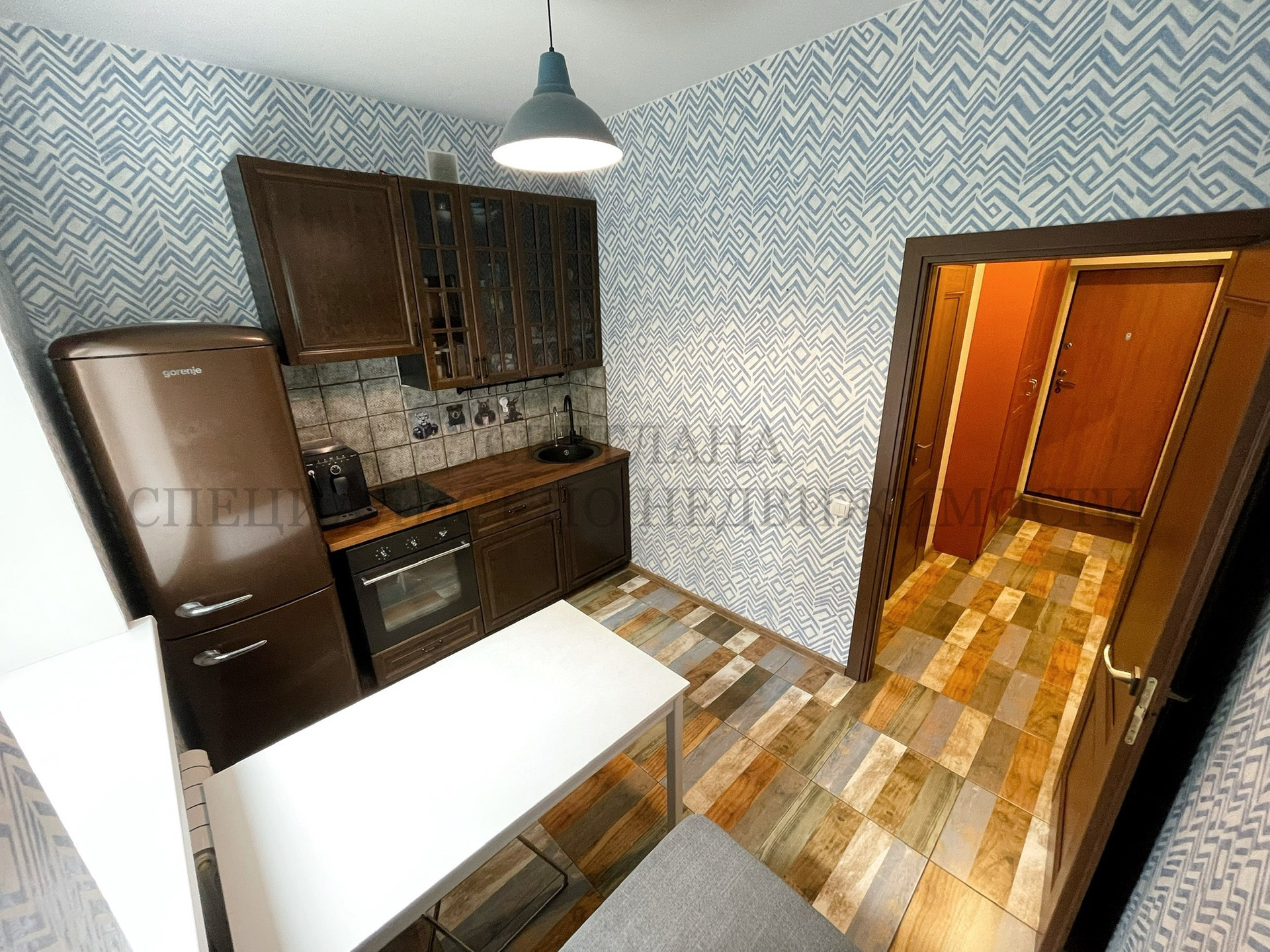 На кухне стильный кухонный гарнитур со встроенной бытовой техникой, который ОСТАЁТСЯ ПОКУПАТЕЛЯМ.