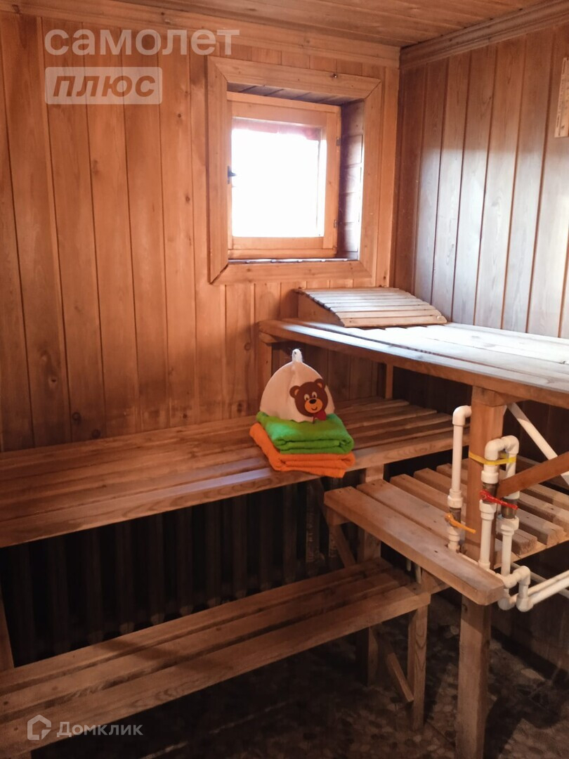 Баня внутри дома, вход с коридора прихожей. Очень удобно. Не нужно выходить на улицу ни в дождь, ни в слякоть. Дровяная железная печь. Камни, привезены с Горного Алтая. Отделка — вагонка из лиственницы.