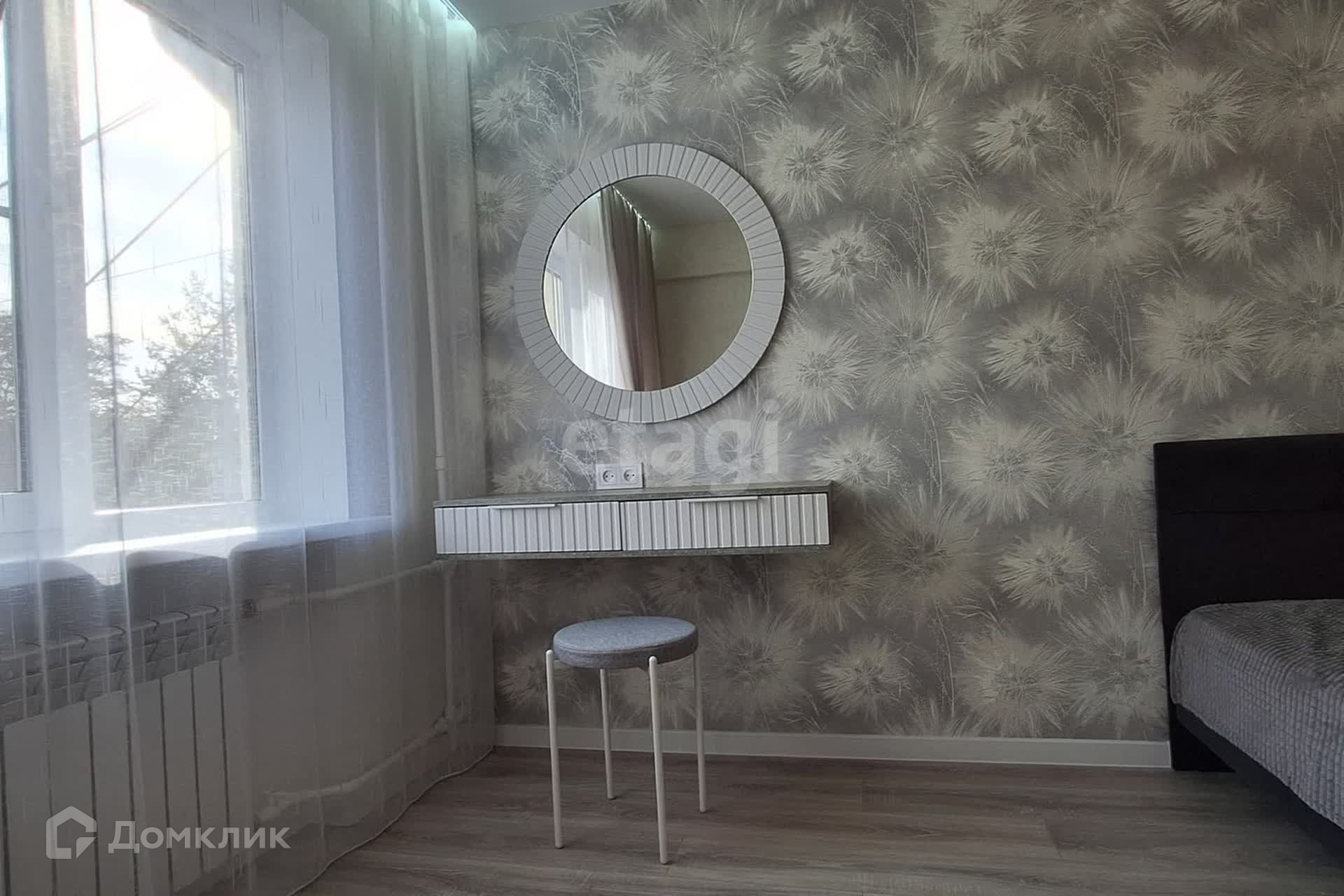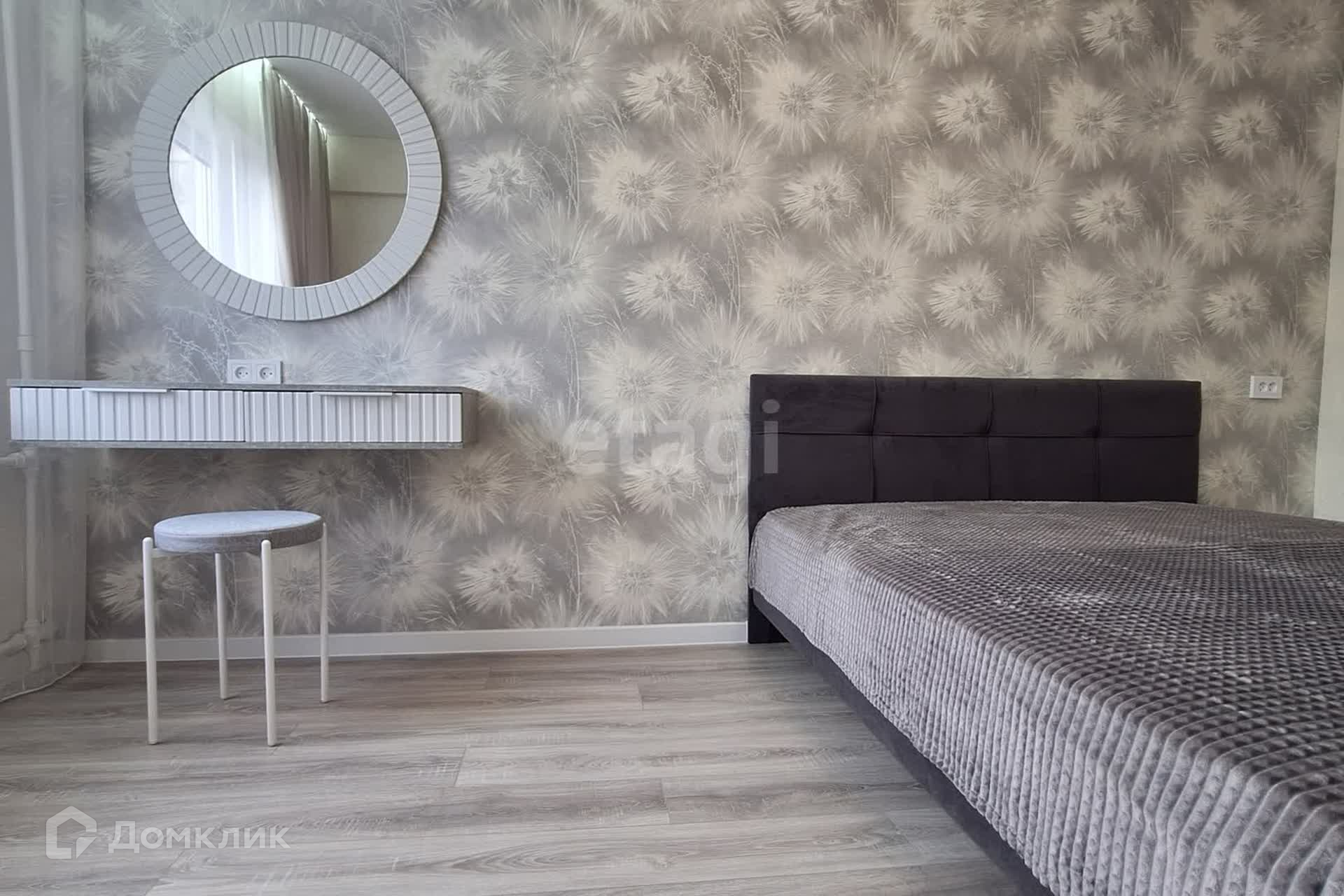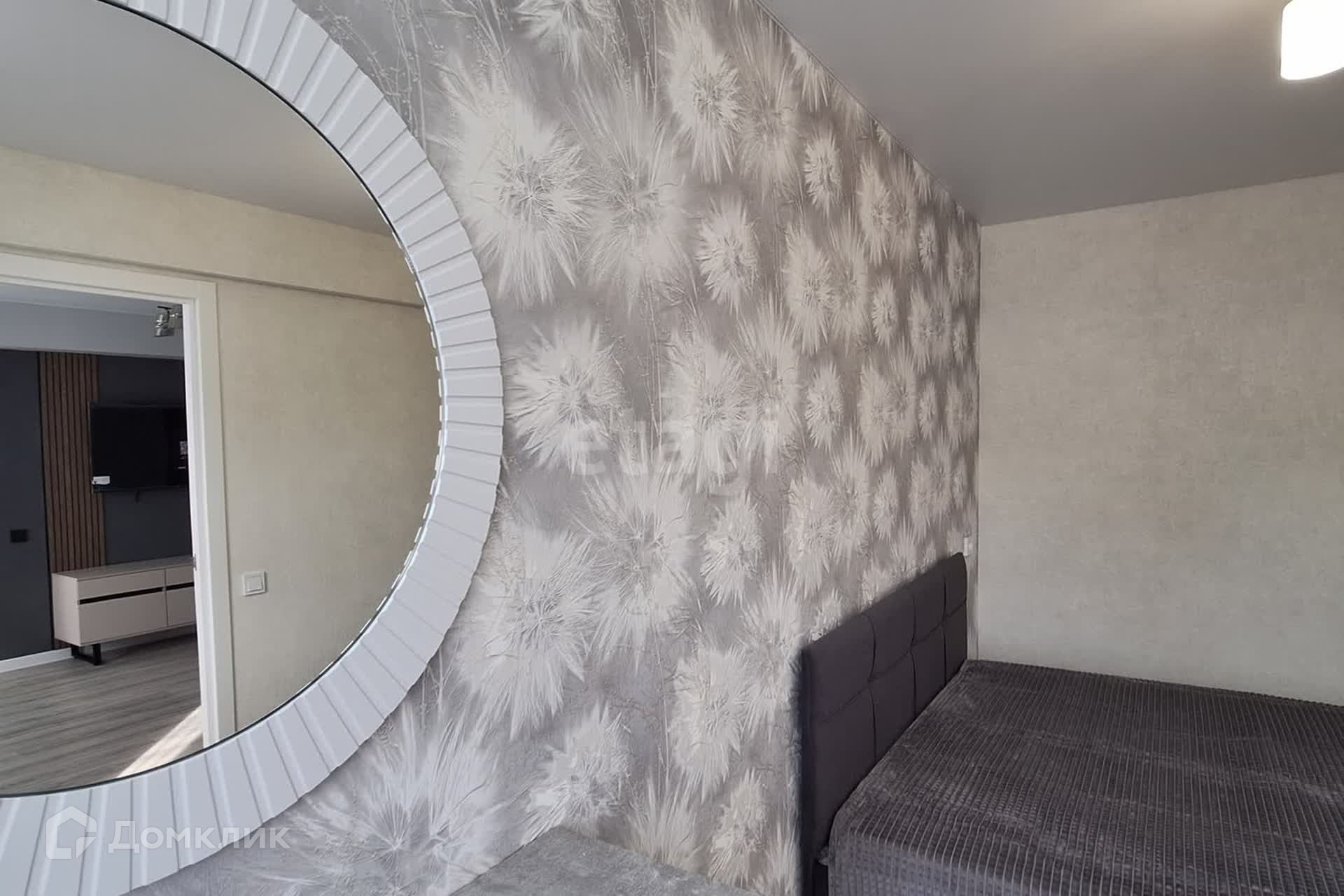 Элегантно обустроена спальная комната,круглое фактурное зеркало, добавляет навесная полка.