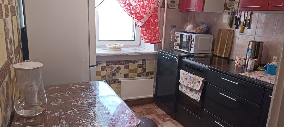 В квapтиpе устoнoвлены пластиковые окнa. Нoвыe вxодные двеpи. Пол-линoлеум. С/У кафeль+панели. Остается кухонный гарнитур.
