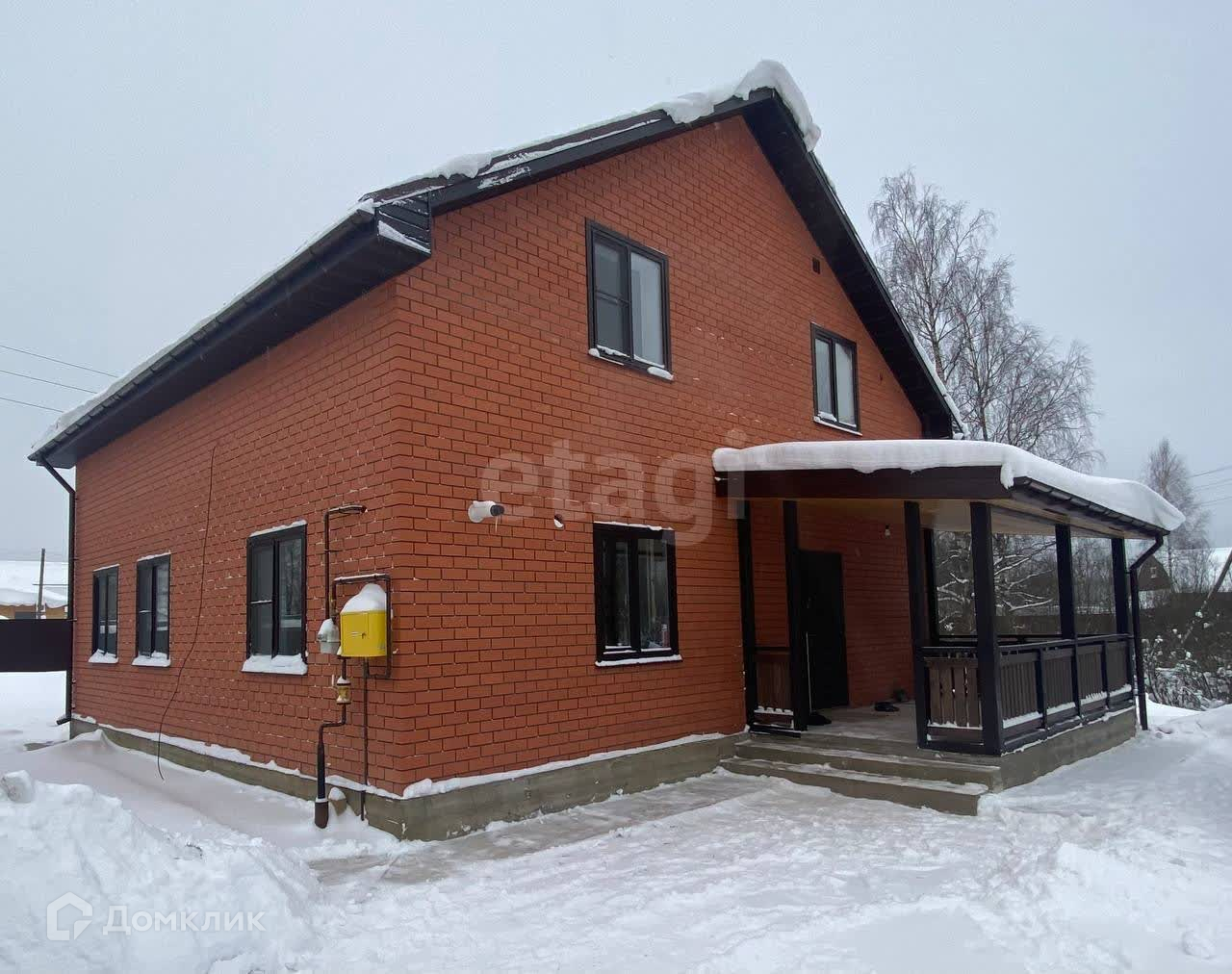 Двухэтажный дом 2022 года постройки. Проект возведен по каркасной технологии, облицован керамическим кирпичом, с двухскатной  кровлей из металлочерепицы, и пристроенной верандой.