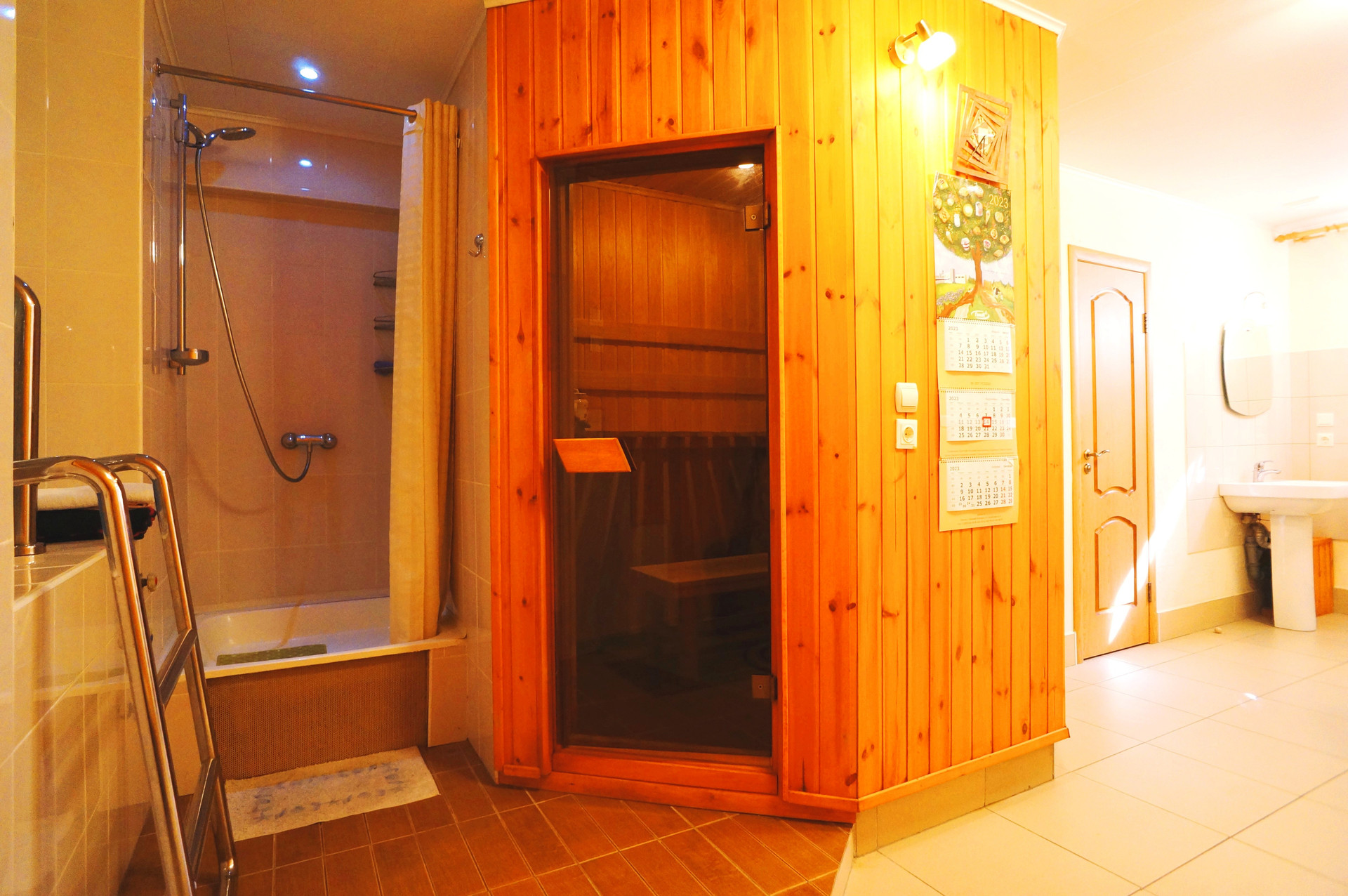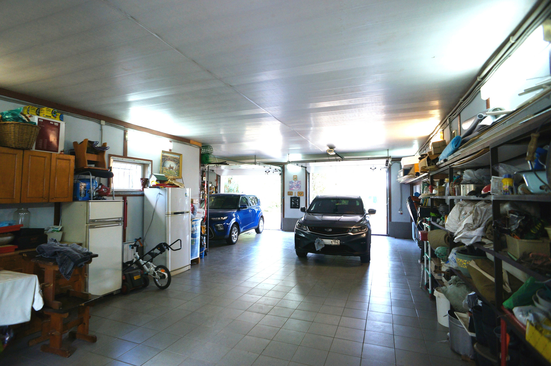 Гараж: Площадь 92,8 м2. Рассчитан на 4 автомобиля. Электрические подъёмные ворота. ГВС (через теплообменник), ХВС, электричество, водоотведение, отопление. Пол в гараже выполнен с уклоном, обеспечивающем слив воды в отдельный септик, позволяющий мыть автомобили.